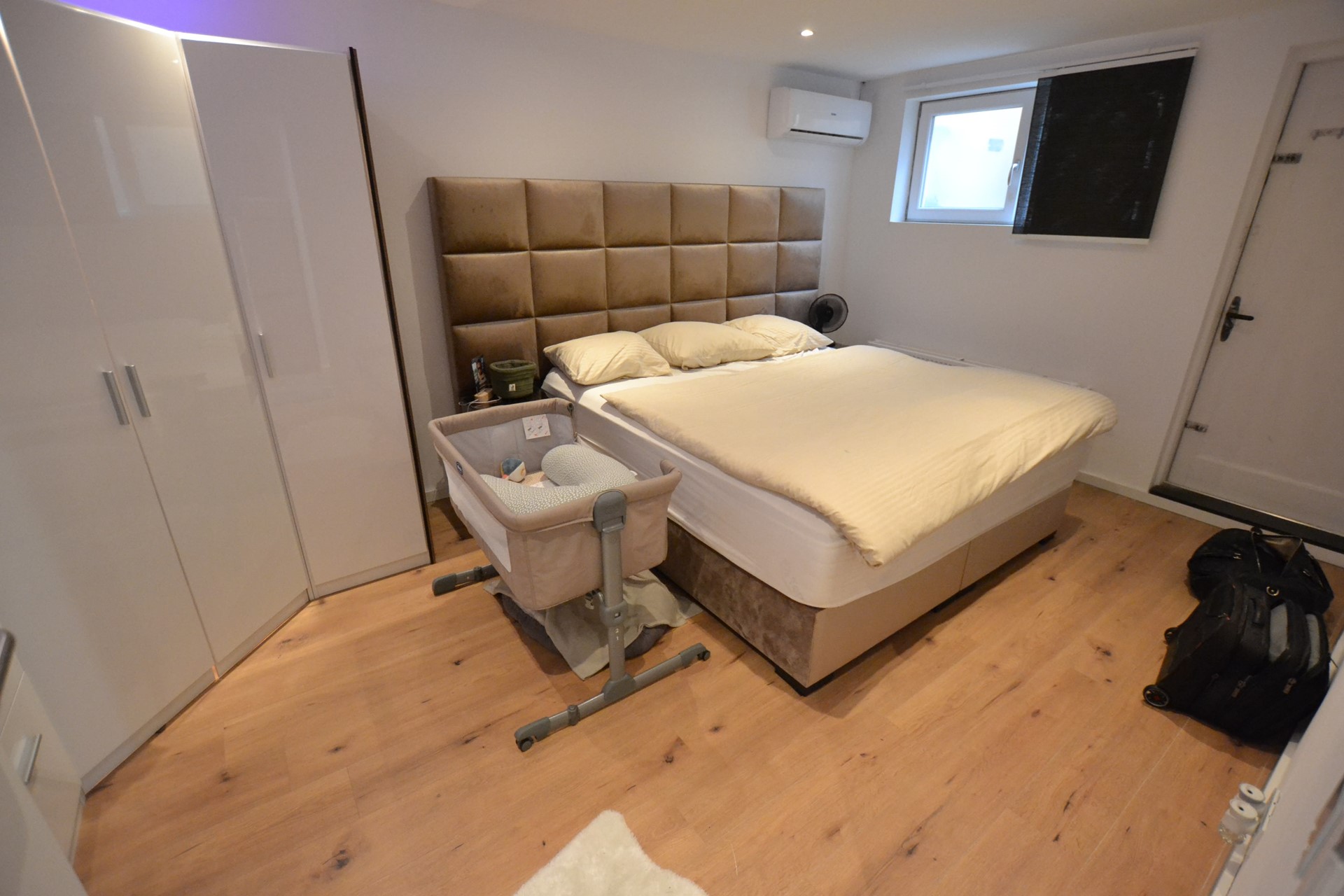 Slaapkamer 4: 4,95 x 3,35 met laminaatvloer, inbouwspots en airco.