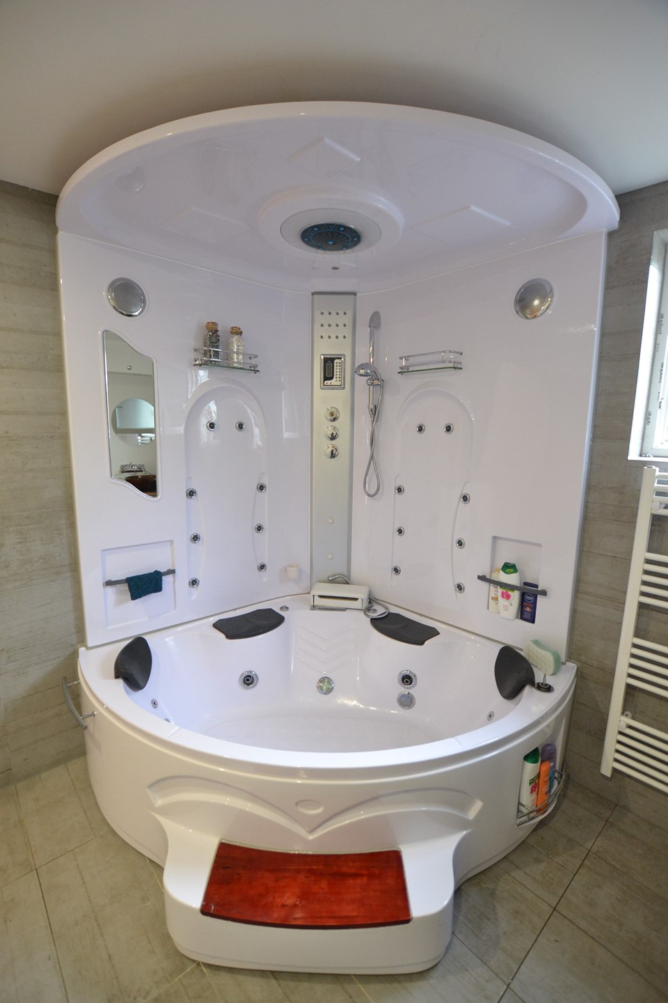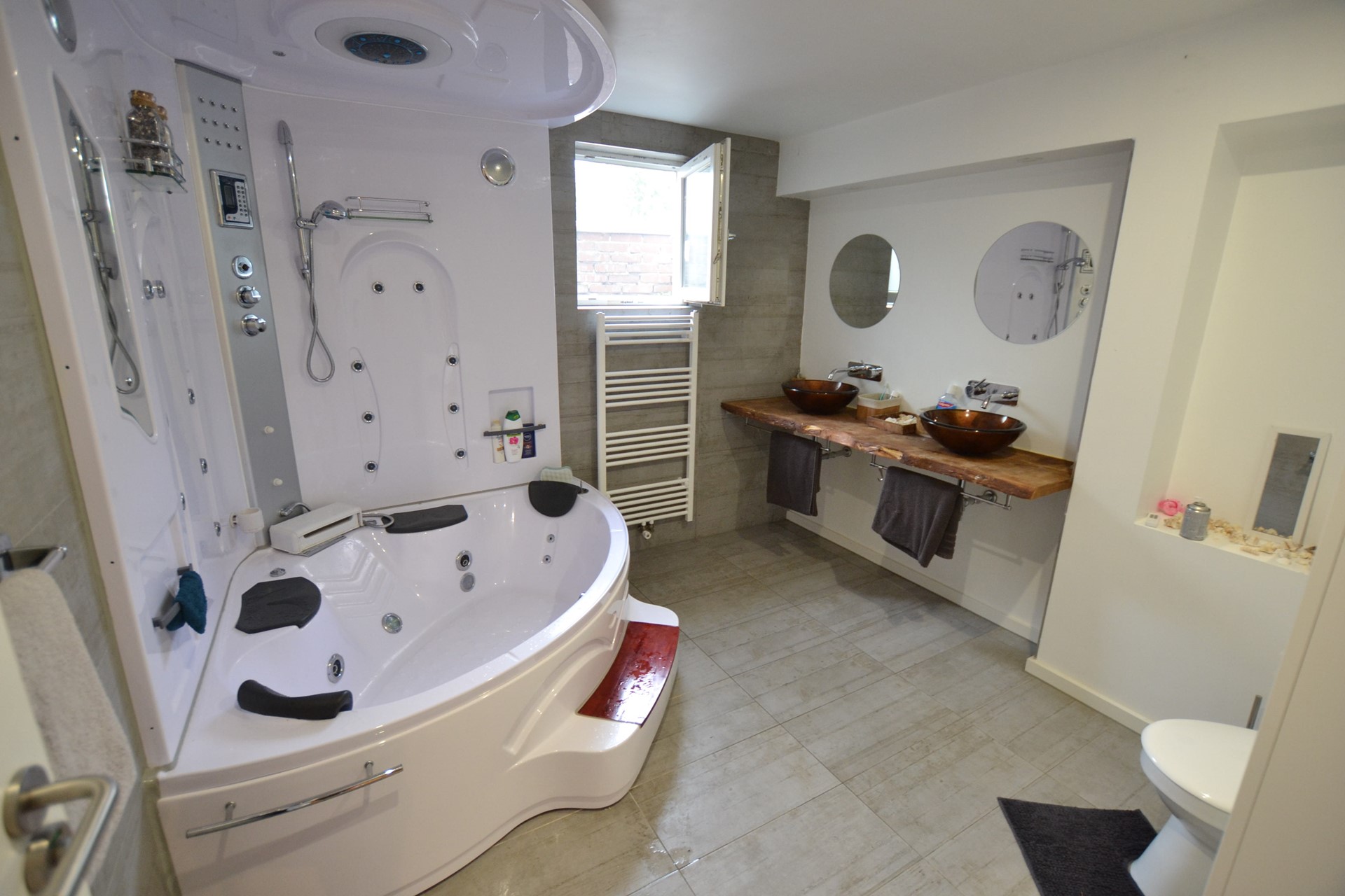 Badkamer 3,10 x 3,05 met plavuizenvloer, inbouwspots, hoekligbad met whirlpool, doublok, badkamermeubel met twee waskommen en design radiator.