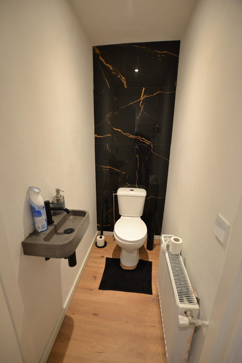 Toiletruimte 1,50 x 0,90 met laminaatvloer, inbouwspot en duoblok en fonteintje.