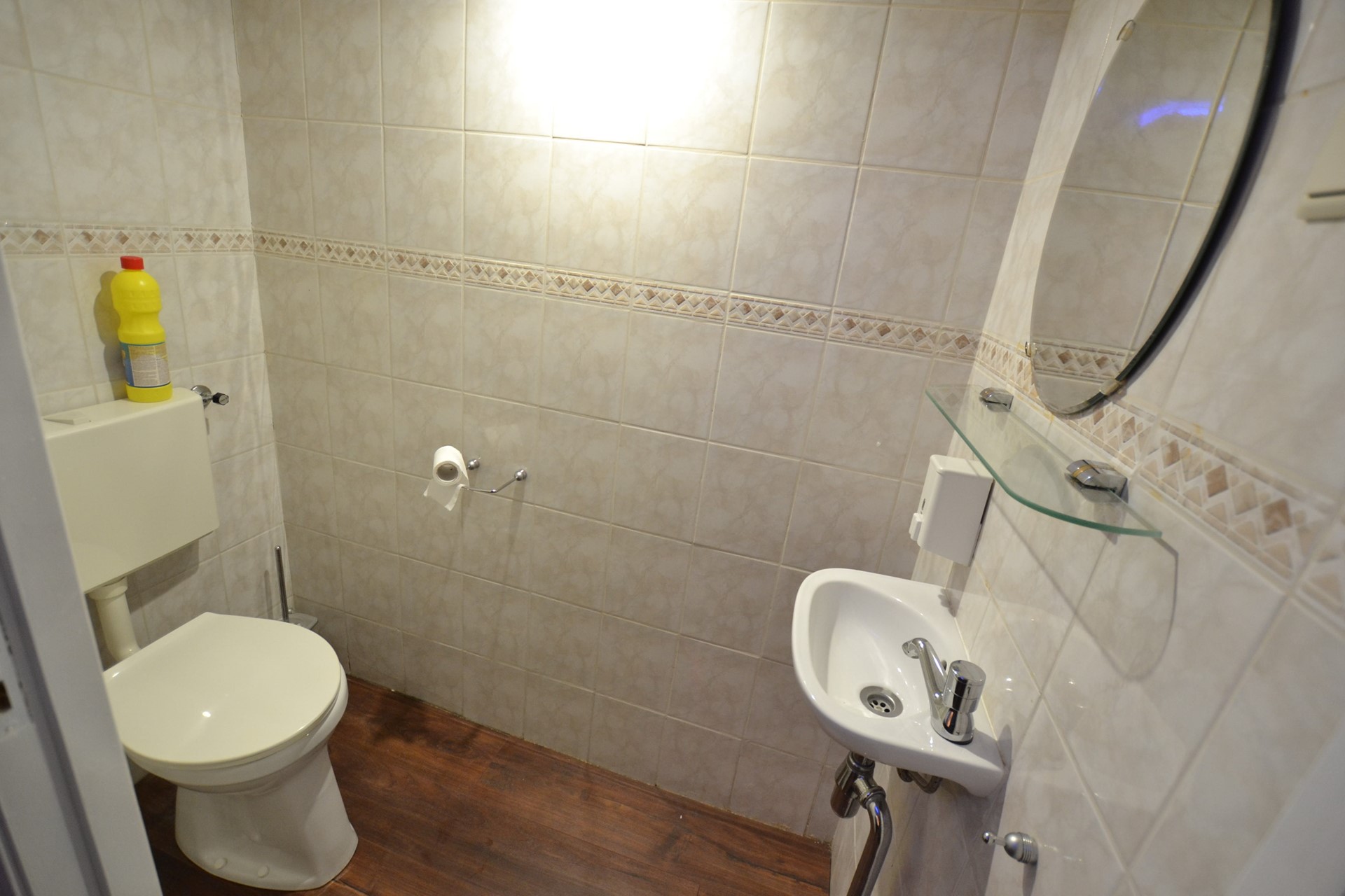 Toiletruimte 1,75 x 0,95 met laminaatvloer, duoblok en fonteintje.