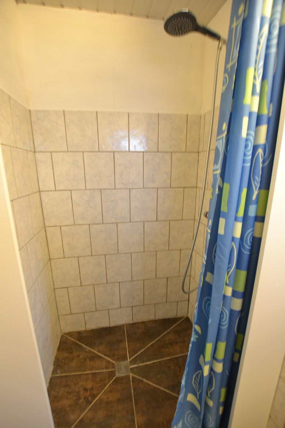 Badkamer 2,10 x 1,20 met plavuizenvloer, inloopdouche en duoblok.