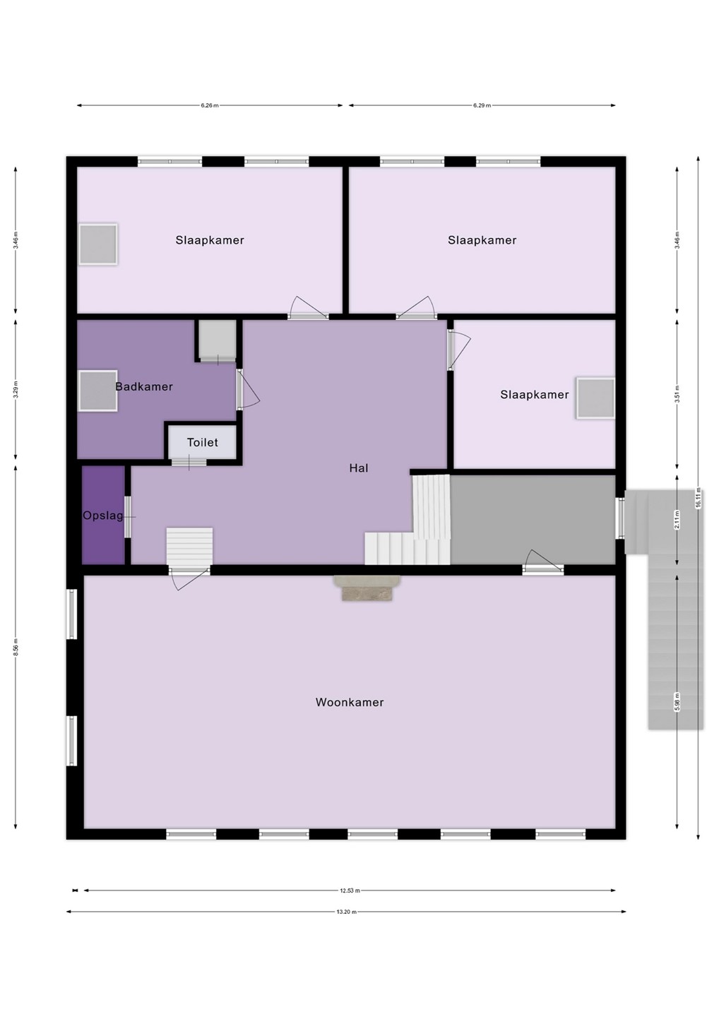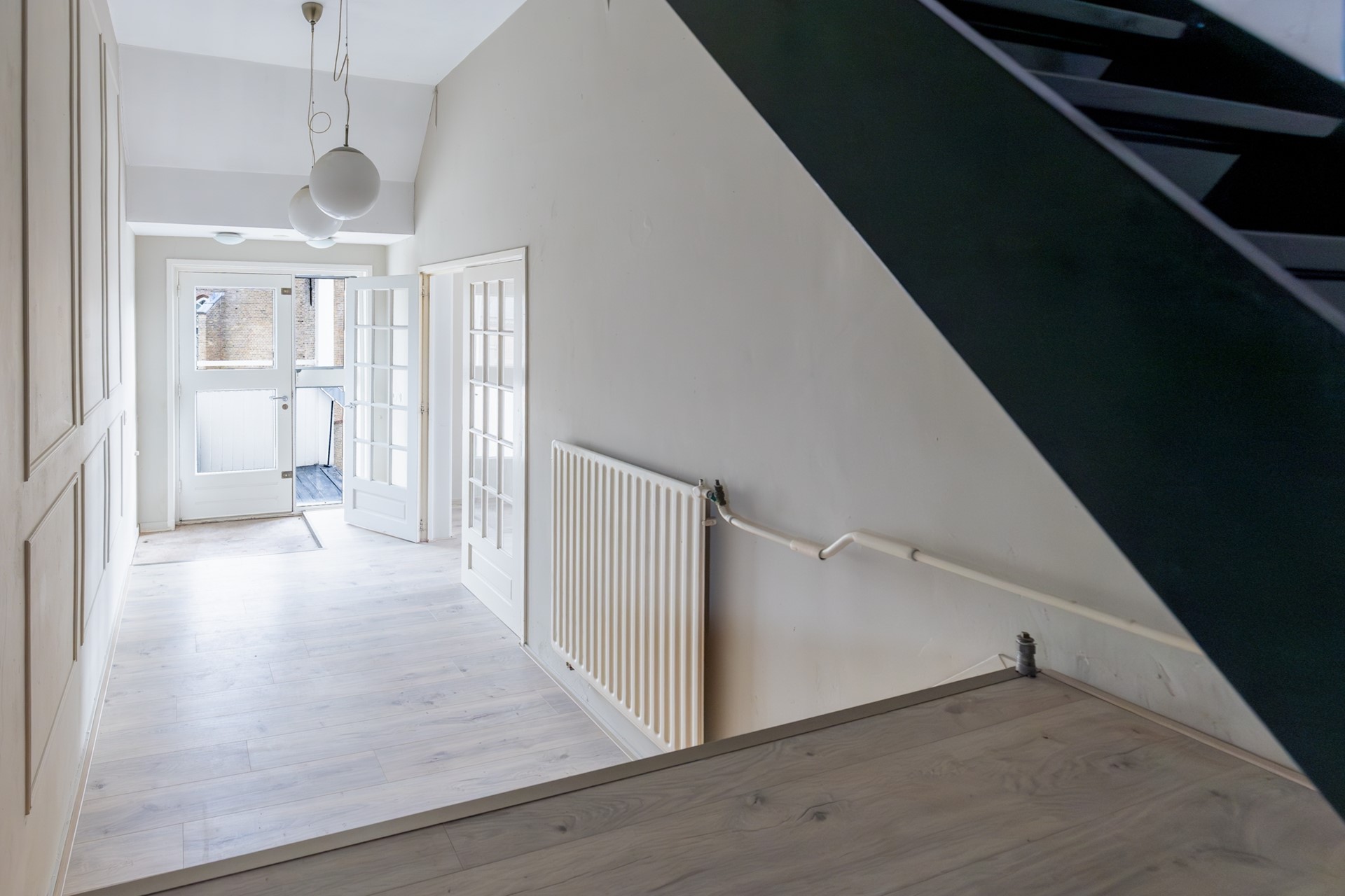 Via de buitentrap aan de zijkant kom je binnen op de ruime hal/overloop, die toegang geeft tot alle vertrekken.