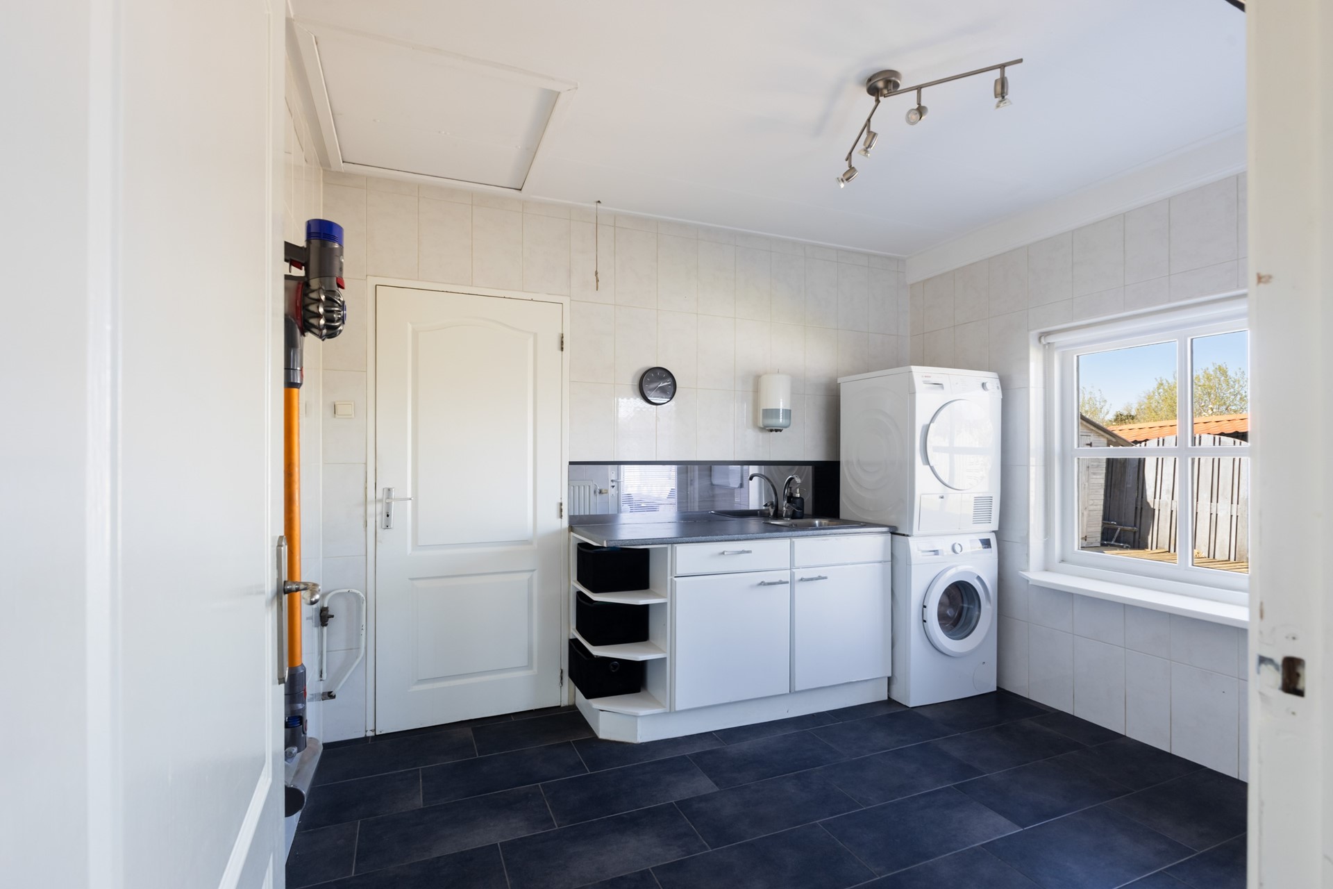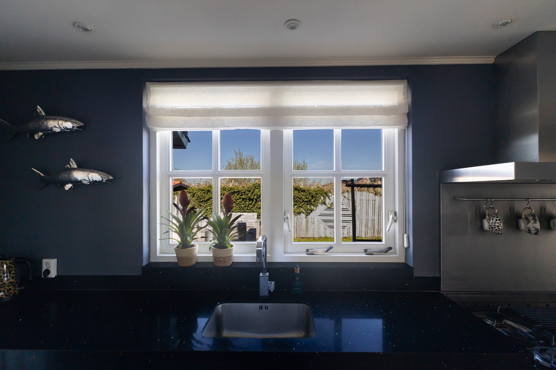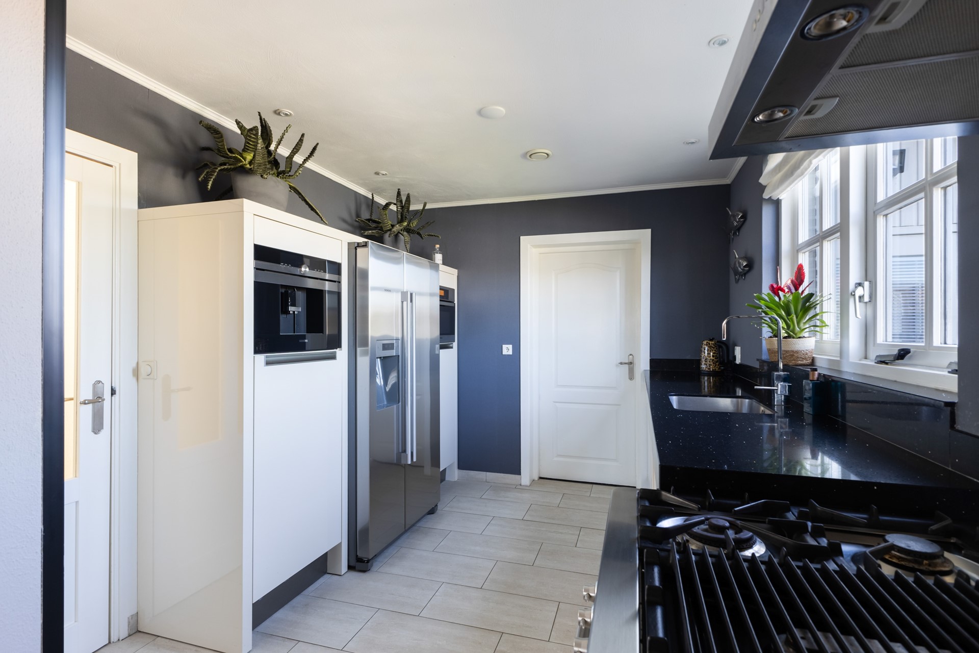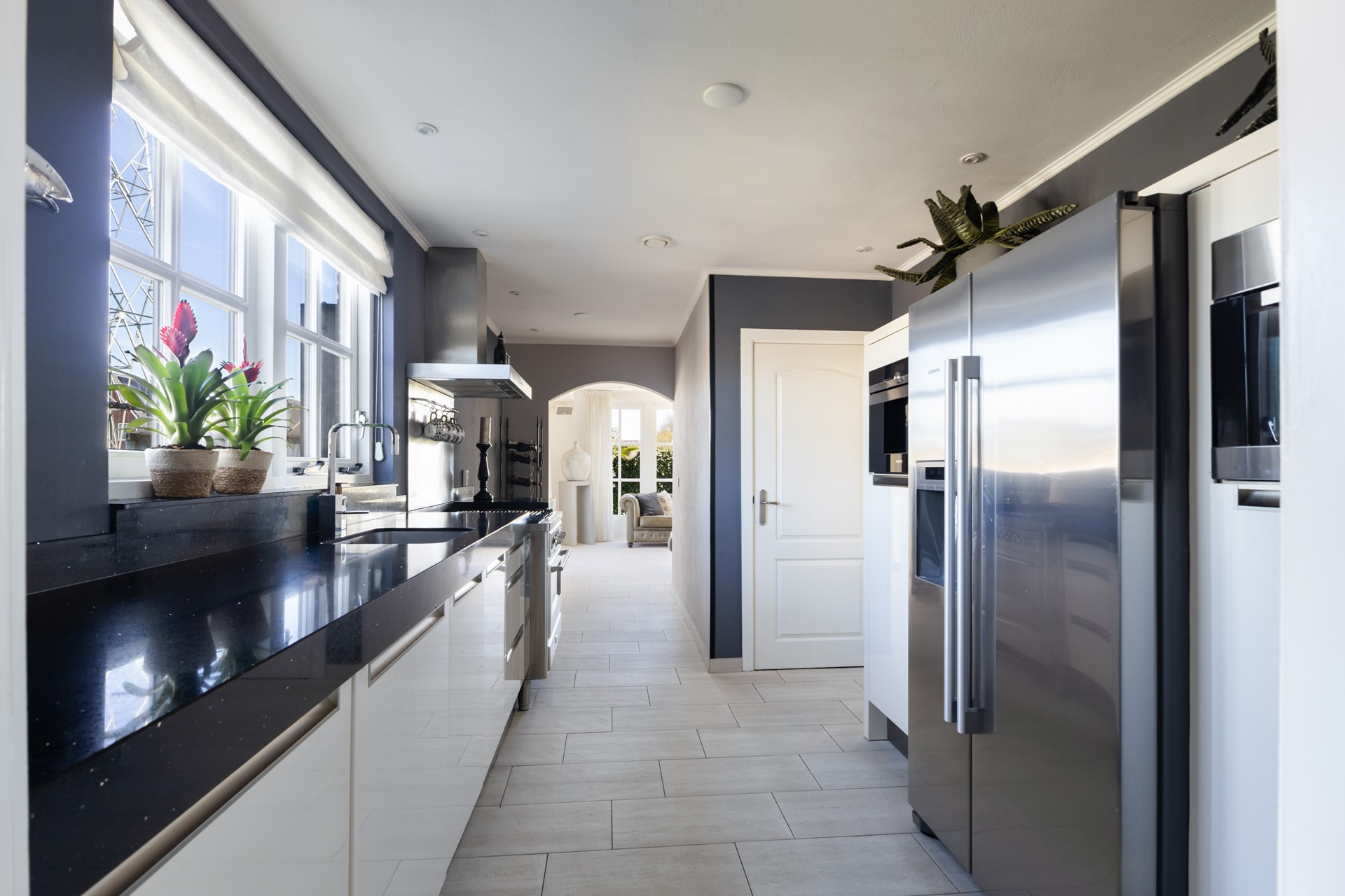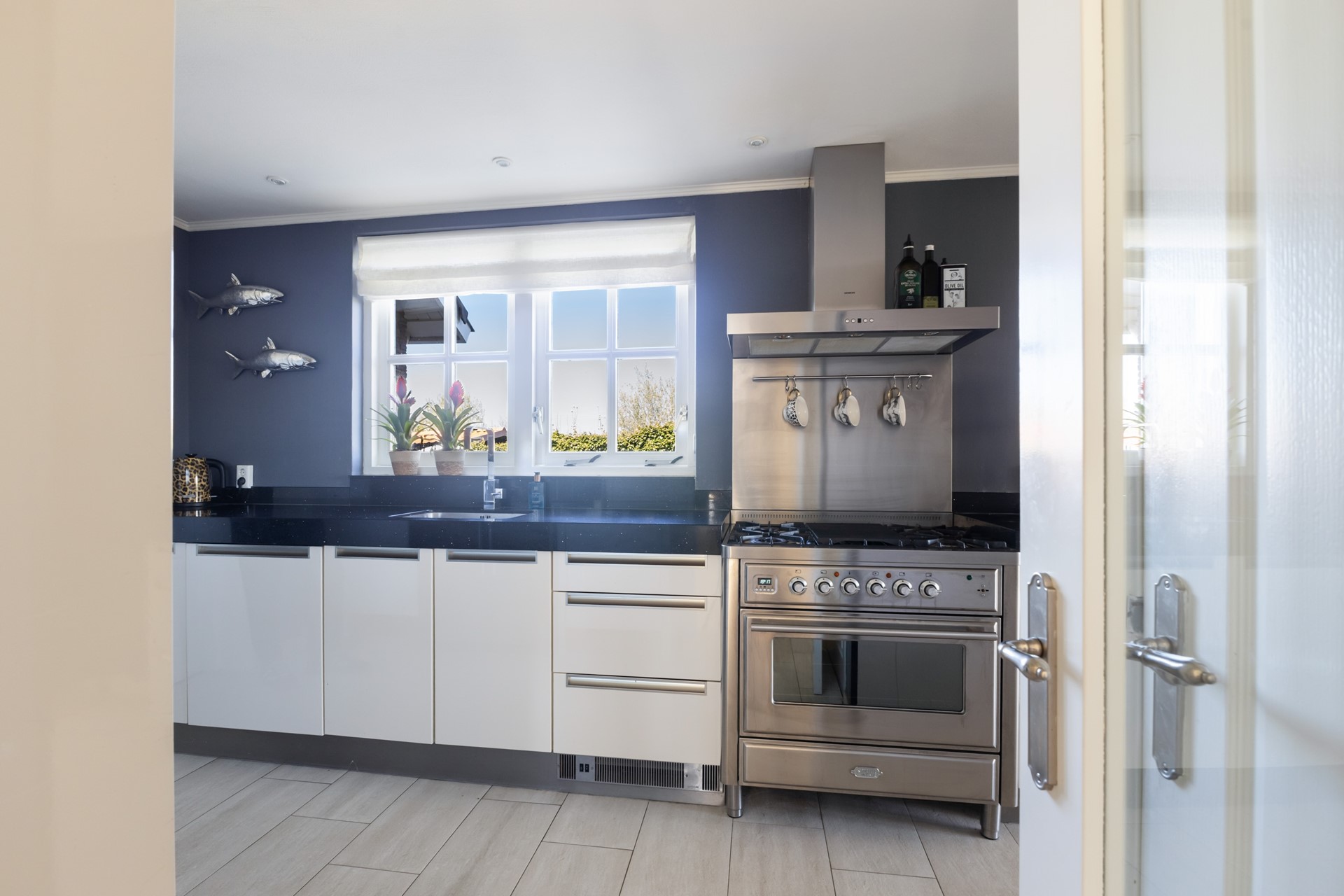 Aansluitend bevindt zich een aparte eetkamer, ideaal voor lange avonden tafelen met familie of vrienden. De halfopen keuken is luxe uitgevoerd en voorzien van onder andere een Borretti‑gasfornuis met grillplaat, dubbele koelkast/vriezer met ijsblokjesmachine, vaatwasser, combimagnetron en een inbouwkoffiezetapparaat. De keuken beschikt daarnaast over een ruime kelderkast, ideaal voor extra voorraad of opbergruimte. Vanuit de keuken is de bijkeuken bereikbaar, met extra bergzolder, aansluitingen voor wasapparatuur en de cv‑installatie.