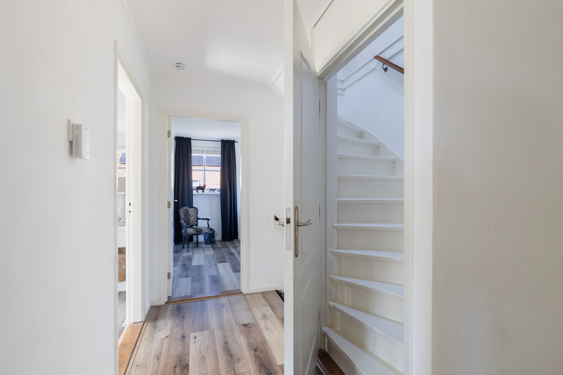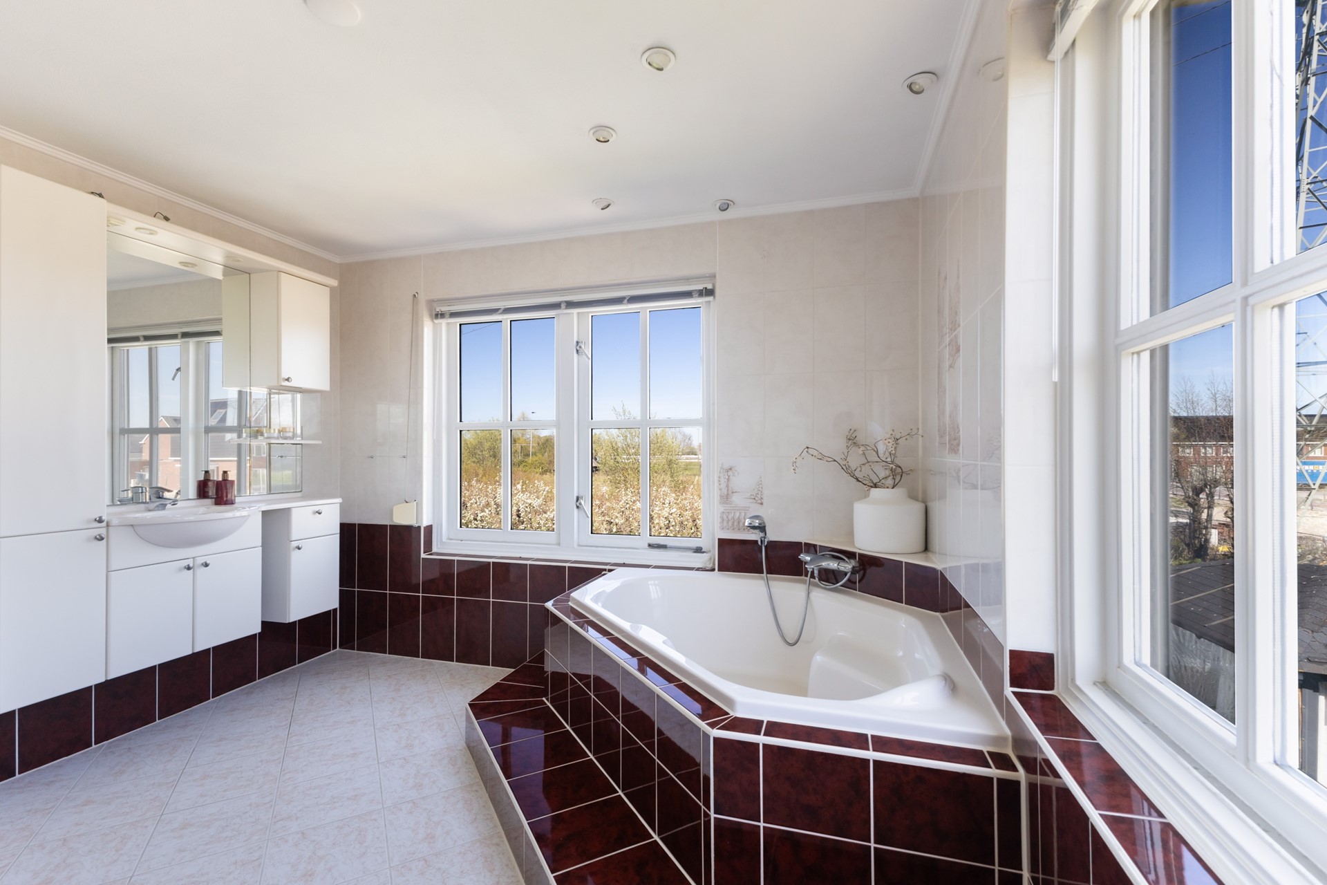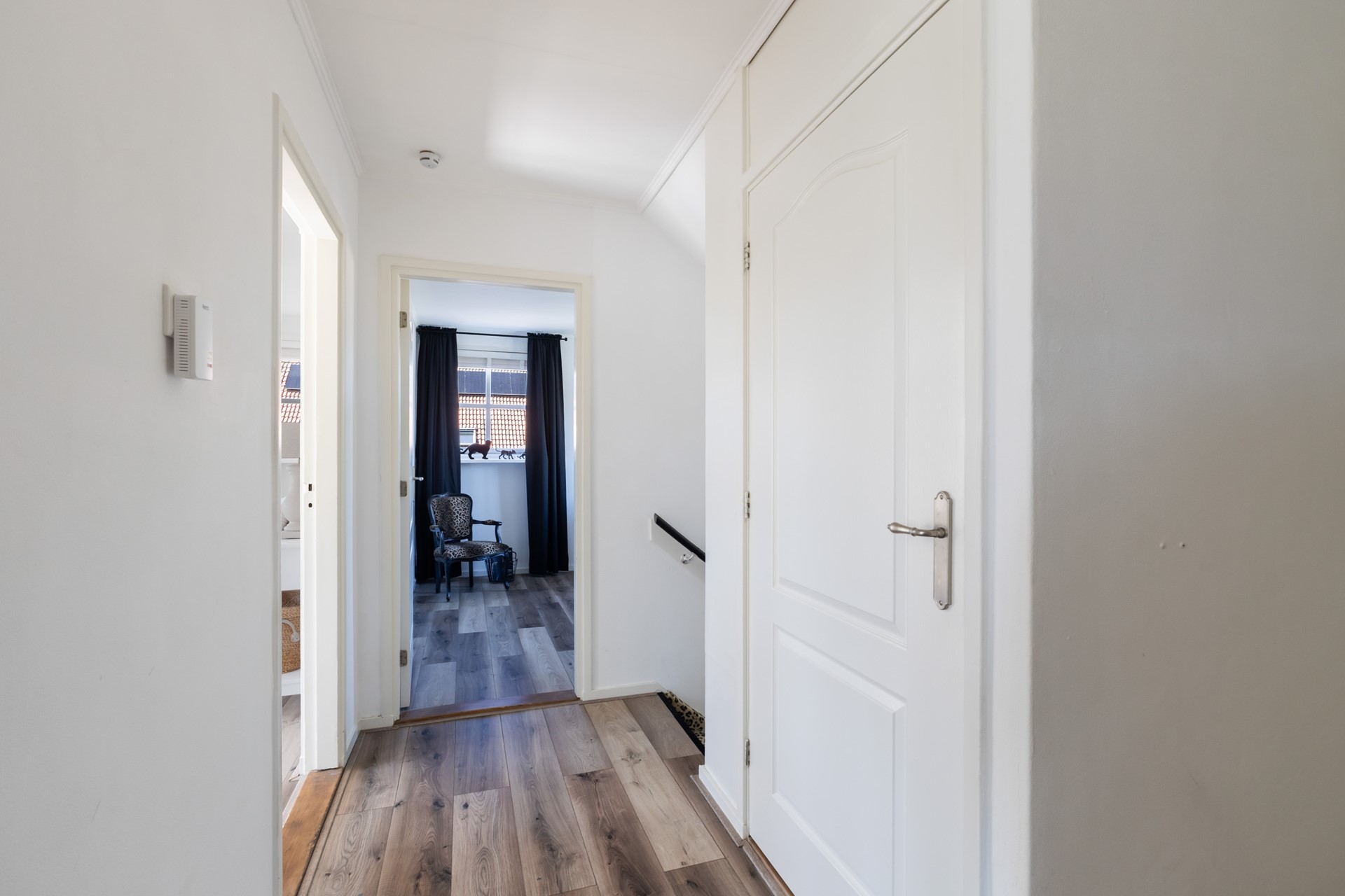Op de eerste verdieping bevinden zich twee ruime slaapkamers aan de voorzijde van de woning, waarvan één met balkon. De derde slaapkamer ligt aan de achterzijde. Alle kamers zijn afgewerkt met strak stucwerk en doorgelegde laminaatvloeren. De badkamer is royaal en compleet ingericht met een hoekligbad, een aparte douche, een wastafel met meubel, een tweede toilet en een designradiator.