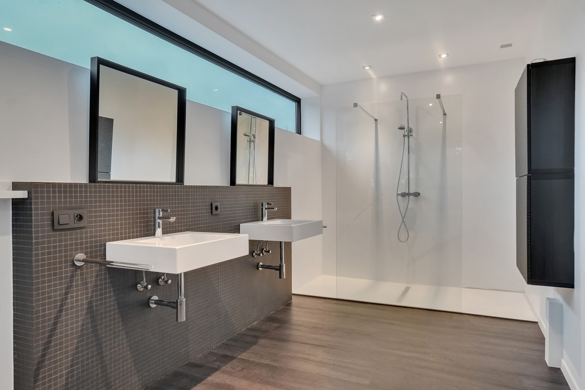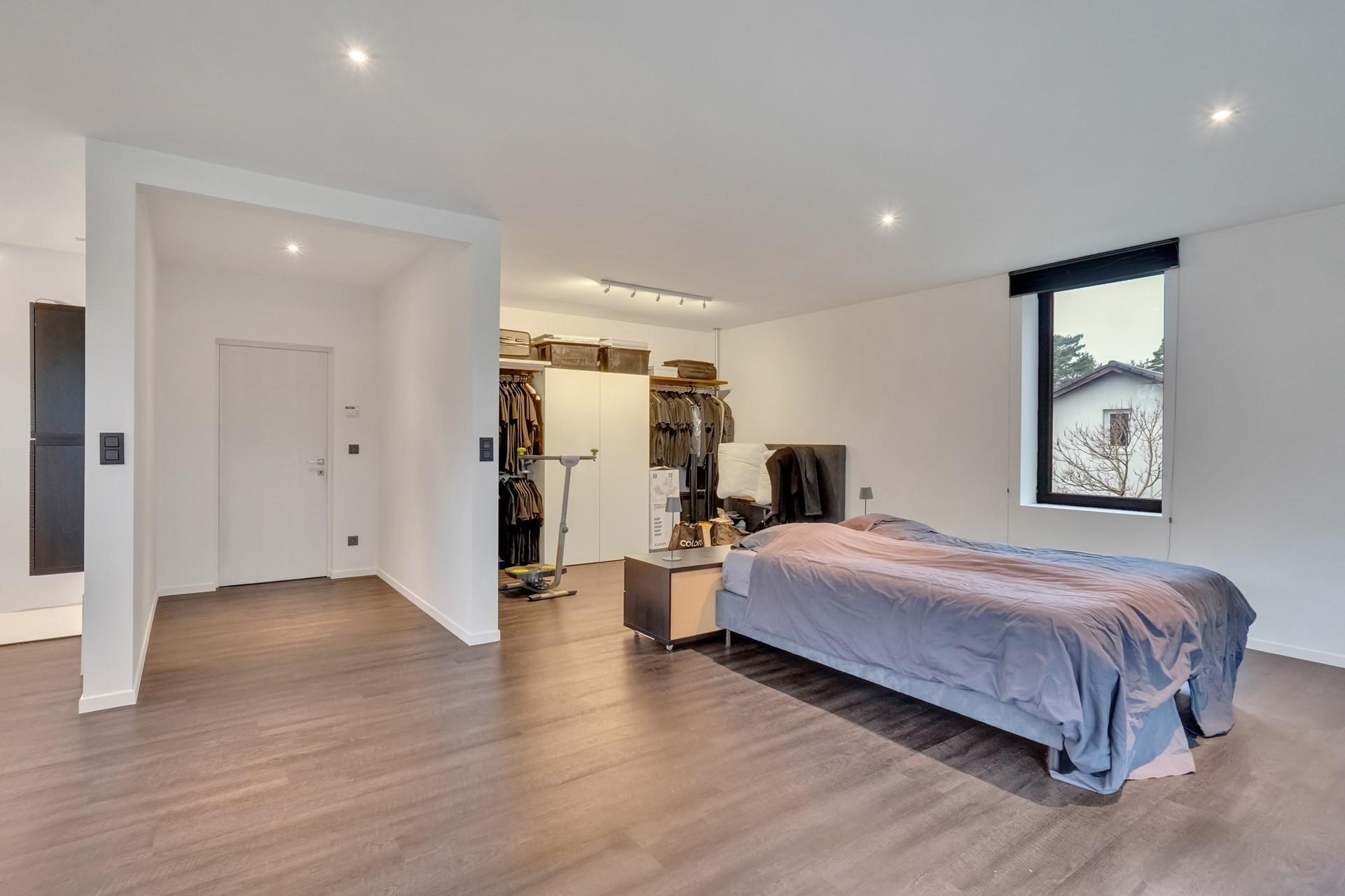 Op de eerste verdieping bevinden zich twee ruime slaapkamers, waarvan één ontworpen is om eenvoudig op te splitsen in twee aparte kamers. Alle noodzakelijke voorzieningen zijn al aanwezig, maar op dit moment fungeert de kamer als één grote ruimte. Daarnaast is er een aparte badkamer met douche en wastafel, evenals een tweede toilet. De masterbedroom vormt een eigen luxeverdieping binnen de woning, uitgerust met een royale ensuite badkamer met rond bubbelbad, inloopdouche, dubbele wastafel en een ruimte die perfect kan dienen als open dressing of omgetoverd kan worden in inloopkast.
