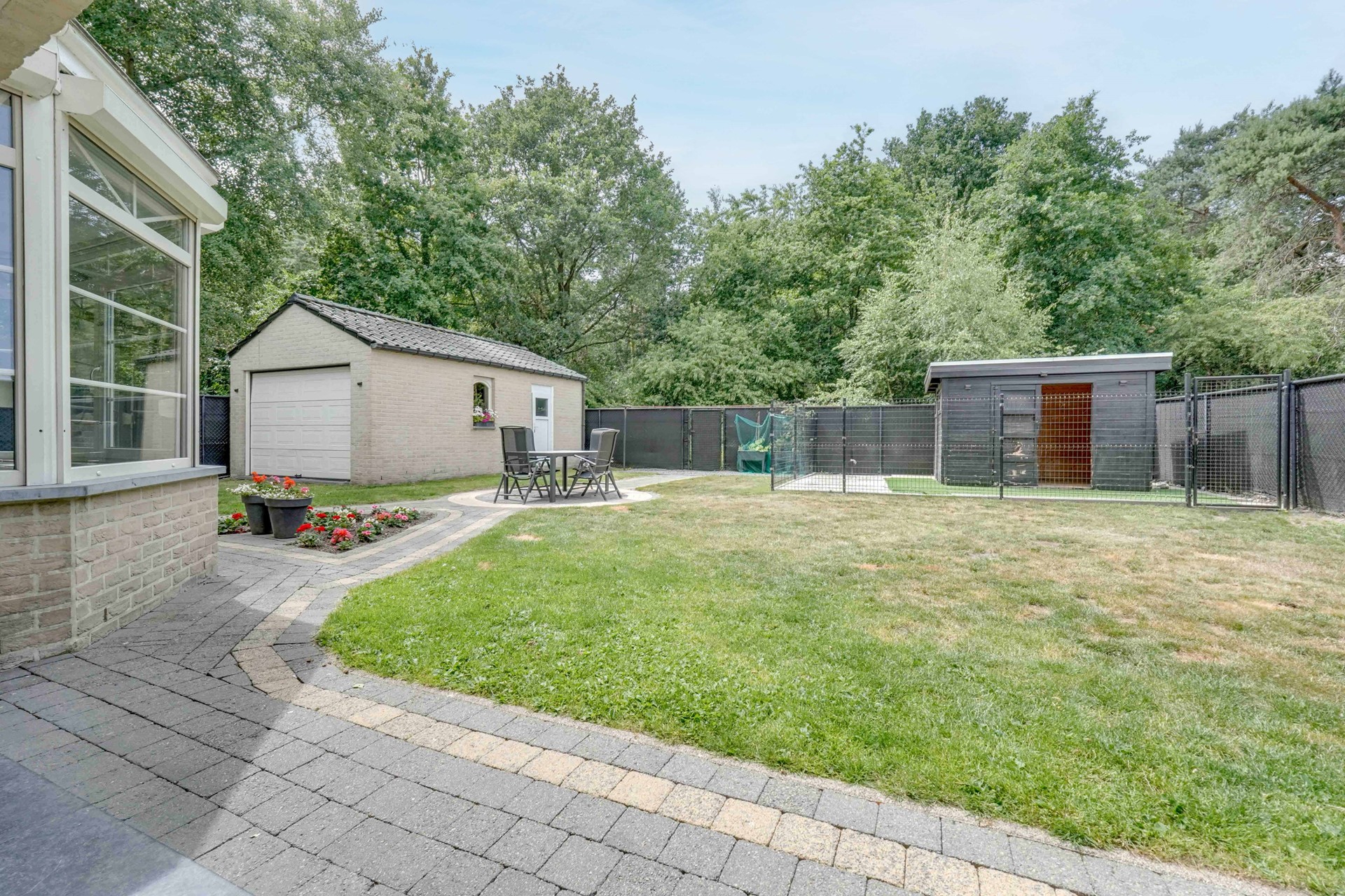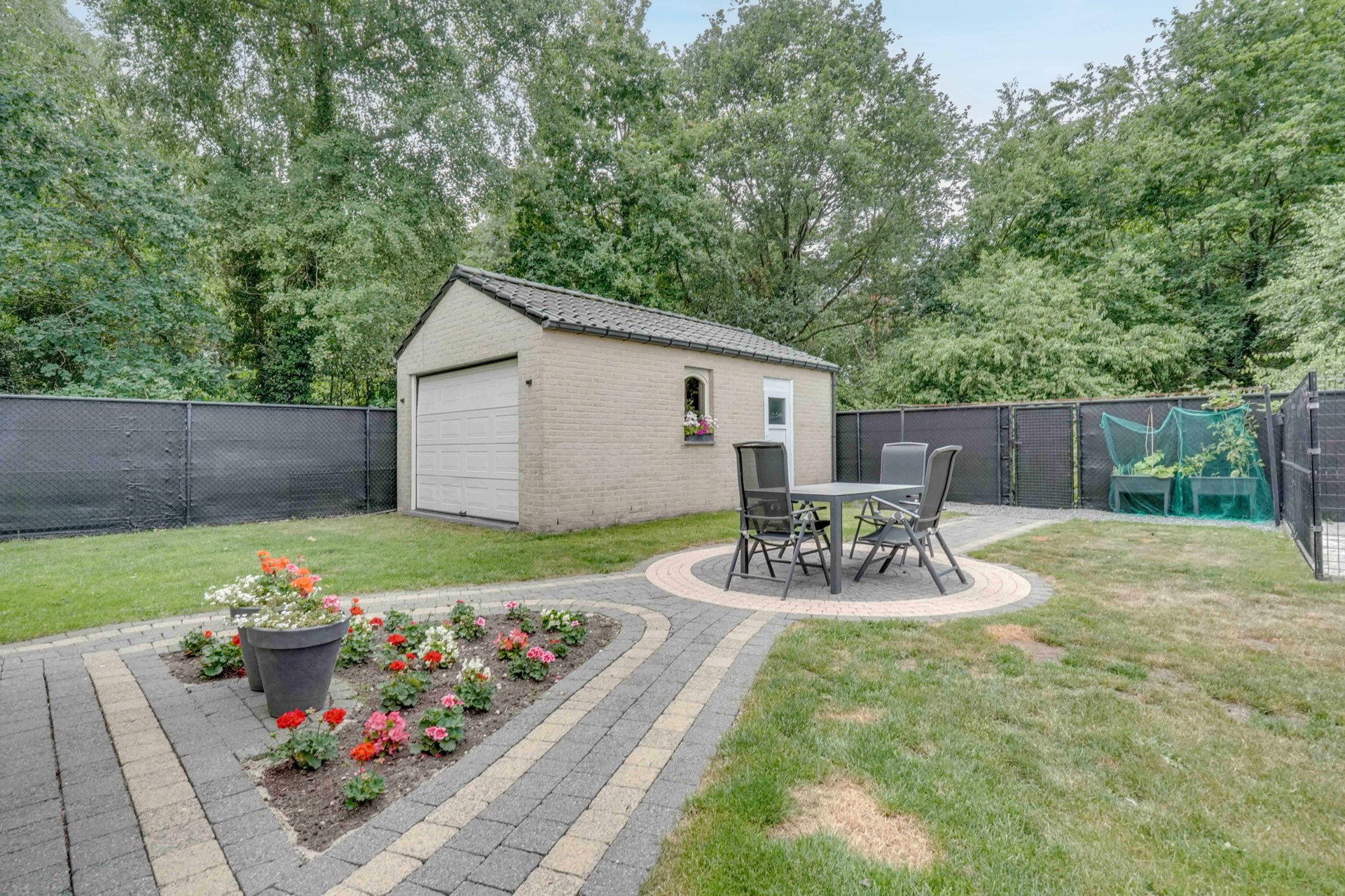 In de aangelegde en volledig omheinde tuin is achteraan nog een extra garage voorzien, ideaal voor het opbergen van tuinmateriaal of als bijkomende berging.