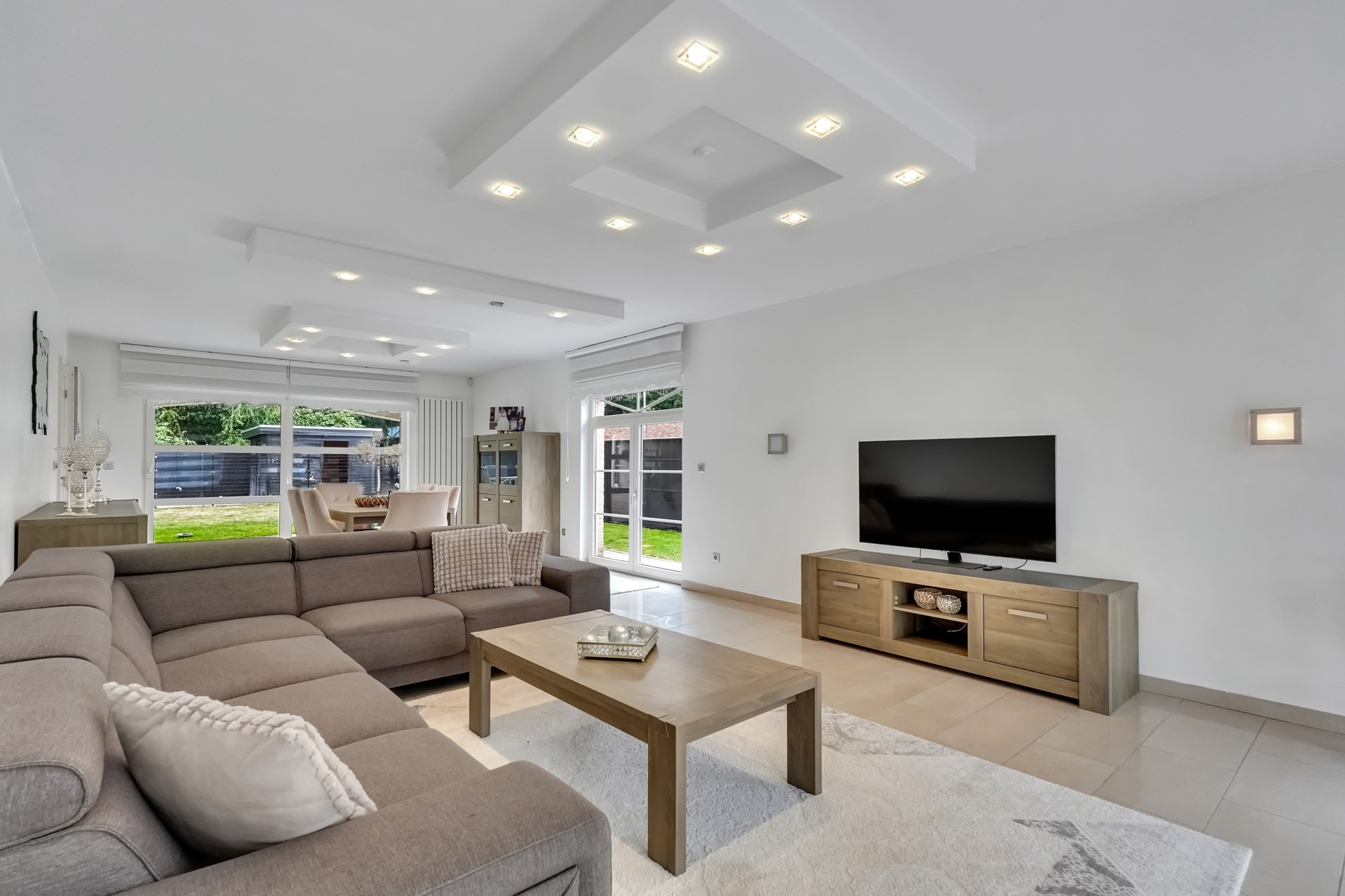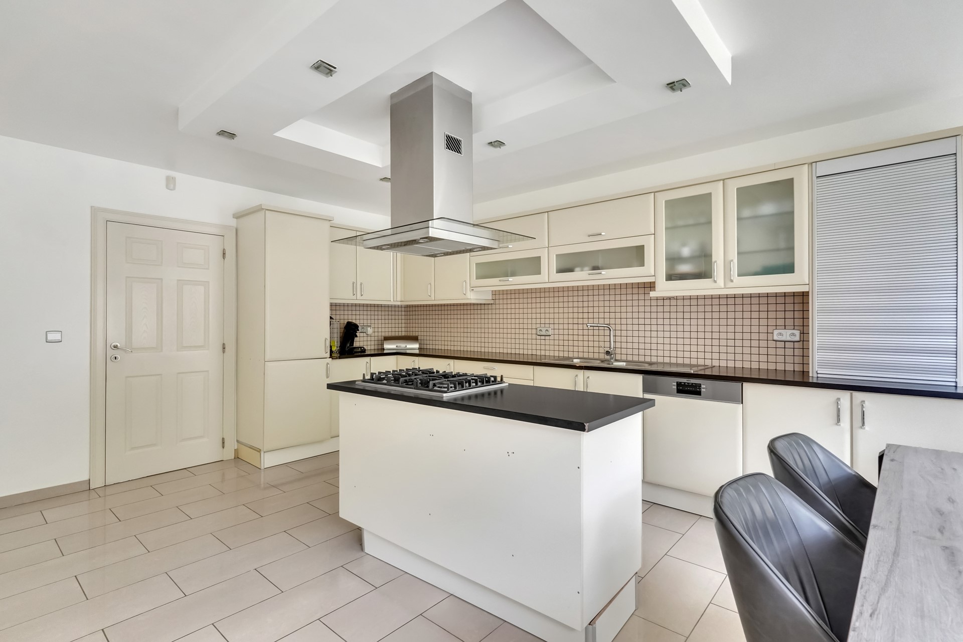 Bij het betreden van de woning kom je binnen in een ruime inkomhal die toegang biedt tot alle ruimtes op het gelijkvloers. De woonkamer baadt in natuurlijk licht en vloeit mooi over in de eetkamer, wat zorgt voor een open en gezellige leefruimte. De aangrenzende keuken is volledig uitgerust met onder andere een gasfornuis, oven, koelkast, vaatwasser en dampkap.