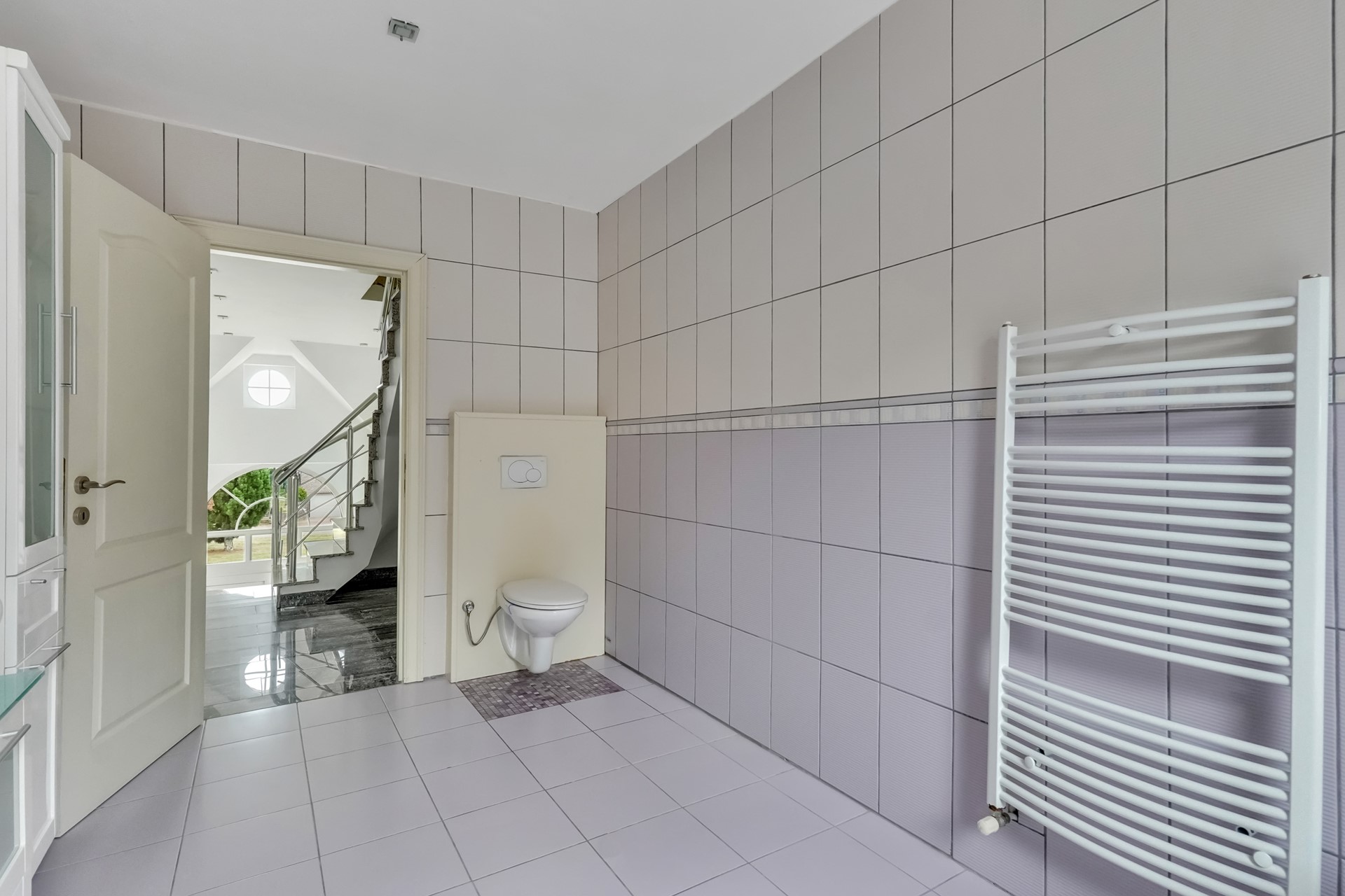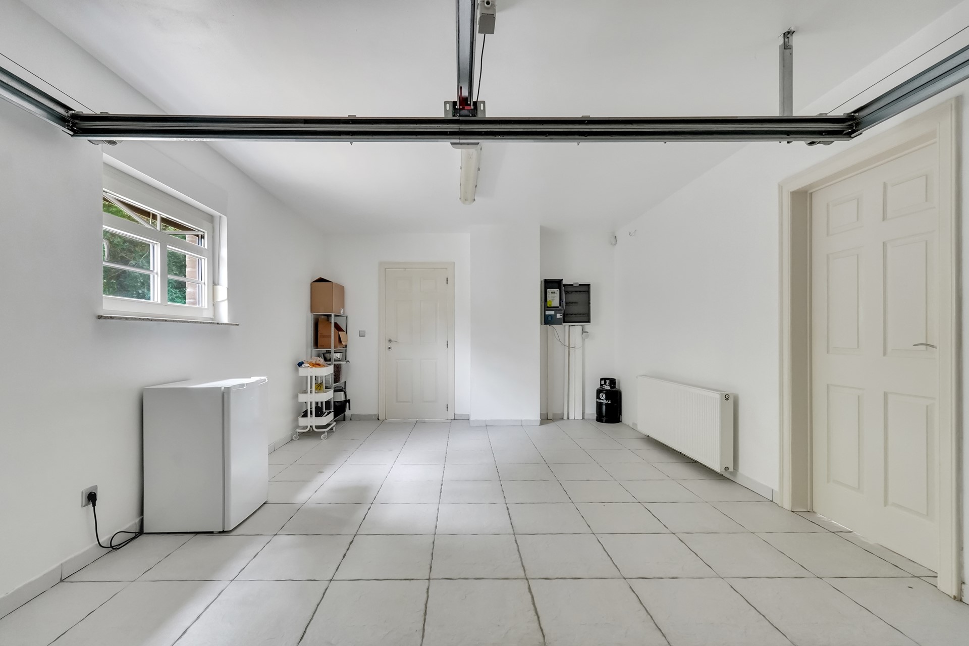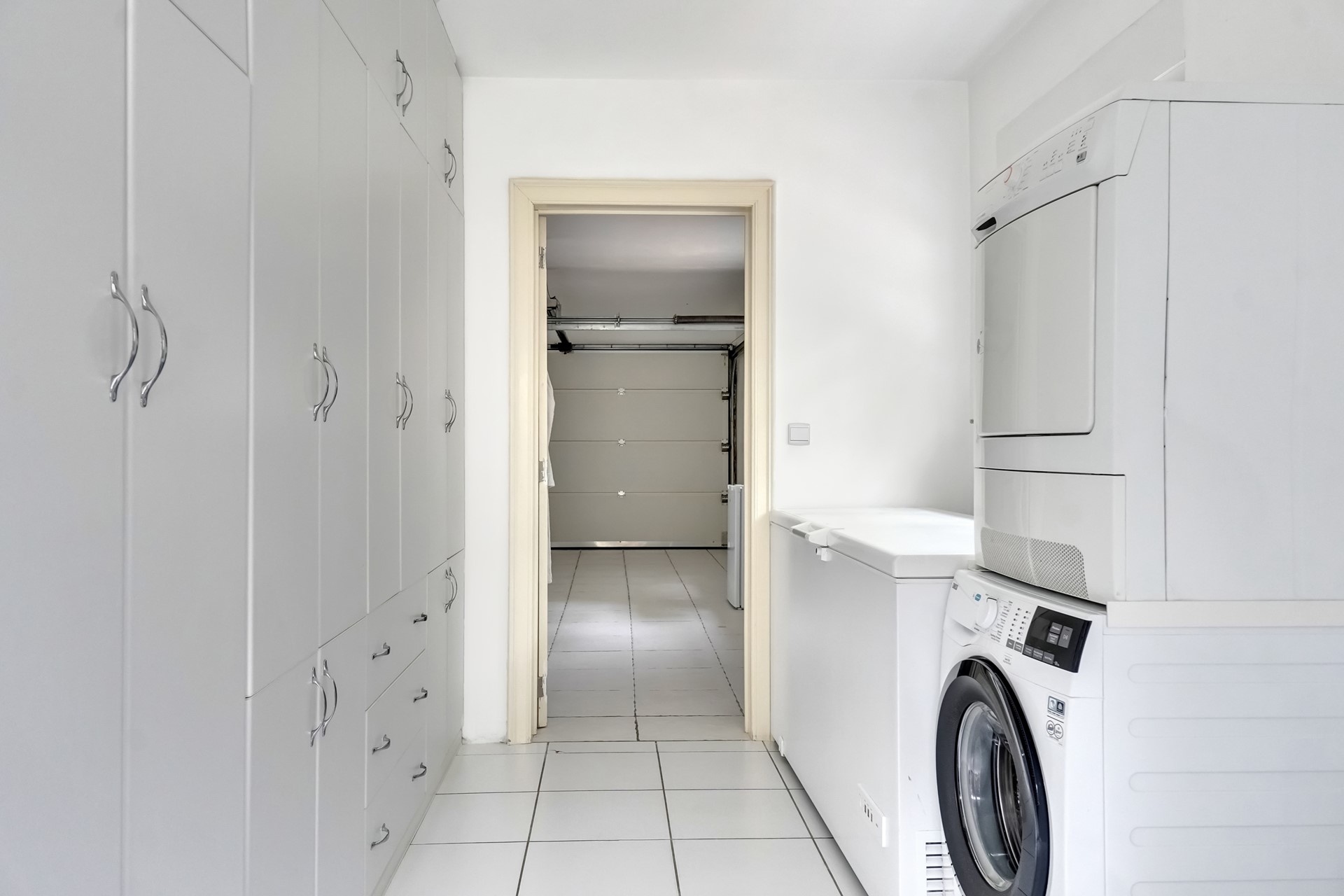 Verder treffen we op het gelijkvloers nog een gastentoilet, een inpandige garage en een praktische berging waar zich een extra douche en de aansluitingen voor wasmachine en droogkast bevinden.