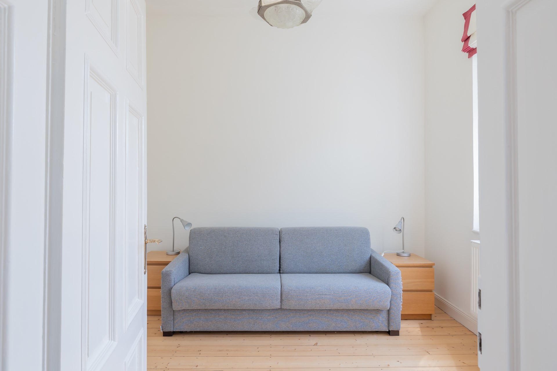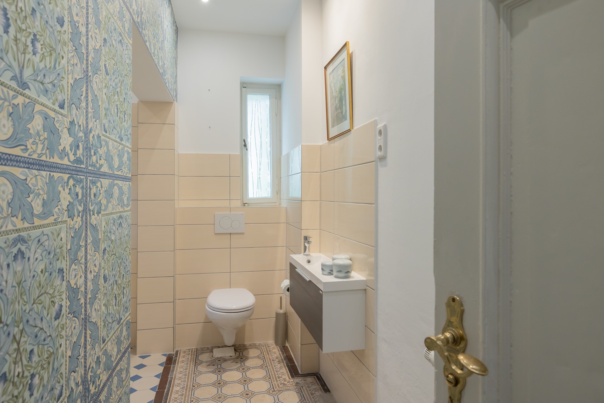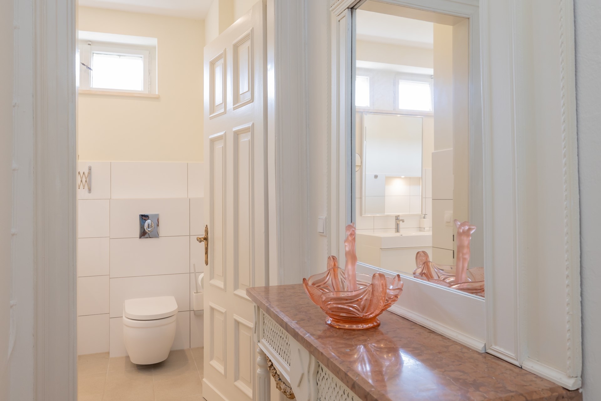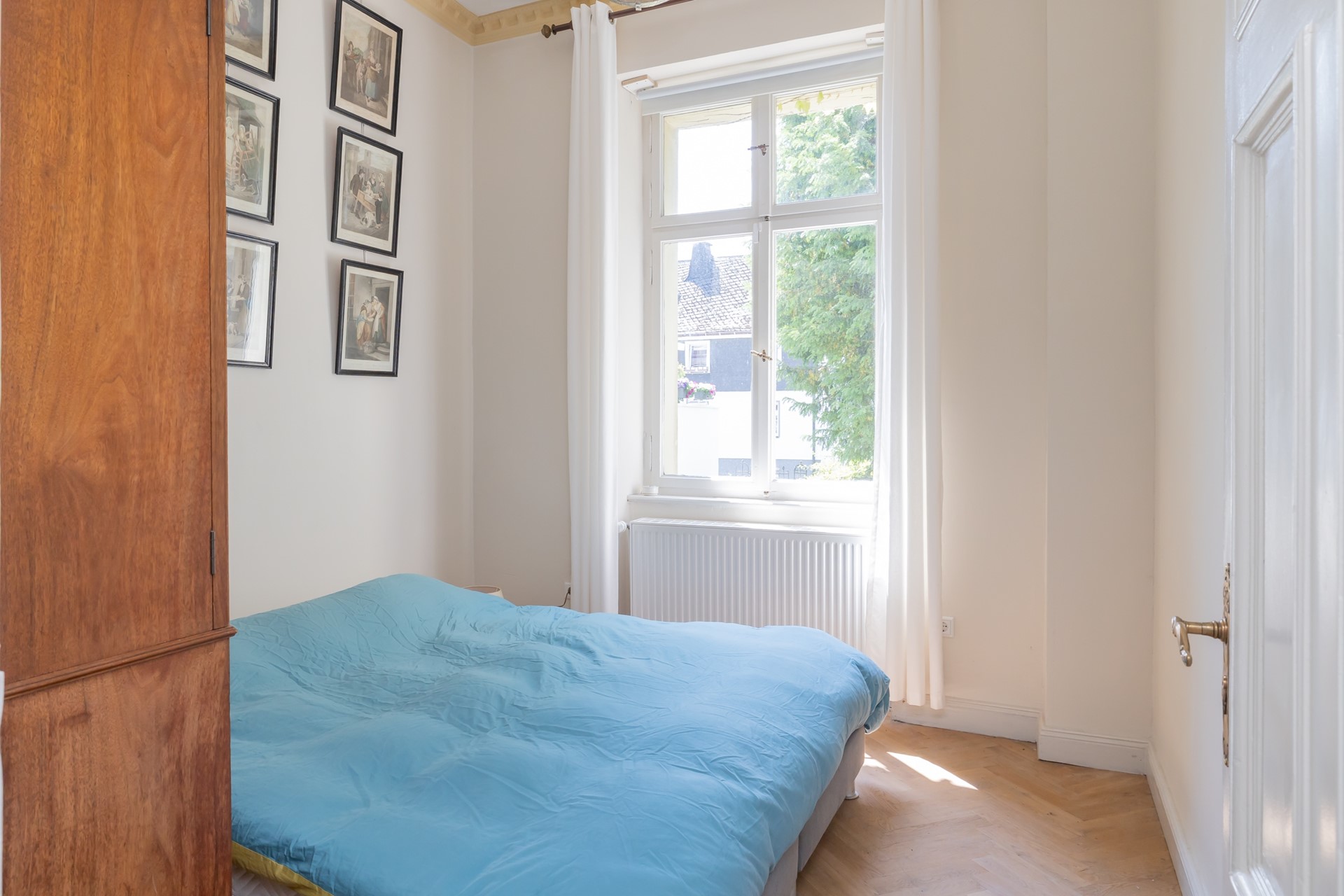 Deze verdieping combineert historische elementen met eigentijds comfort. De hal betreed je via dubbele deuren met facetgeslepen glas. Boven de deur prijkt een gerestaureerd glas-in-loodpaneel in Art Deco-stijl. De originele houten plankenvloeren, cassettedeuren en Jugendstil-deurbeslag zijn behouden gebleven.