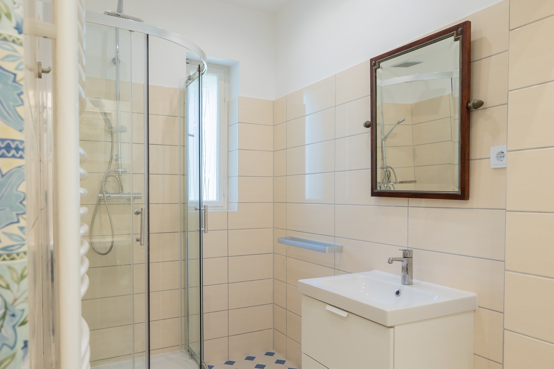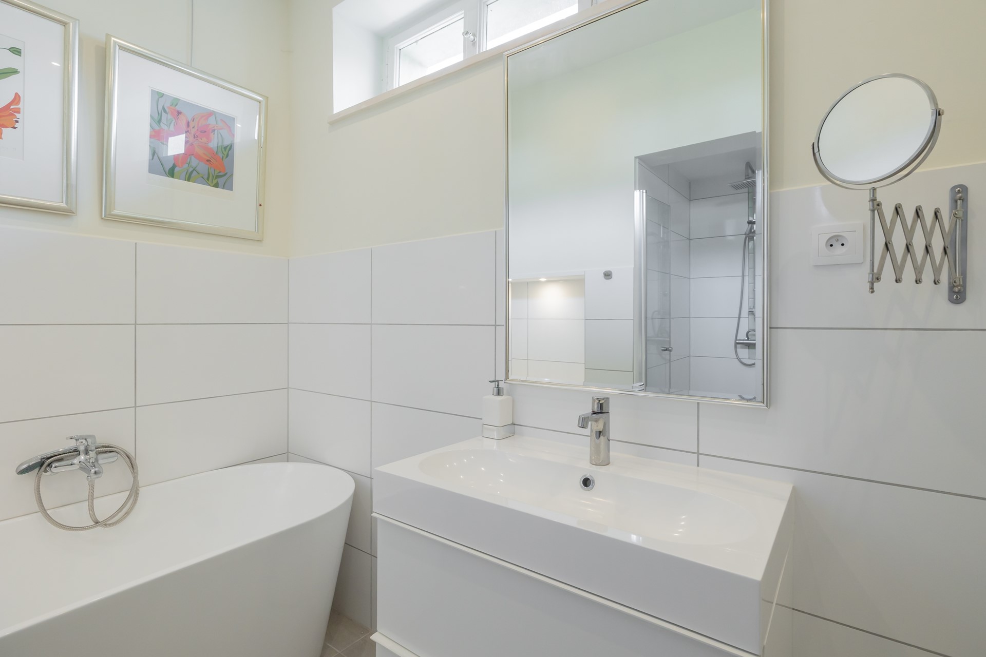 • Een stijlvolle badkamer met douche, toilet, wastafelmeubel, fonteintje en elektrische handdoekradiator