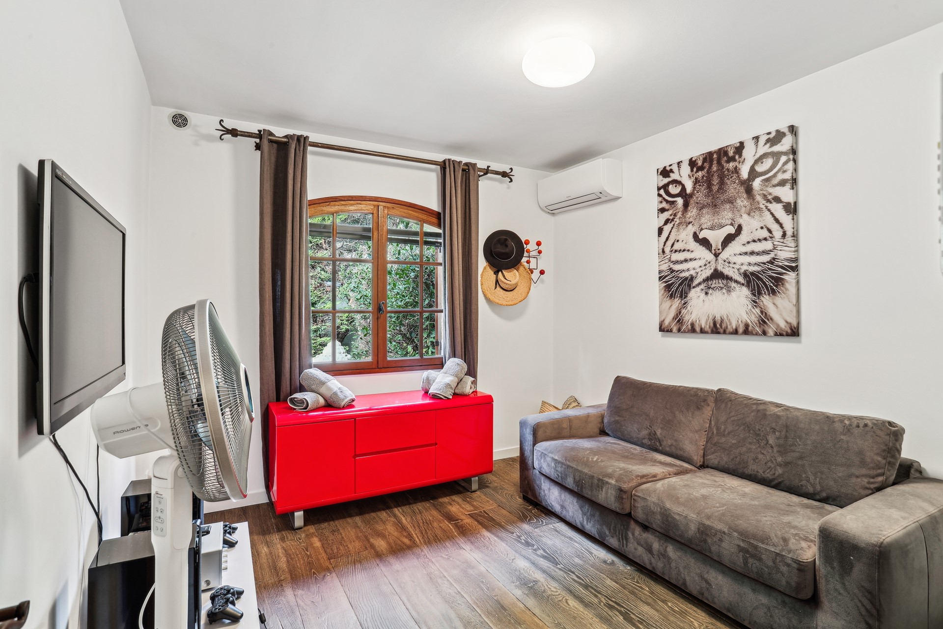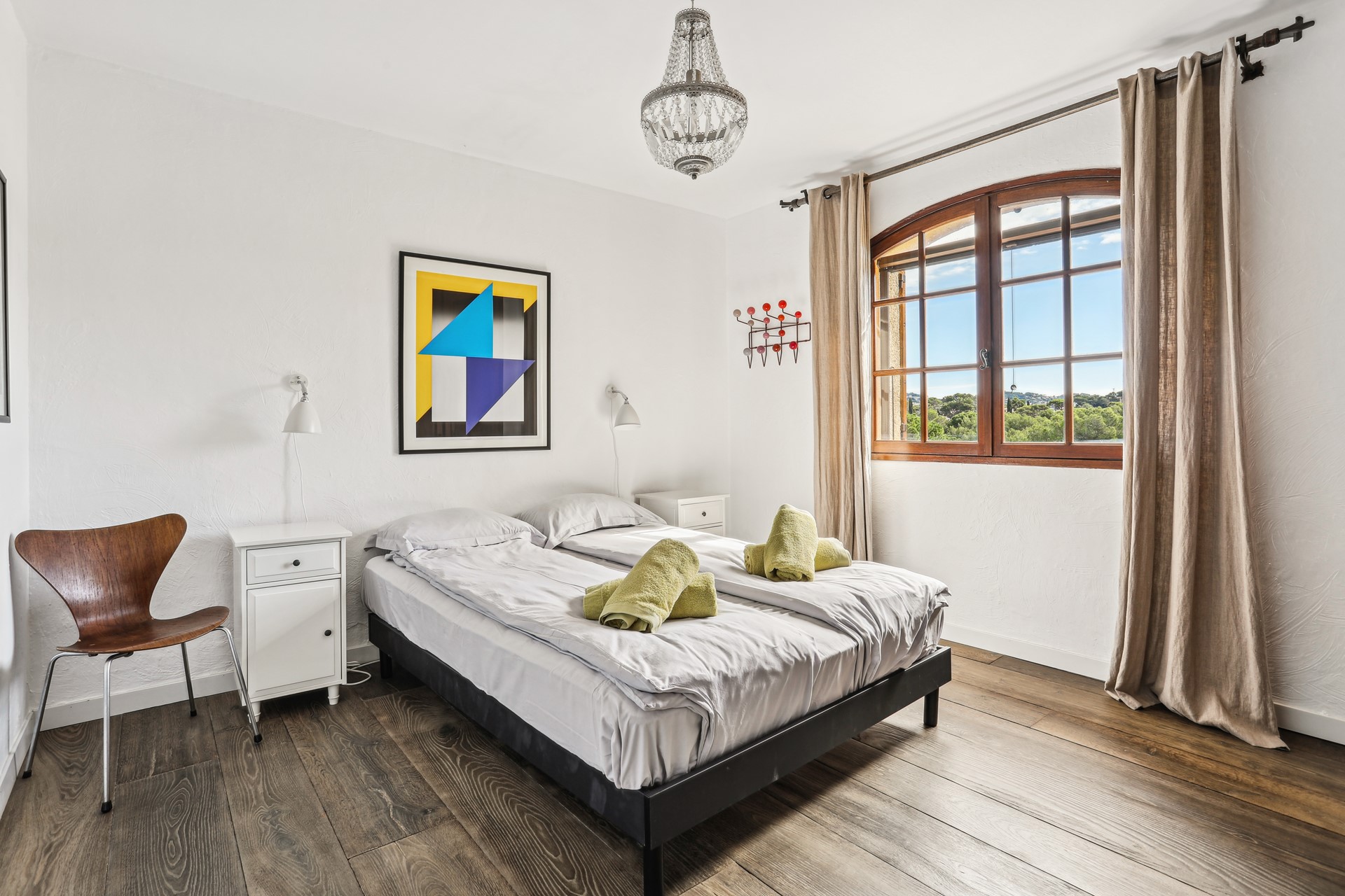 Op dezelfde verdieping bevinden zich twee tweepersoonsslaapkamers met een gedeelde doucheruimte, evenals een berging. De lichte en uitnodigende woonkamer grenst aan een extra eethoek. Achter het huis bevindt zich nog meer buitenruimte en een trap naar het zwembad, met een terras en een jeu de boulesbaan. De tuin is voorzien van een automatisch sproeisysteem en sfeervolle verlichting voor de avonden aan de Côte d'Azur.