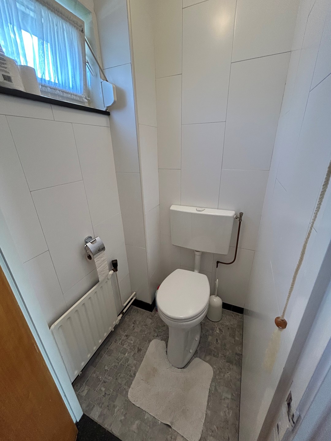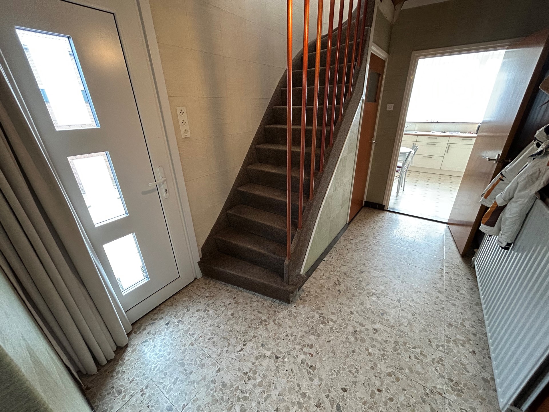 Entree/hal 4,80 x 2,30/1,40 met plavuizenvloer, meterkast, gastentoilet 1,05 x 1,00 met duoblok, deur naar woonkamer, keuken en kelder en trap naar verdieping.
