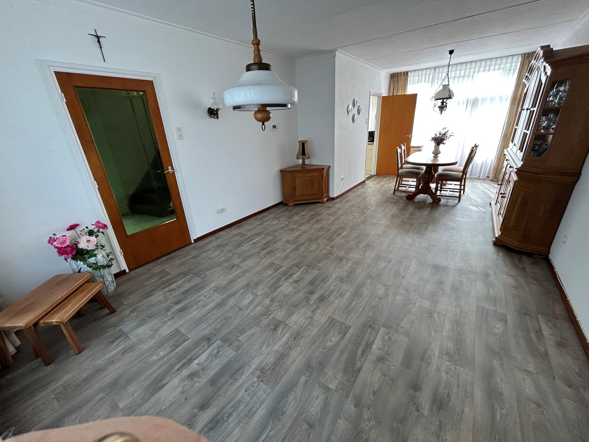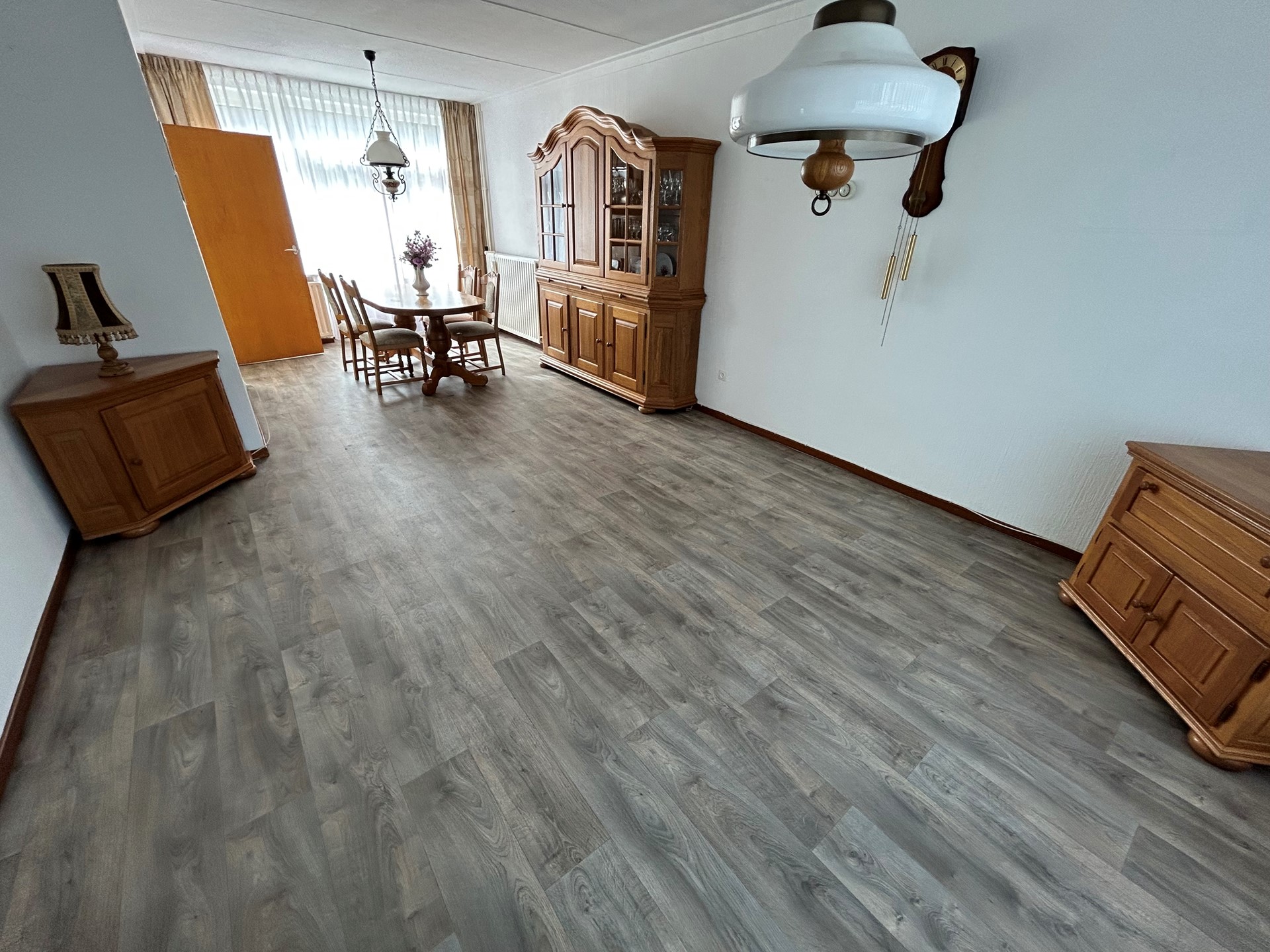 L-vormige woonkamer 8,05 x 3,90/3,05 met novilon, deur naar keuken en openslaande deuren naar achtertuin.