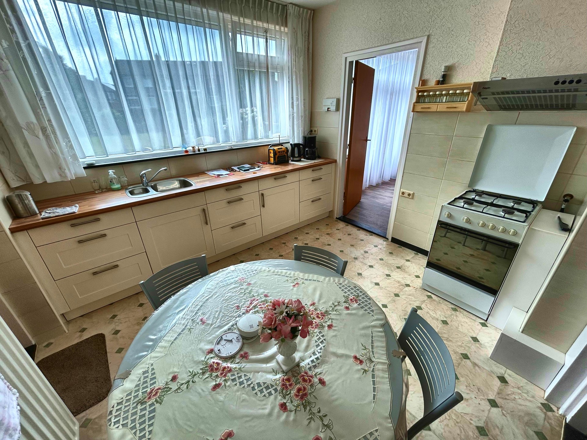 Keuken 3,15 x 3,15 met novilon, deur naar garage en gang en aanbouwkeuken met losse fornuis met afzuigunit en dubbele spoelbak.