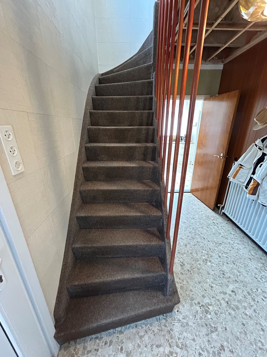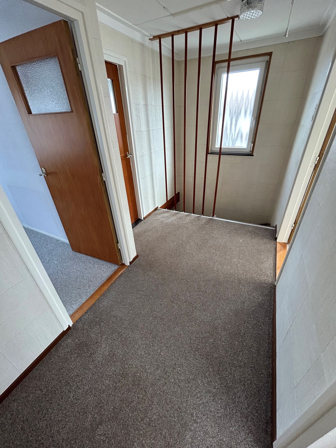 Overloop 3,20 x 1,50 met vloerbedekking en vlizotrap naar zolder.