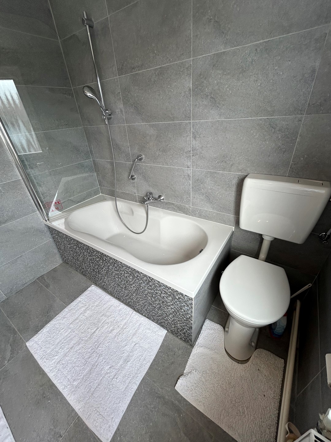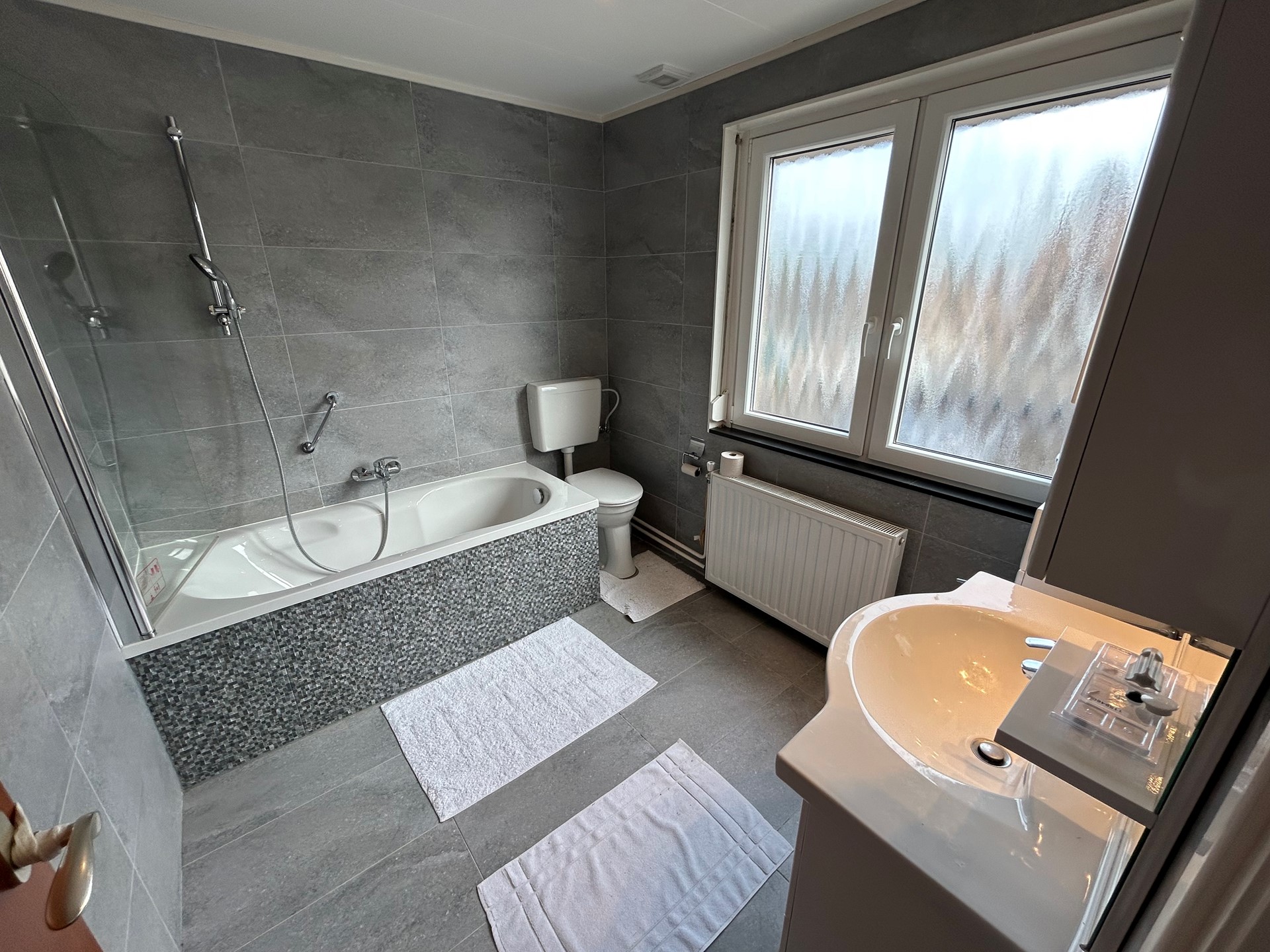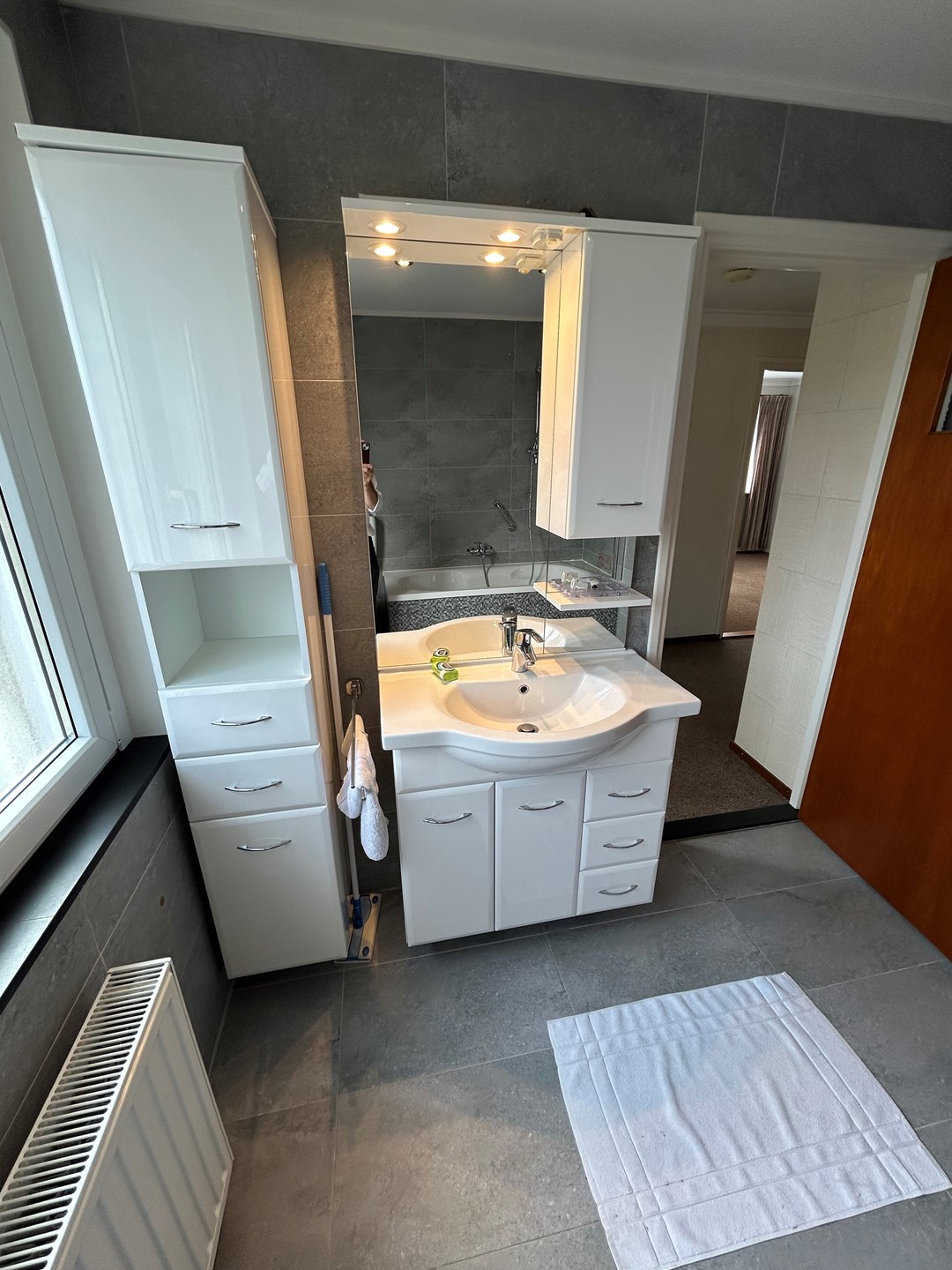 Mooie badkamer 2,70 x 2,30 met plavuizenvloer, inbouwspots, ligbad/douche, duoblok en badkamermeubel met keramische wastafel.