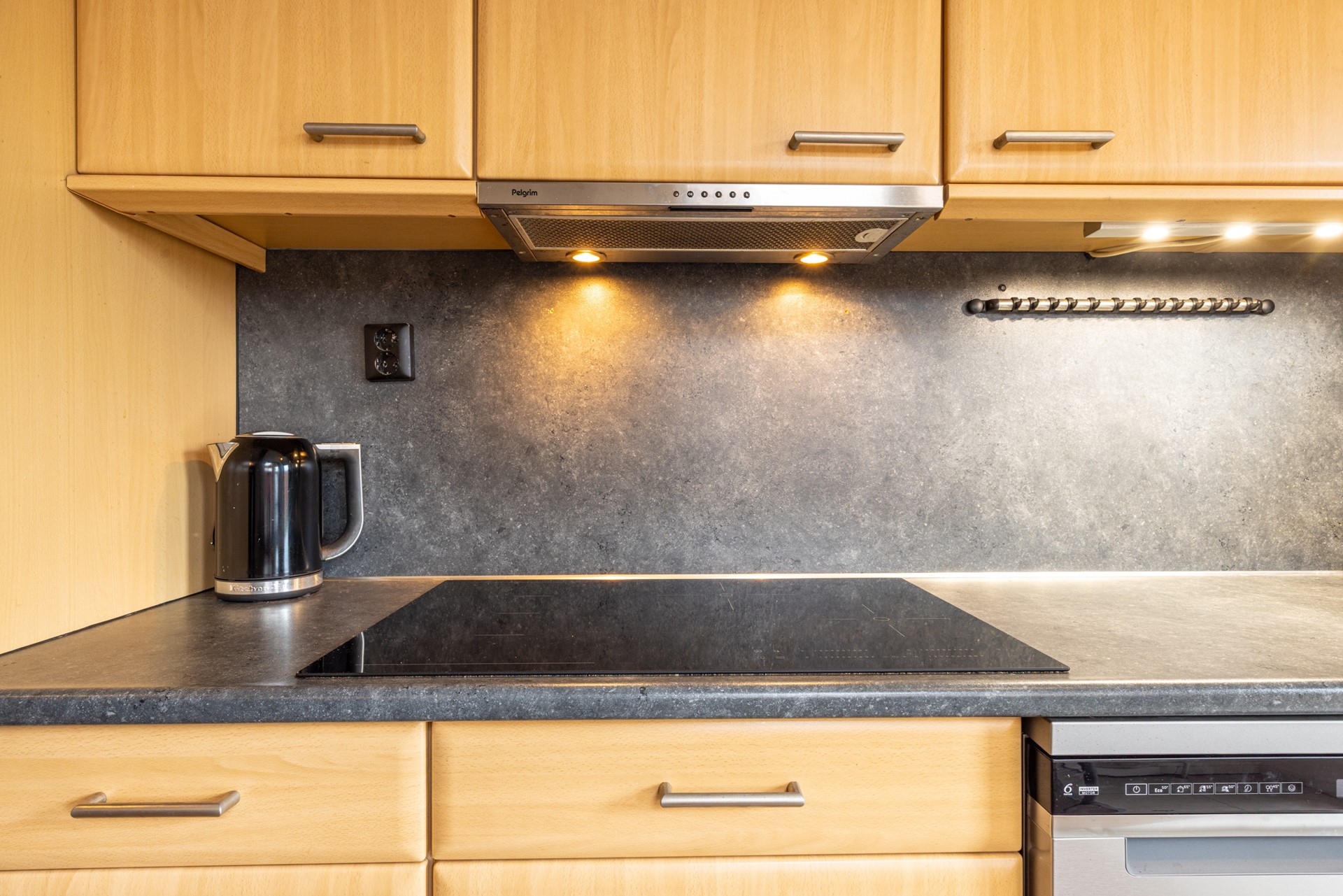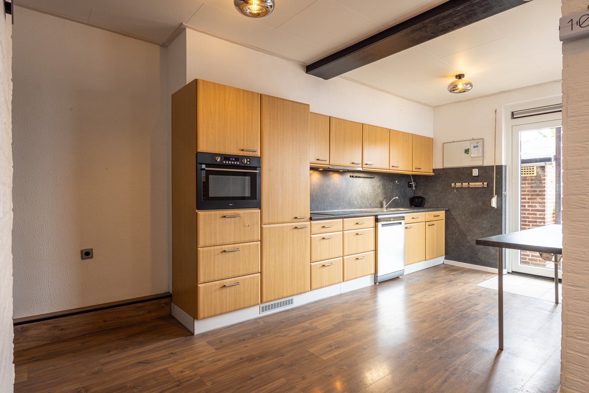 De voortuin is netjes en onderhoudsvriendelijk aangelegd. Via de entree met tegelvloer kom je in de ontvangsthal met garderobe, meterkast (vernieuwd in 2016) en toegang tot de provisiekelder. In deze kelder bevinden zich tevens de witgoedaansluitingen. Daarnaast is er op de begane grond een separaat toilet aanwezig, uitgerust met staand closet en fonteintje. De woonkamer is een fijne doorzonkamer met veel daglicht en een laminaatvloer. Dankzij de rolluiken is er eenvoudig een gezellige sfeer en privacy te creëren. De woonkamer loopt door in een uitbouw, waar de open keuken is gesitueerd. De keuken is eveneens voorzien van laminaatvloer en is zowel via de woonkamer als via de hal bereikbaar. Hier vind je volop kastruimte en inbouwapparatuur: keramische kookplaat, afzuiging, heteluchtoven, koelkast, vriezer en een vaatwasser (nieuw in 2025). Een muurkast biedt plaats aan de cv-installatie. Vanuit de keuken is er toegang tot de achtertuin.
