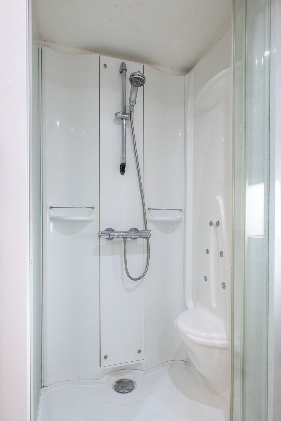 De badkamer (2011) is modern en compleet: geheel betegeld, met een zwevend badkamermeubel met wasbak en spiegel, een toilet en een inloopdouche met glazen wand. De badkamer is compact maar compleet ingericht met een douchecabine, wastafel, zwevend toilet en raam met Dauerlüftung en rolluik. Via de kastruimte in de kleine slaapkamer is middels een losse trap de bergzolder te bereiken.
