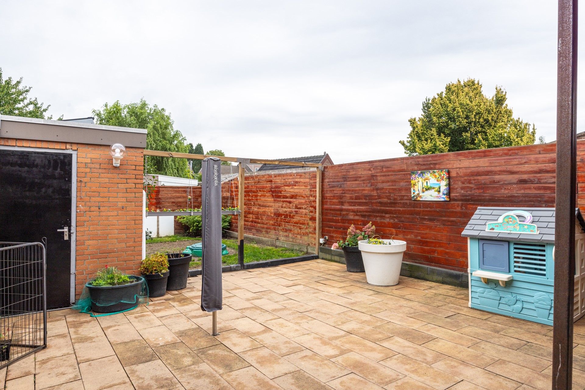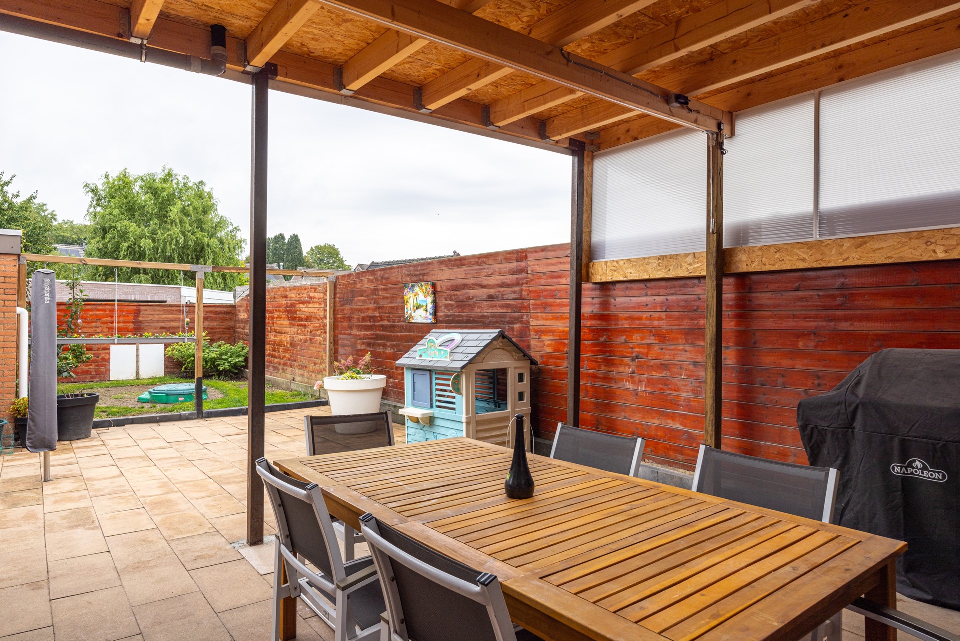 De achtertuin is onderhoudsvriendelijk aangelegd en biedt verrassend veel ruimte en privacy. Direct achter de woning bevindt zich een royaal terras met een overkapping, voorzien van een lichtkoepel. Hierdoor kun je hier niet alleen tijdens zonnige dagen, maar ook bij minder weer heerlijk buiten zitten. Verder is er voldoende plek voor groen of speelruimte en staat er een praktische schuur voor extra bergruimte. Via de tuin bereik je de ruime garage met sectionaalpoort, die ook toegankelijk is vanaf de achterzijde van het perceel.