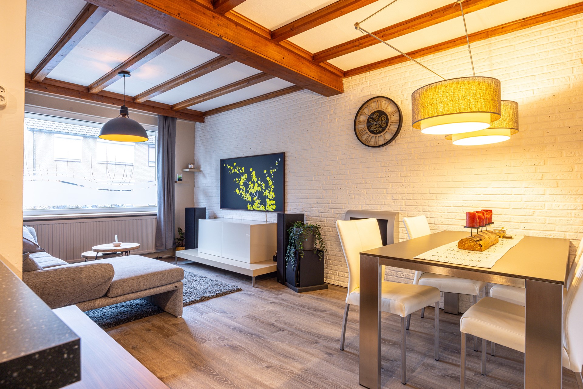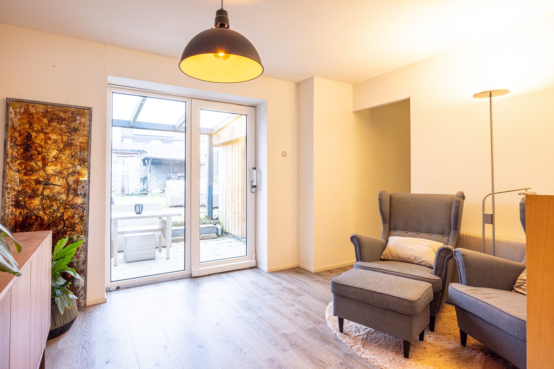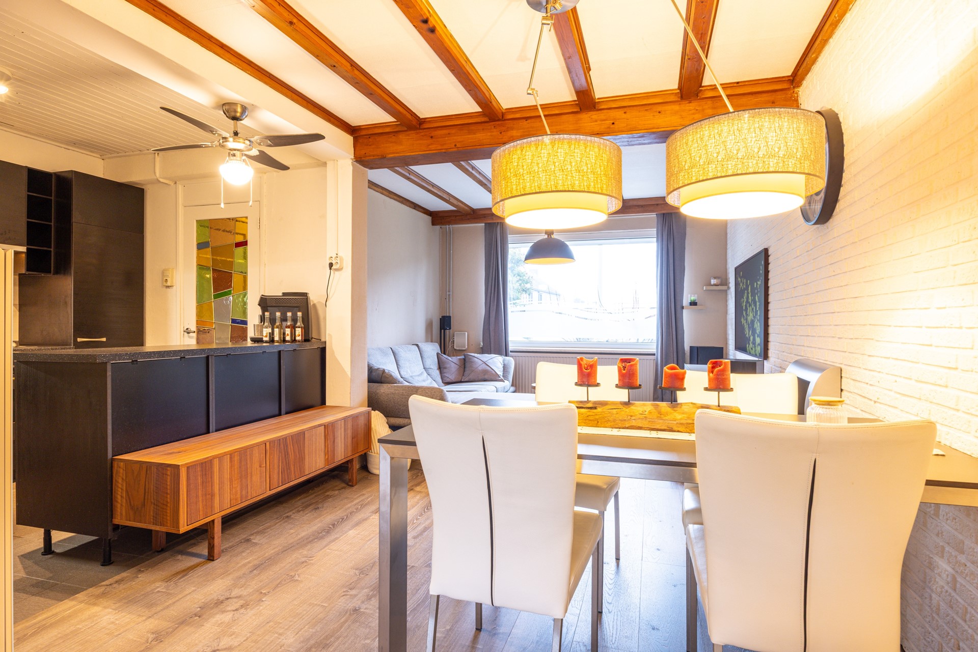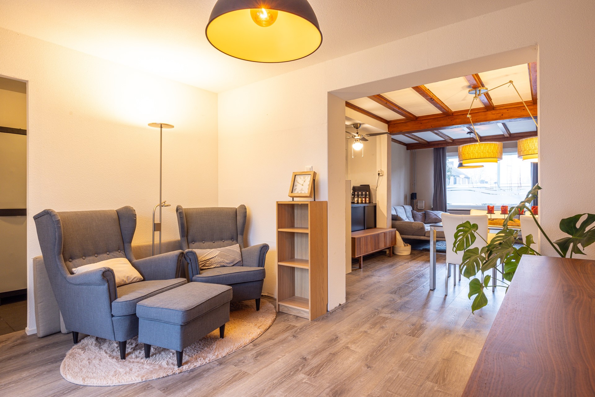 De woonkamer is afgewerkt met een pvc vloer en voorzien van kunststof kozijnen met dubbel glas. De ruimte biedt voldoende plaats voor een comfortabele zithoek en staat in verbinding met de aangrenzende zitkamer. Deze extra zitkamer vormt een fijne aanvulling op de leefruimte en kan naar wens worden ingericht, bijvoorbeeld als extra zithoek of eethoek. Vanuit deze ruimte is er directe toegang tot de bijkeuken en de achtertuin, wat zorgt voor een prettige verbinding tussen binnen en buiten.