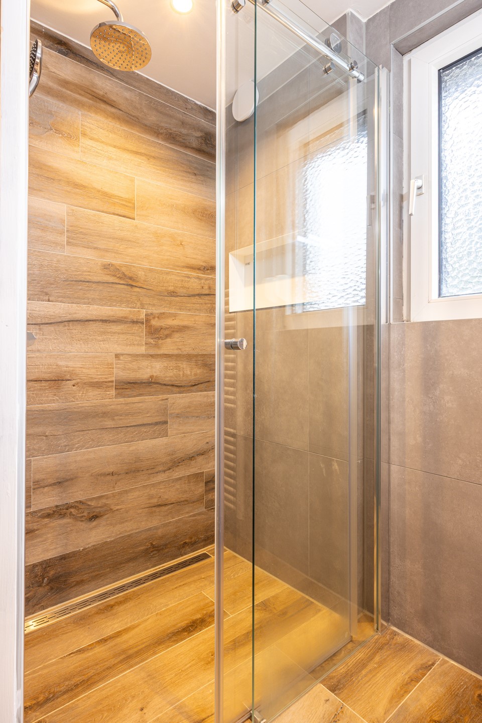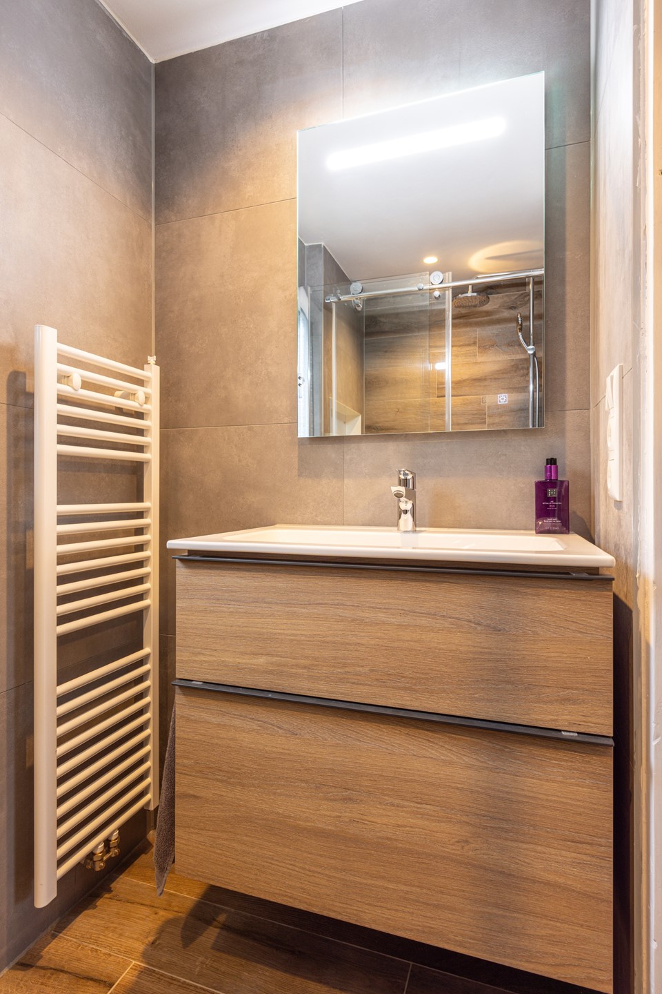 De badkamer is volledig betegeld en verzorgd ingericht en is in 2023 vernieuwd. Deze ruimte beschikt over een inloopdouche, een zwevend badkamermeubel met wastafel en een spiegel met verlichting. Daarnaast is er een designradiator aanwezig. Ook de badkamer is voorzien van kunststof kozijnen met dubbel glas en een rolluik.
