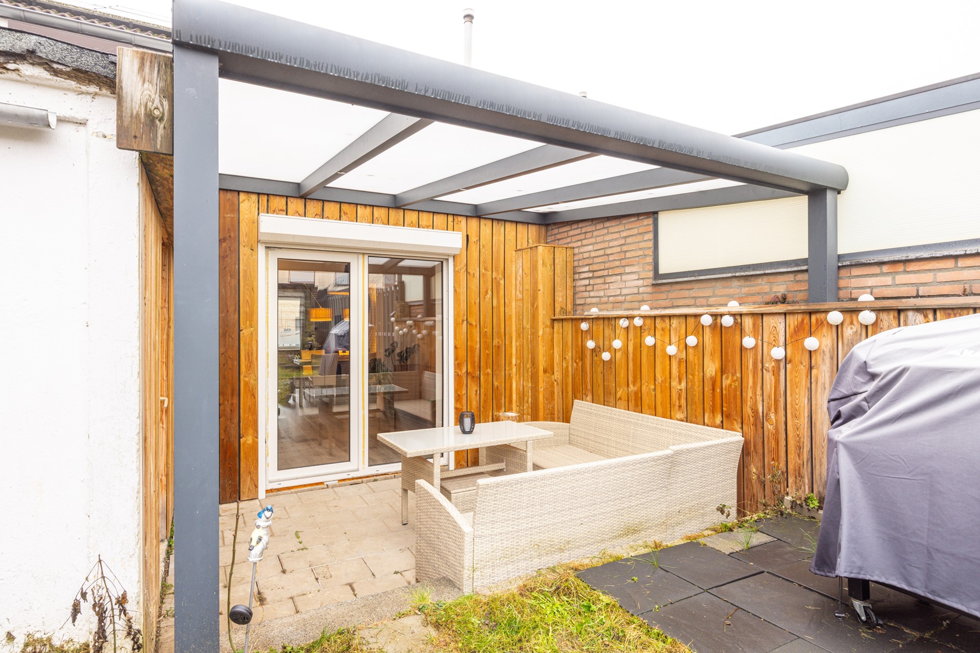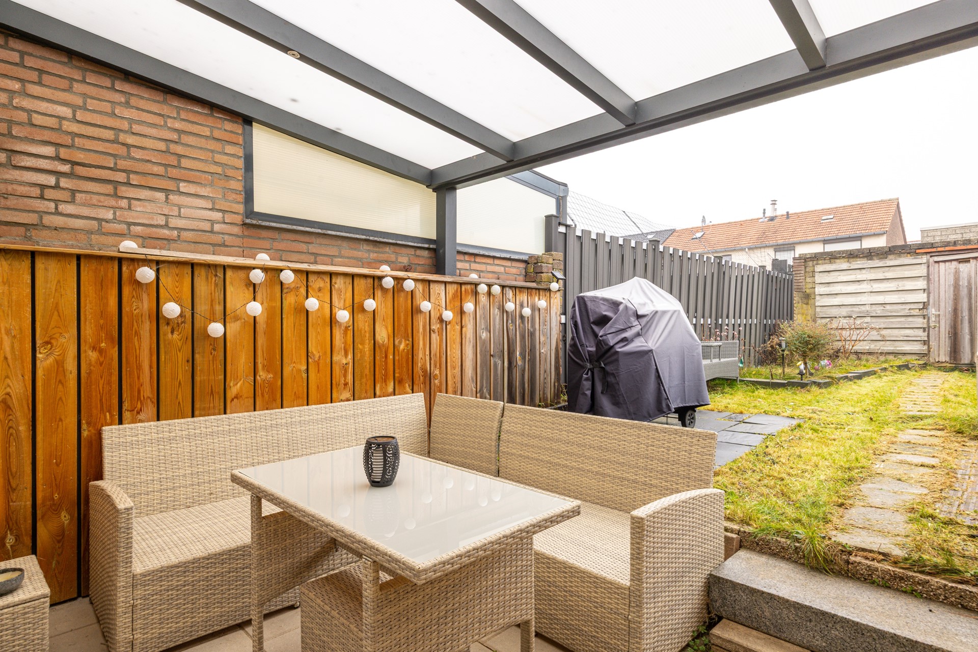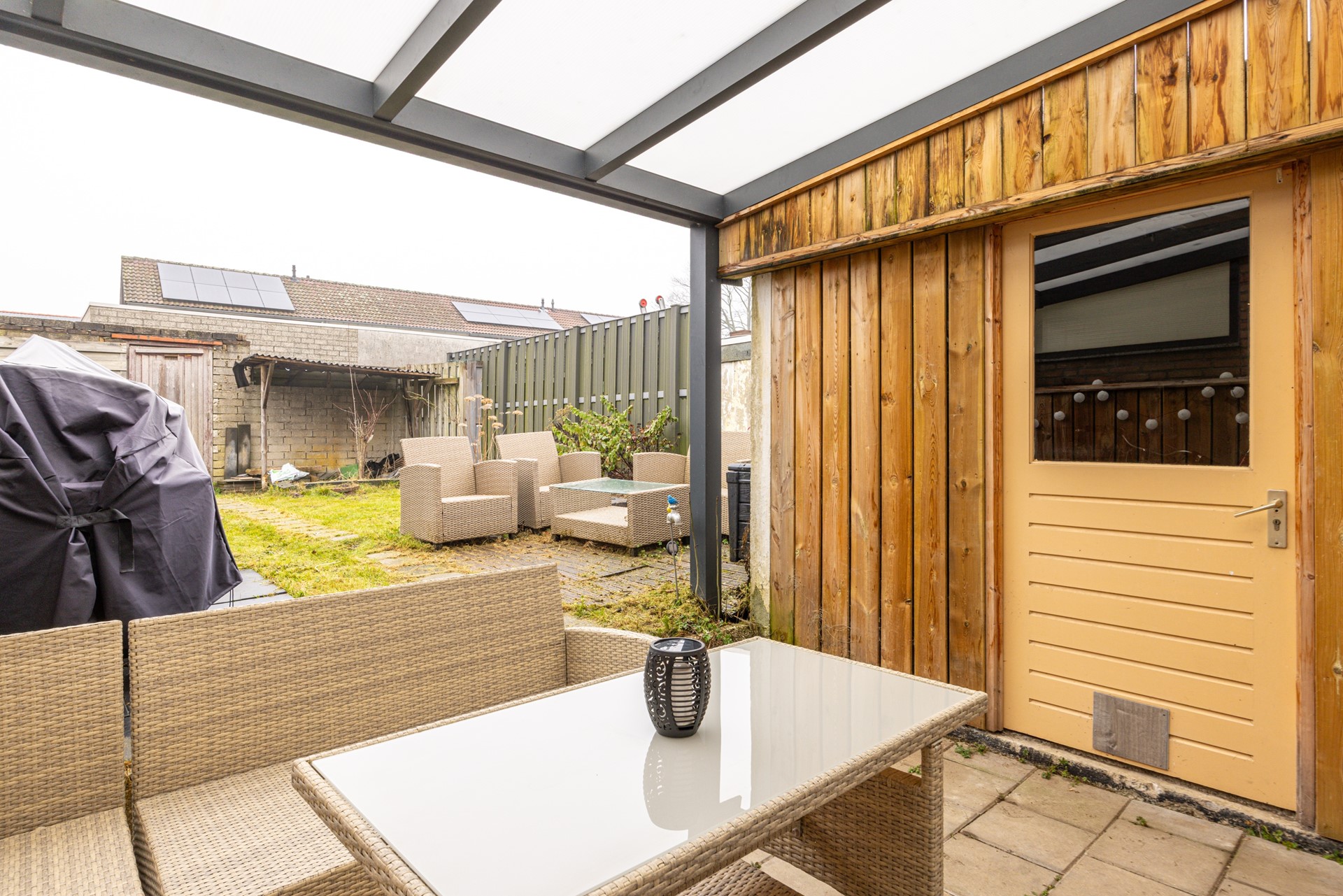 - Achtertuin met overkapping, berging en eigen achterom