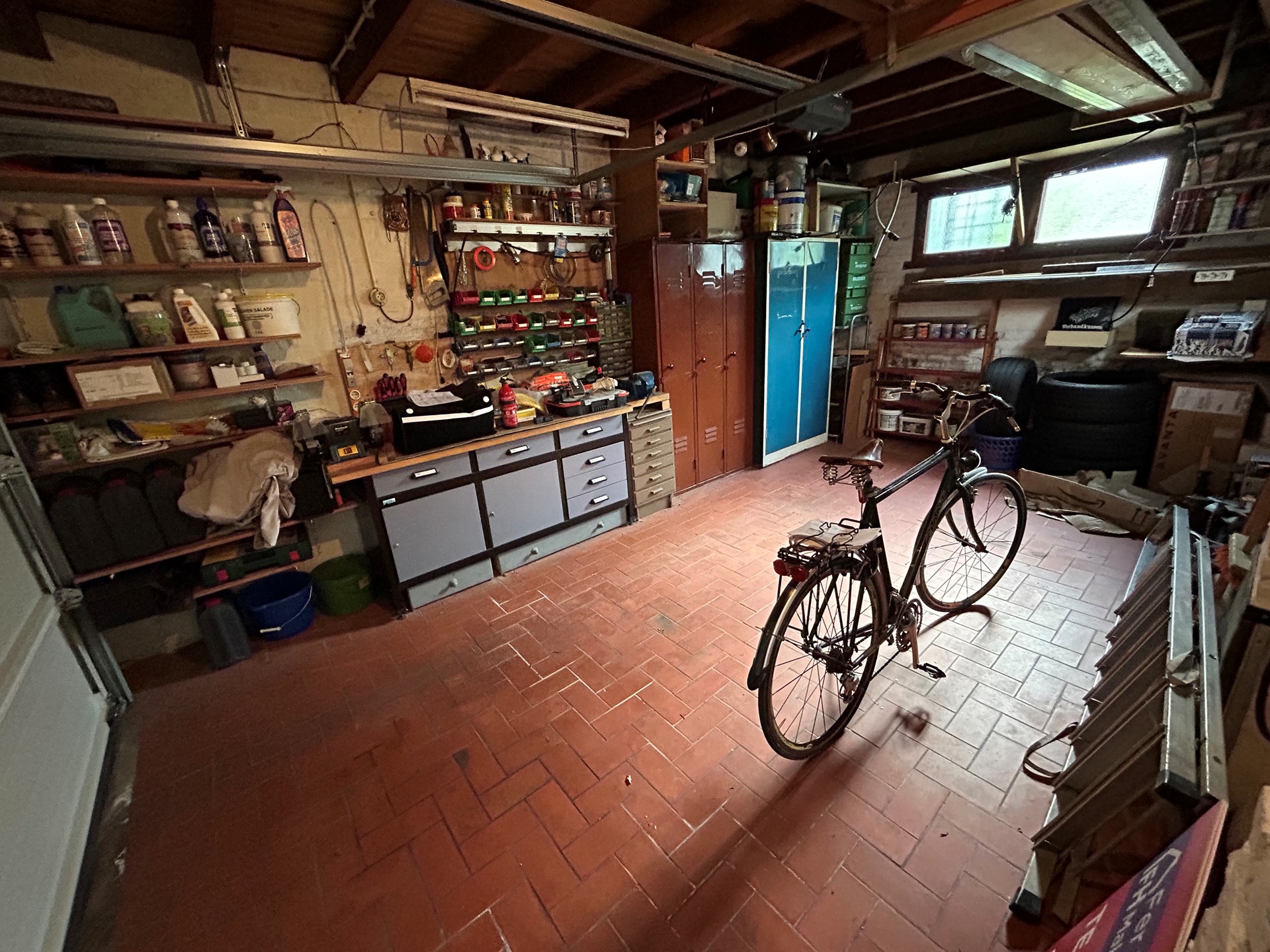 Garage 5,65 x 3,30 met elektrisch bedienbare sectionaal poort, plavuizenvloer en elektriciteit. Plafondhoogte is 2,60 m.