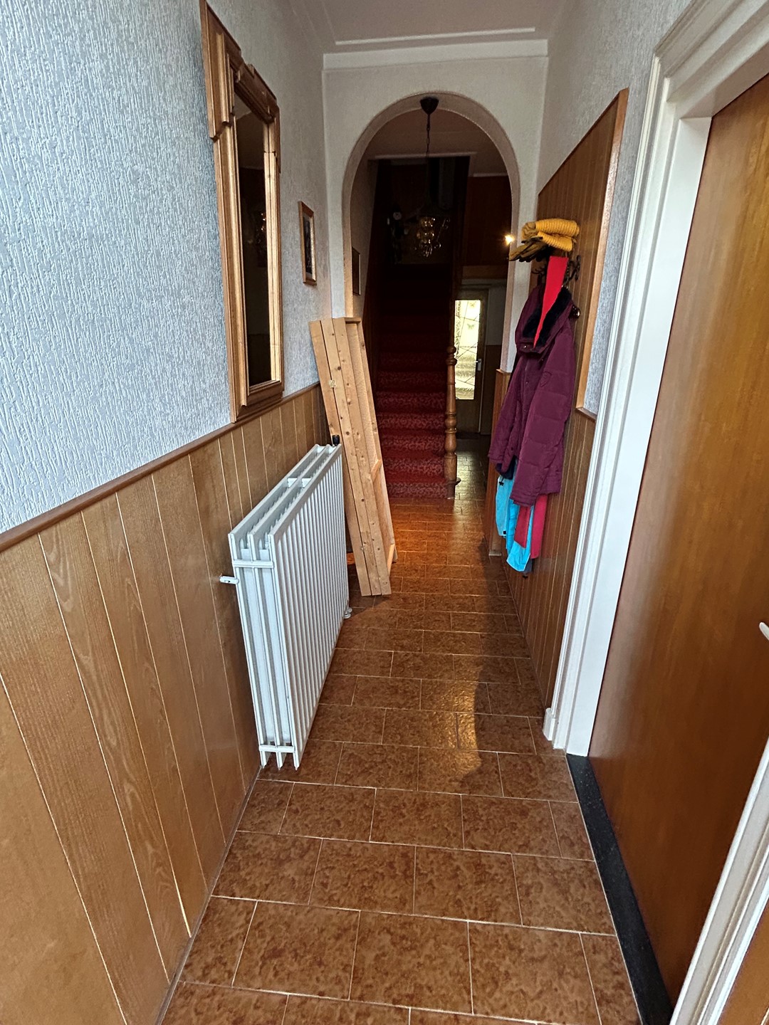 Entree/gang 8,10 x 1,75/1,20 met plavuizenvloer, nieuwe meterkast met slimme meters, 2 deuren naar woonkamer, deur naar keuken en kelder en trap naar verdieping.