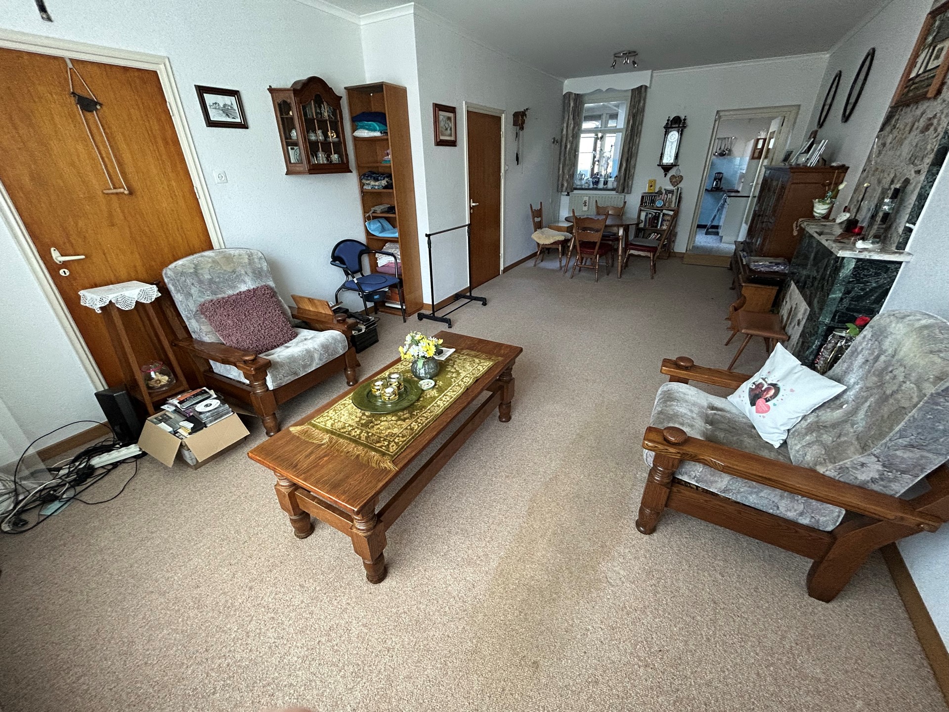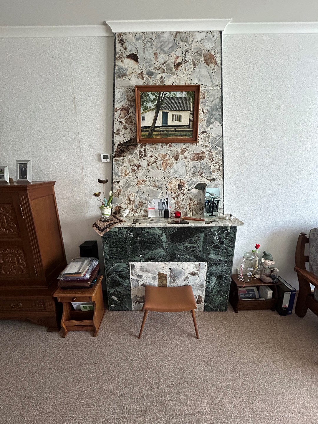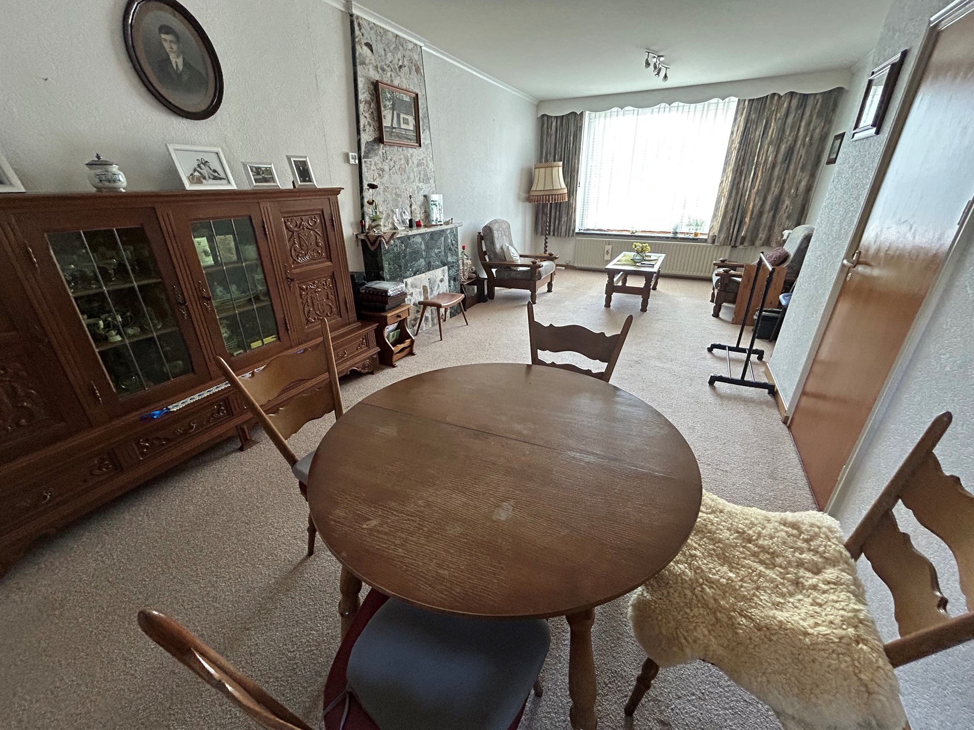 Ruime woonkamer 8,05 x 4,05/3,45 met vloerbedekking, spanplafond, schouw met mogelijkheid om kachel aan te sluiten en deur naar keuken.