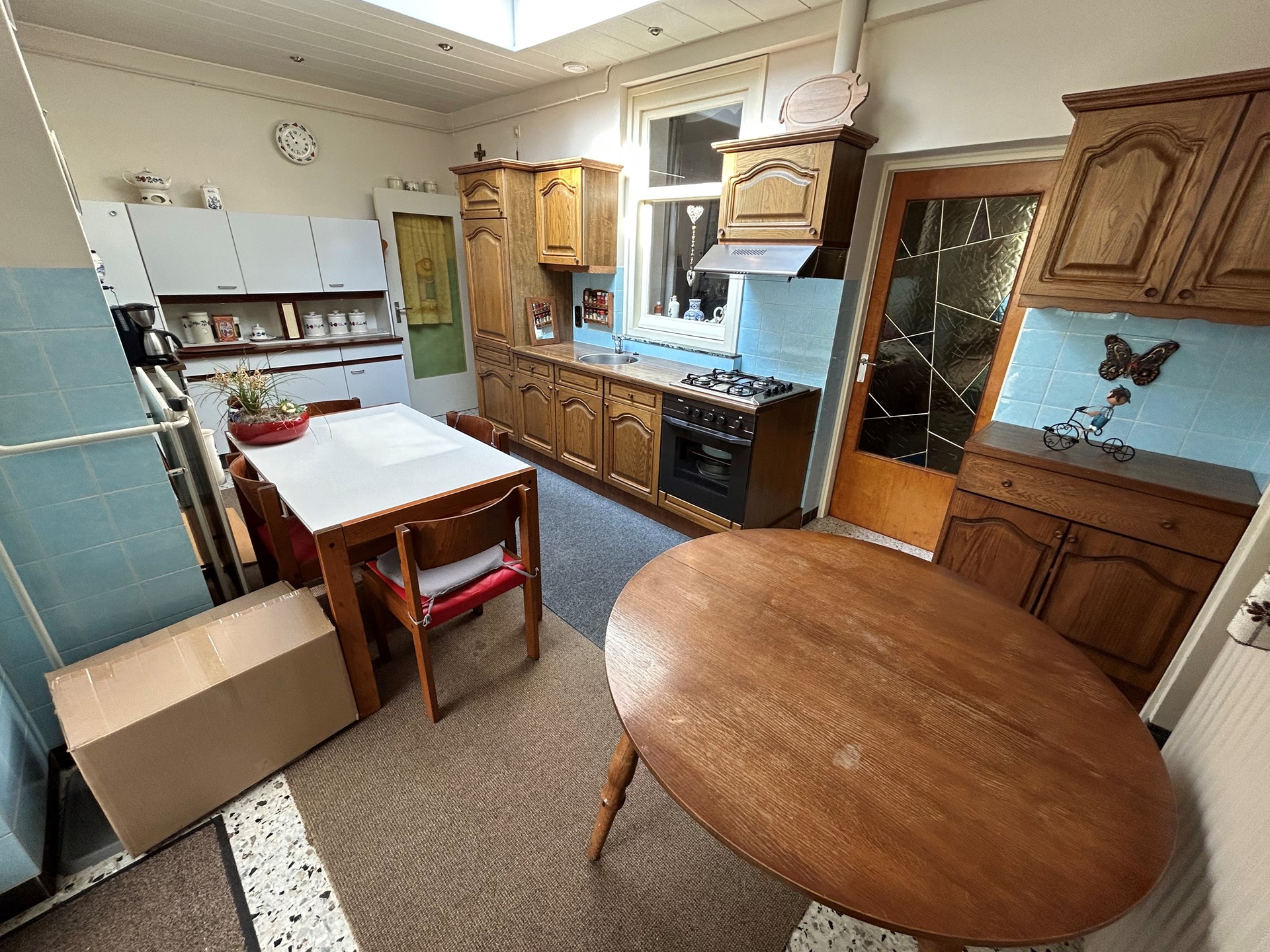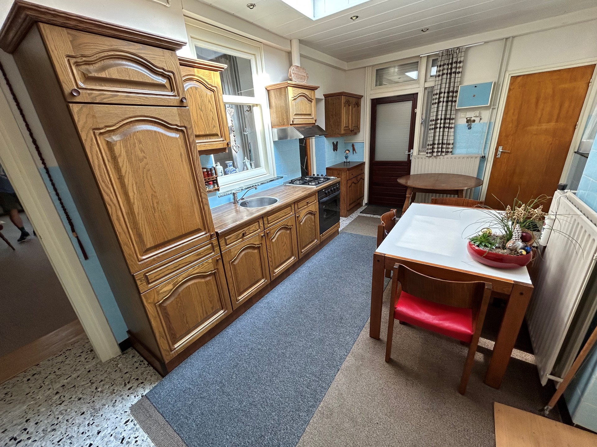 Keuken 5,50 x 3,25/2,70 met plavuizenvloer, inbouwspots, lichtkoepel, deur met hor naar serre, oprit, garage, gang, en bijkeuken en aanbouwkeuken met 4-pits gasfornuis met afzuigunit, bakoven, koelkast en spoelbak.
