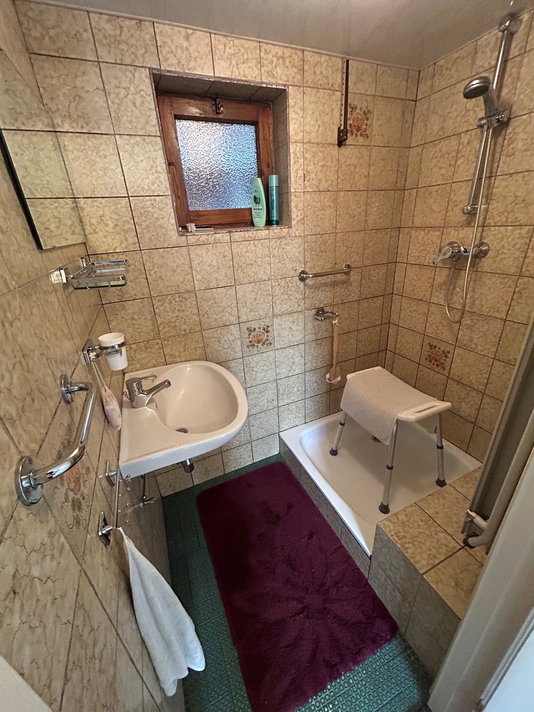 Badkamer 1,70 x 1,25 met tegelvloer, douche en wastafel.
