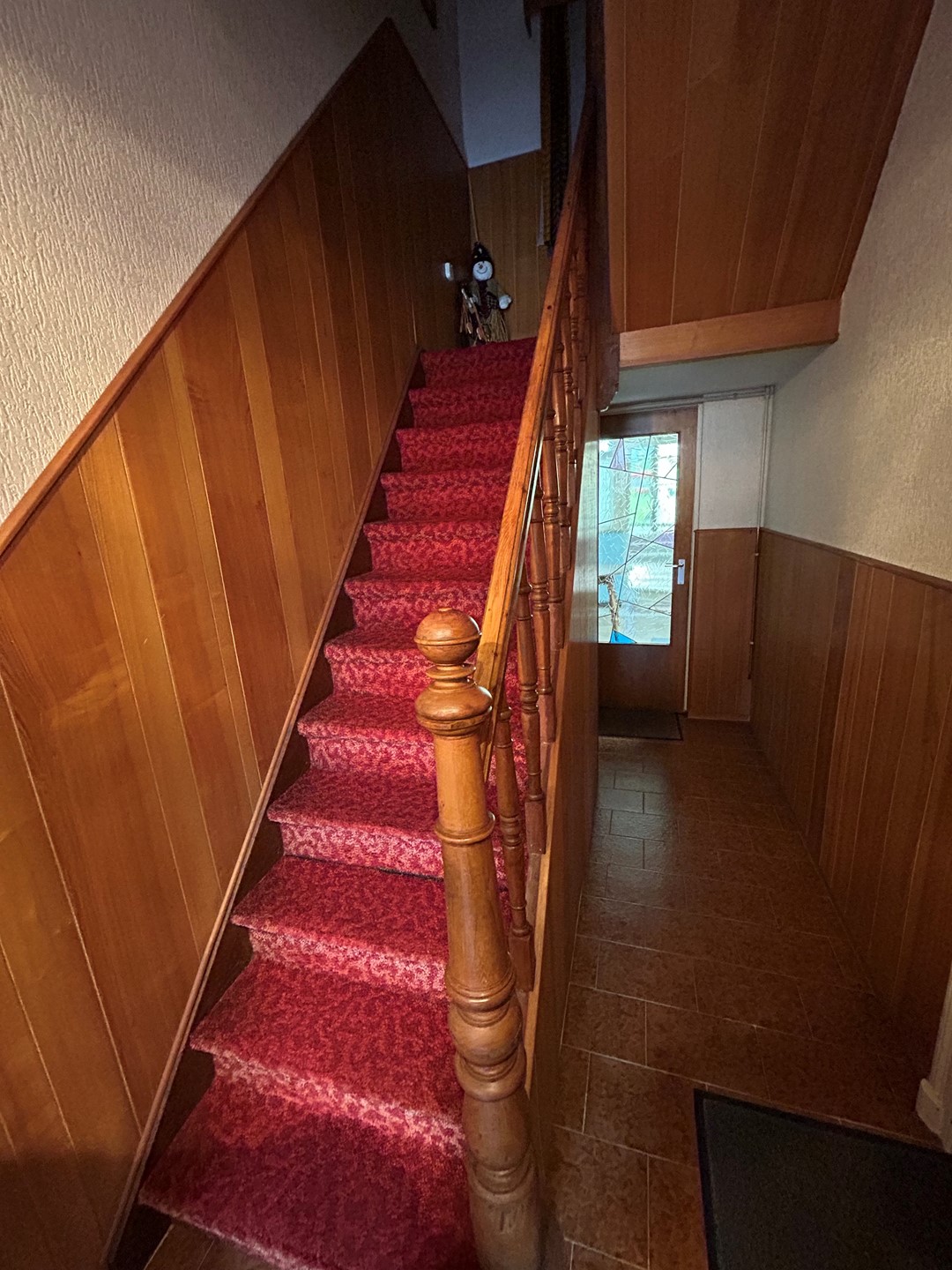 Overloop 3,35 x 1,80 met vloerbedekking en vaste trap naar tweede verdieping.