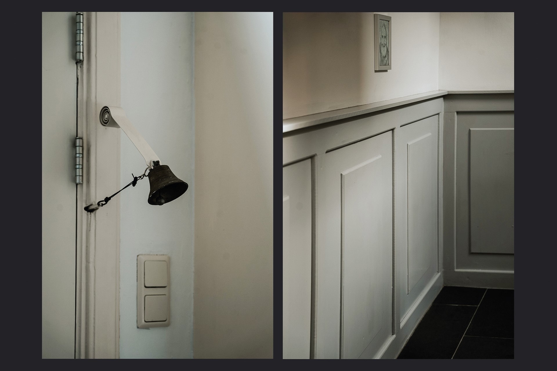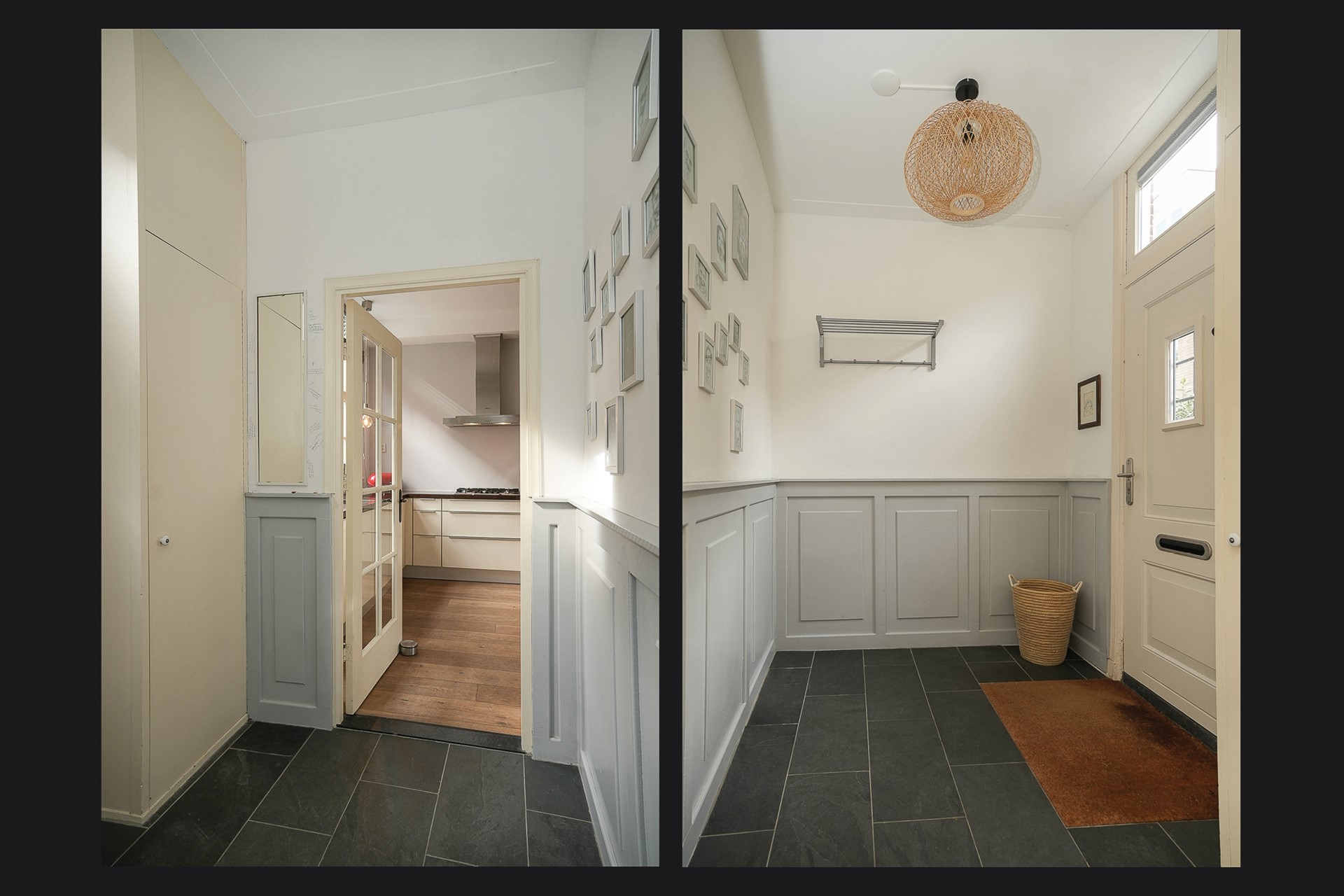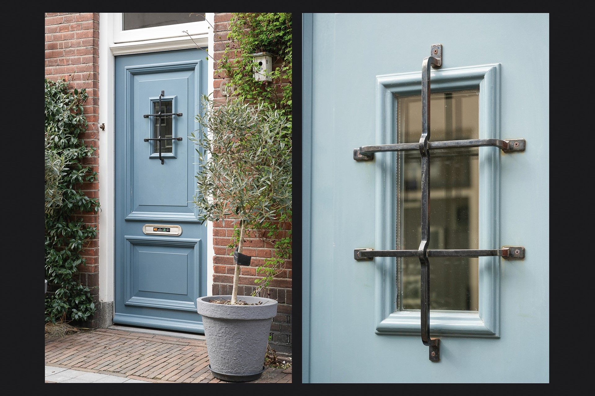 De blauwe voordeur met smeedijzeren detail is het eerste wat je ziet, en vertelt al iets over het huis: zorgvuldig, met aandacht voor detail, afgewerkt. Binnen in de hal wordt dat meteen bevestigd. De tegelvloer, de houten lambrisering, de hoge plafonds. Dit is geen standaard tussenwoning.