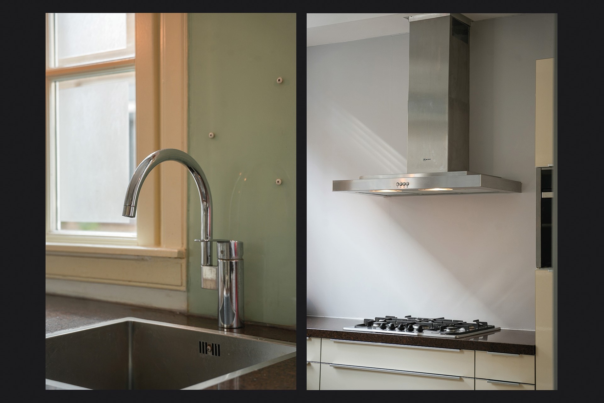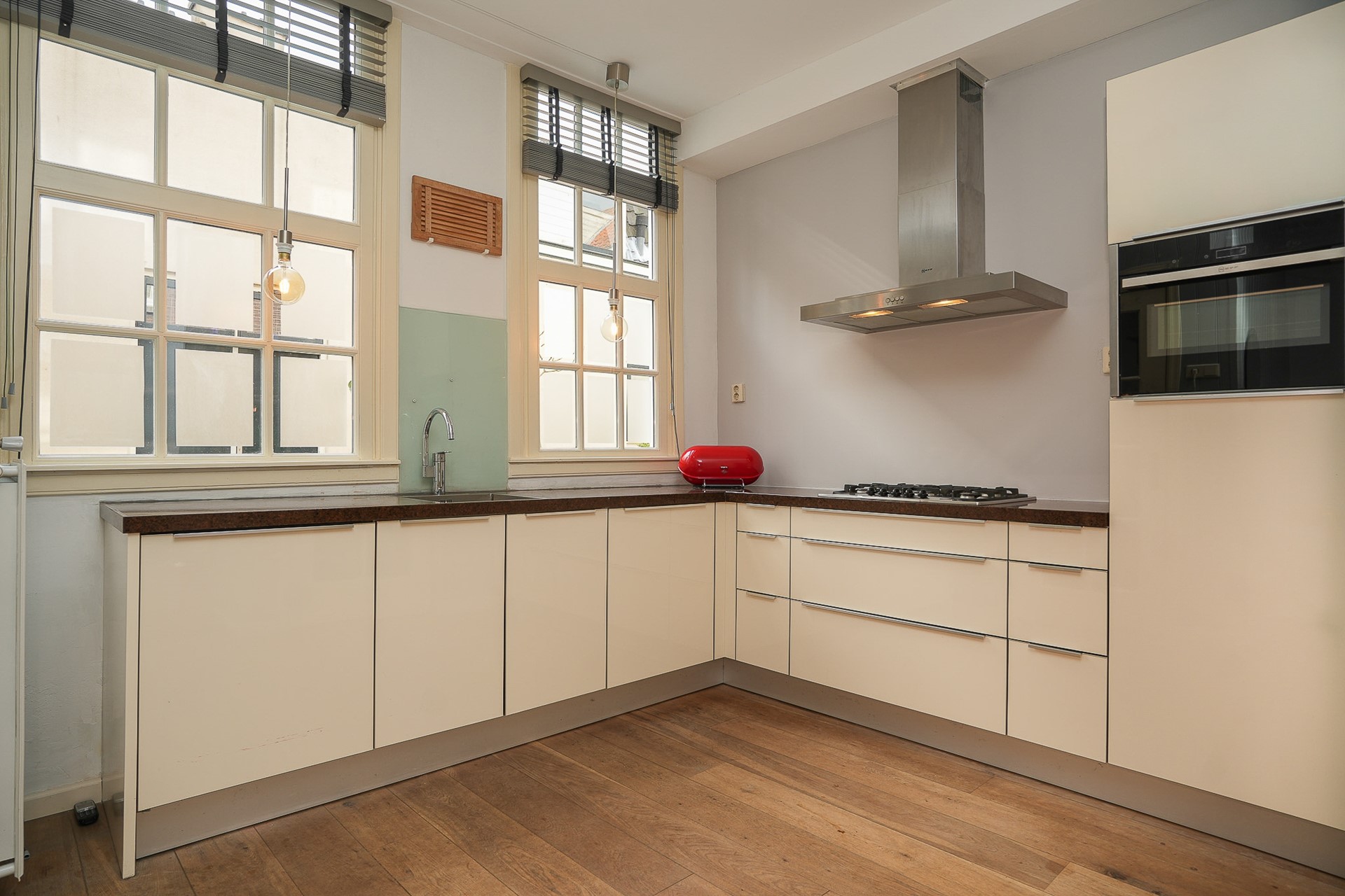 Via de hal loop je de keuken in. Licht, functioneel, met twee grote ramen die uitkijken op straat. De keuken is compleet uitgevoerd met een koelkast, kookplaat, afzuigkap, vaatwasser en combi-oven/magnetron.