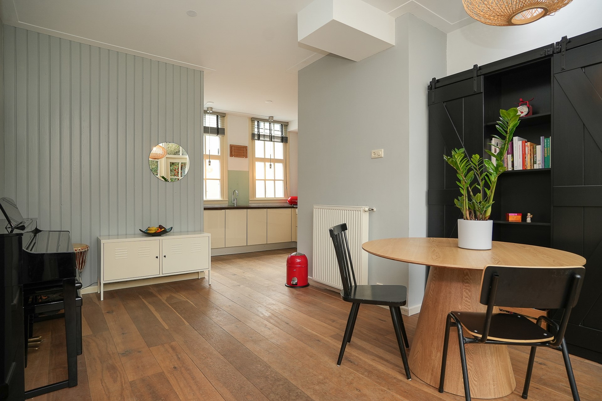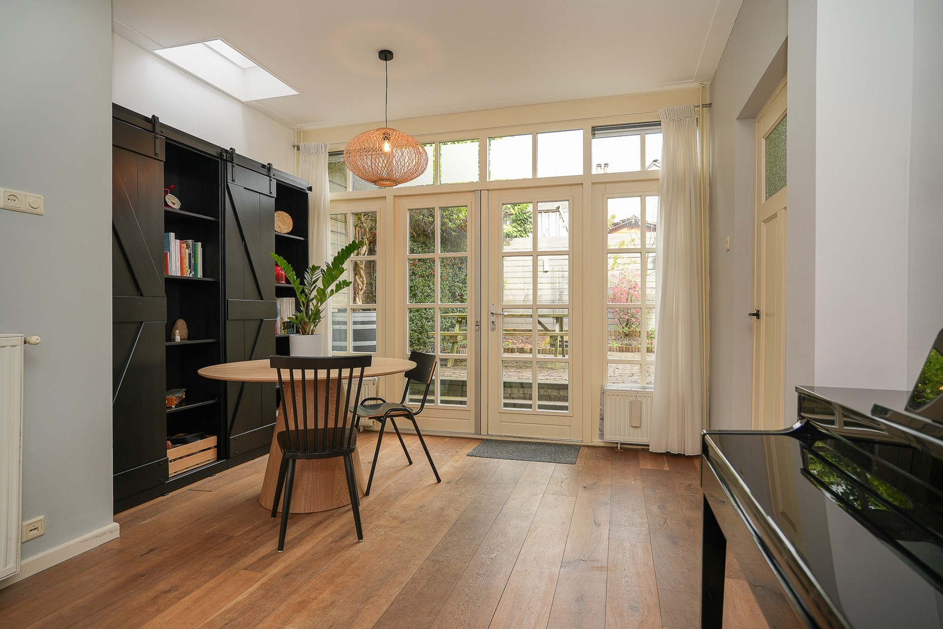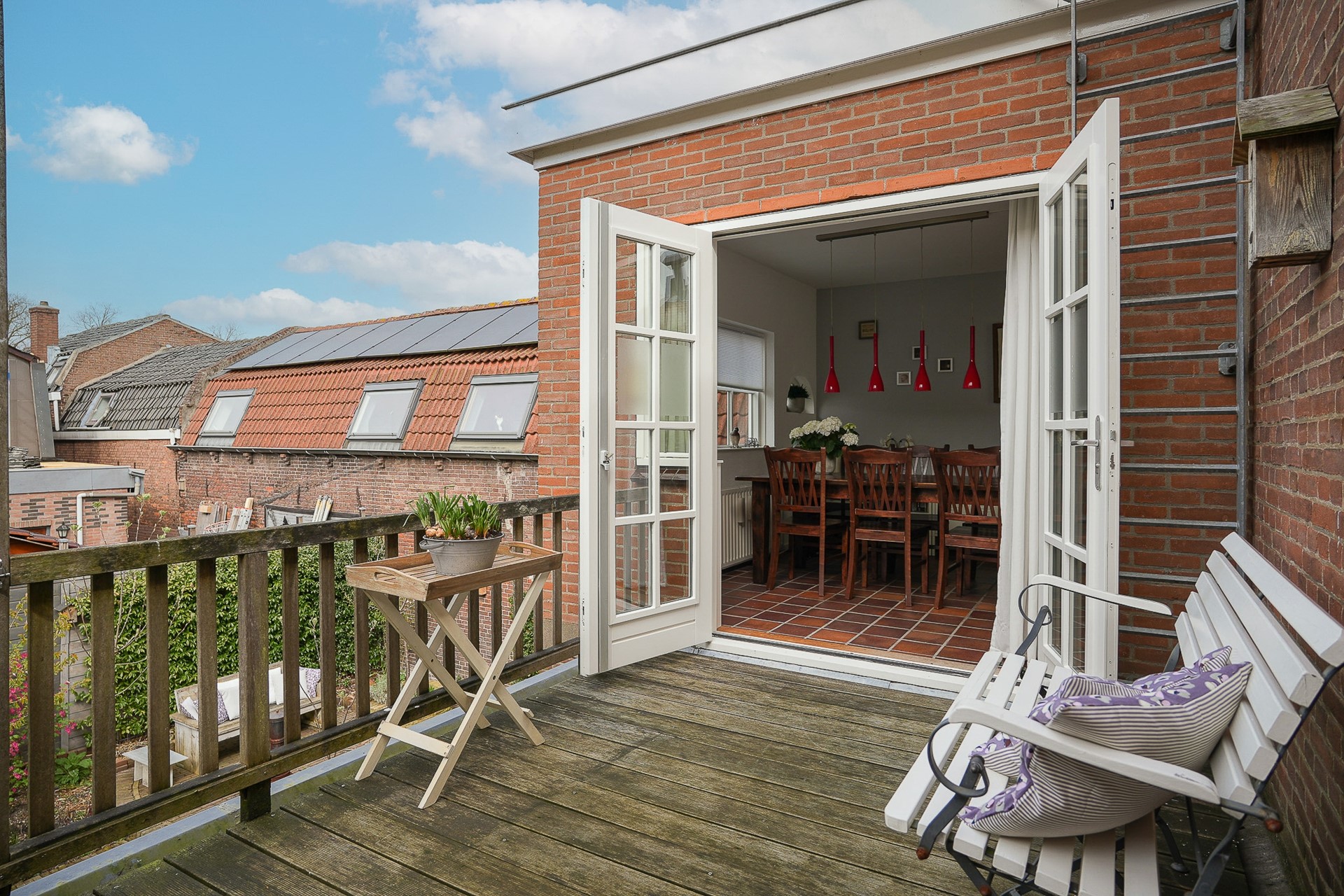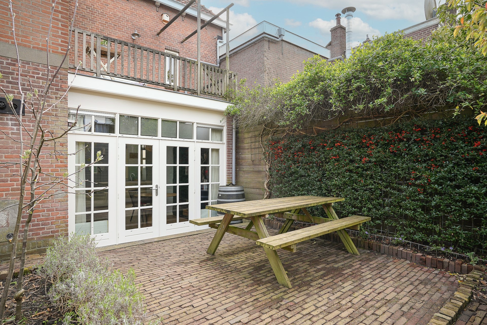 Via de openslaande deuren stap je direct vanuit de eetkamer naar buiten. En als je liever iets hoger zit, biedt het balkon op de eerste verdieping een tweede buitenplek met uitzicht over de binnentuinen van de buurt.