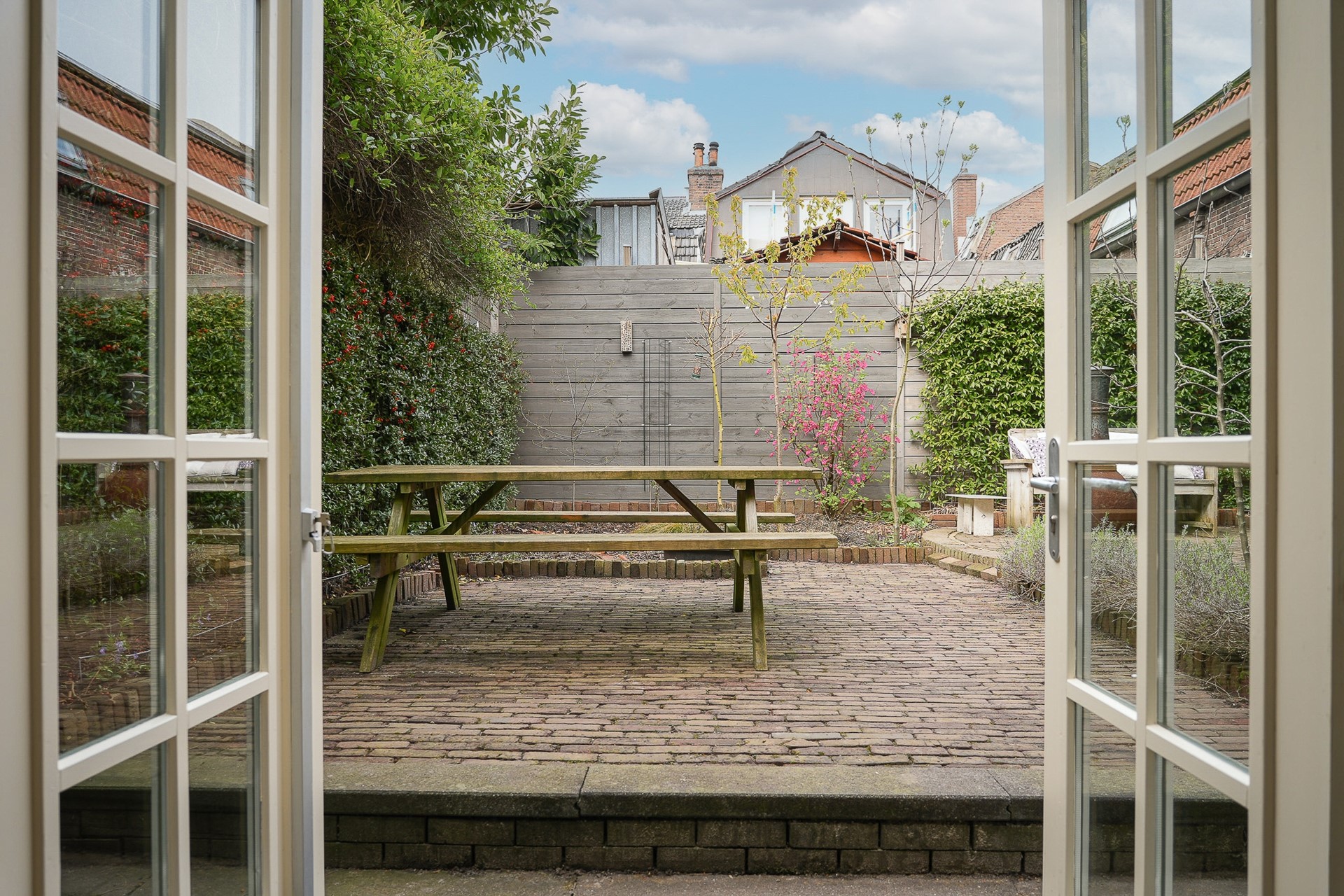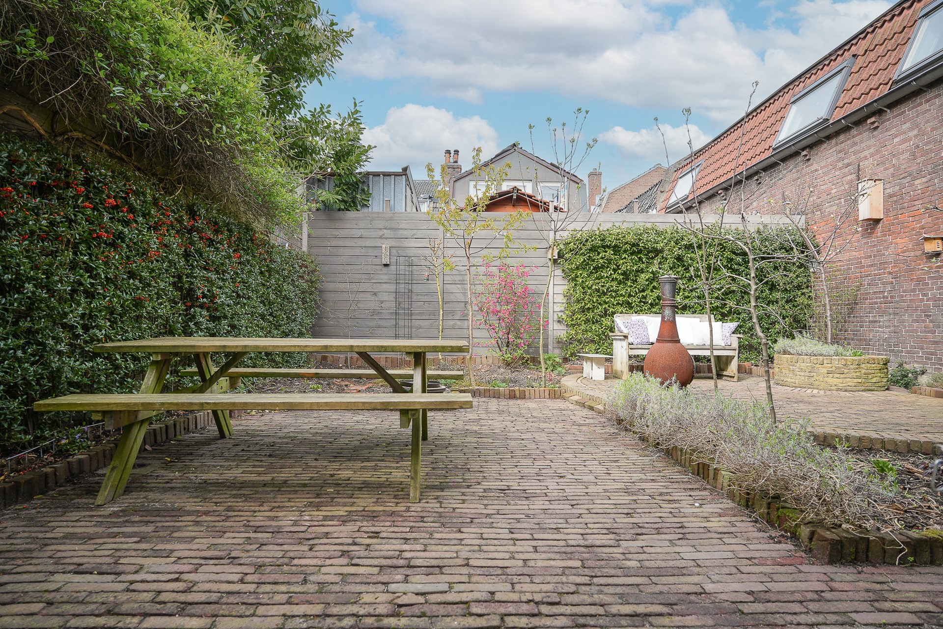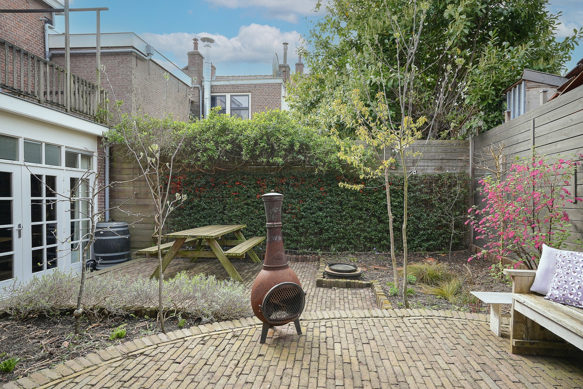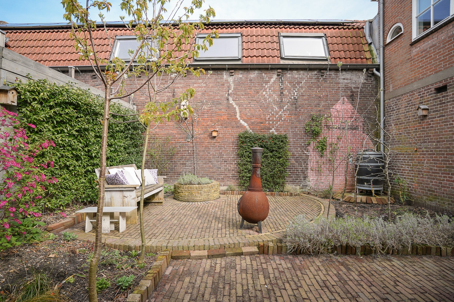 De achtertuin is recent volledig gerenoveerd en ademt dezelfde zorg als de rest van het huis. Oude klinkers, verhoogde borders met vaste planten, een ronde zithoek met een cortenstalen vuurpot en een zelfgemaakte WADI die regenwater opvangt en duurzaam verwerkt. Rondom volwassen beplanting en hagen die privacy geven.