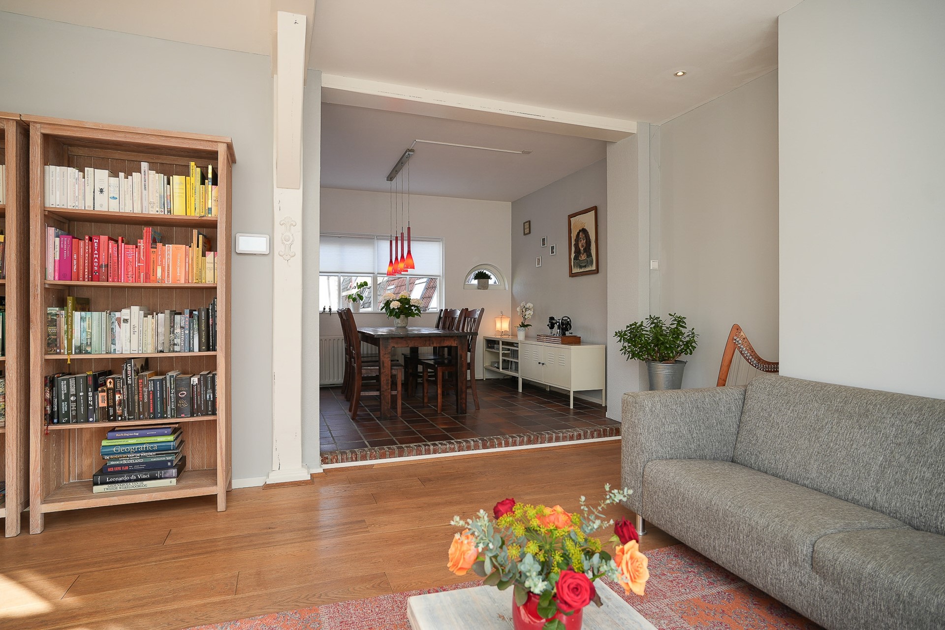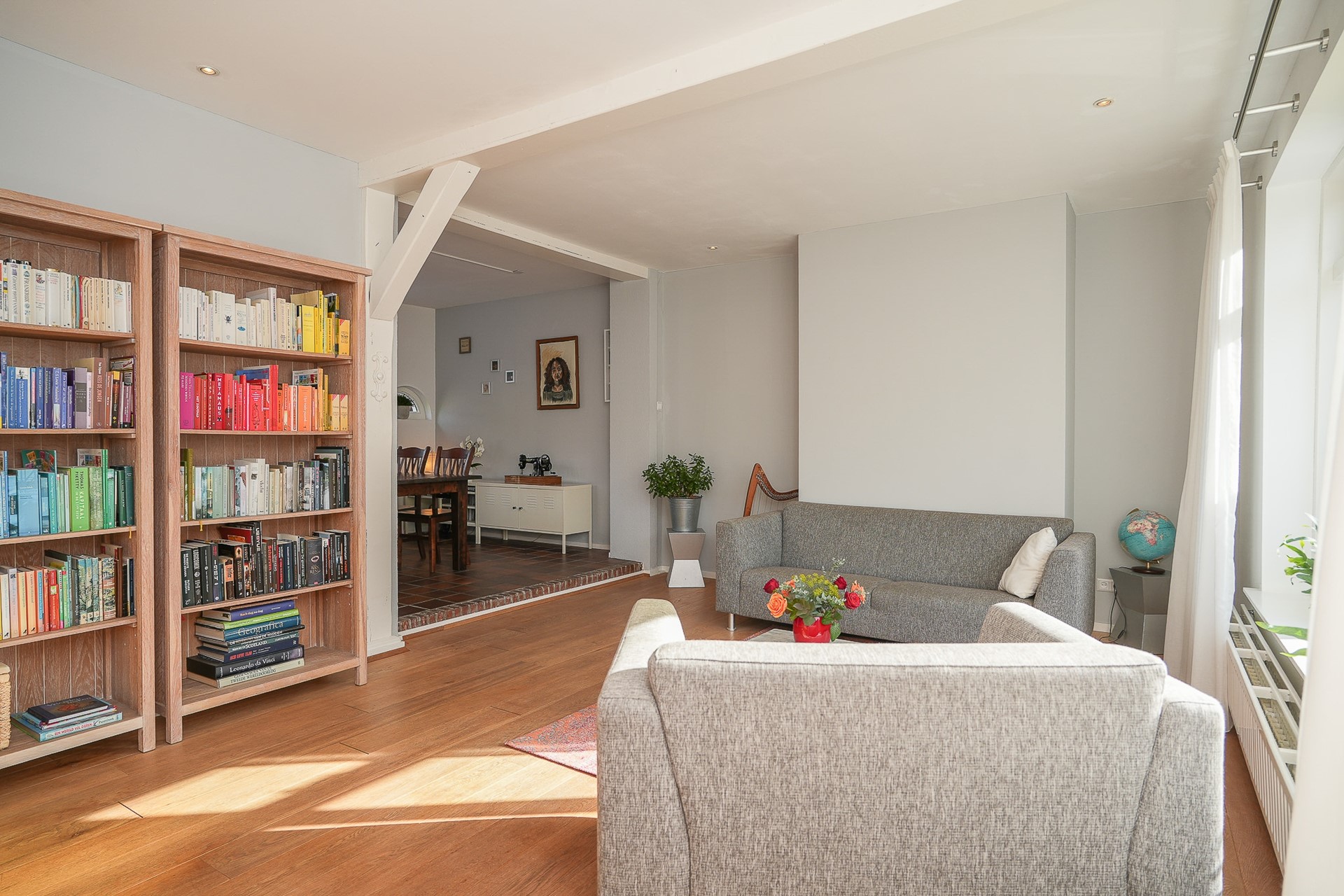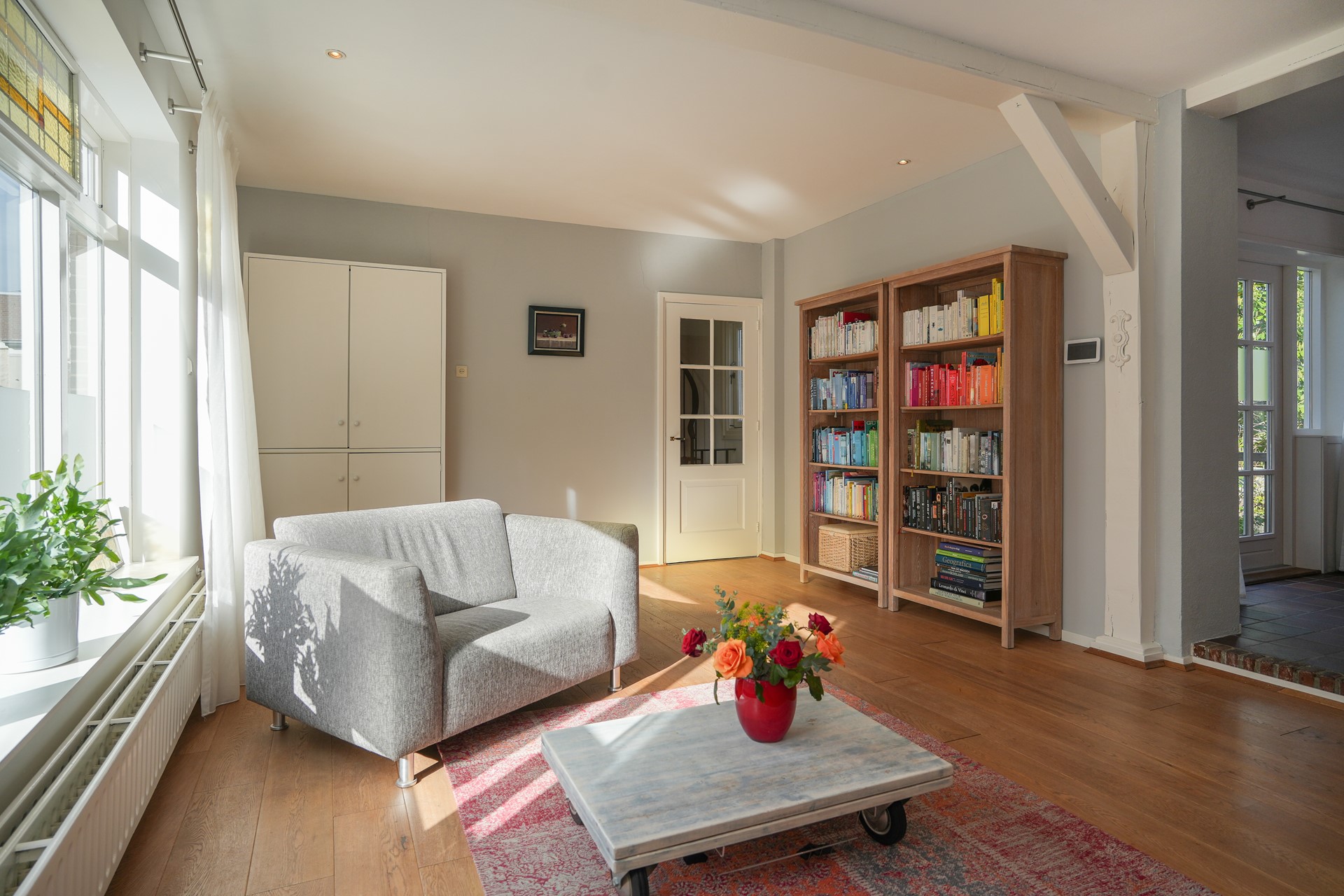 De woonkamer aan de voorzijde is ruim, licht en heeft karakter. Het grote raam met het originele art-deco glas-in-lood bovenraam geeft de kamer iets dat je niet kunt kopen: authenticiteit. De zon valt mooi binnen, de zichtbare houten balk in het plafond geeft warmte.