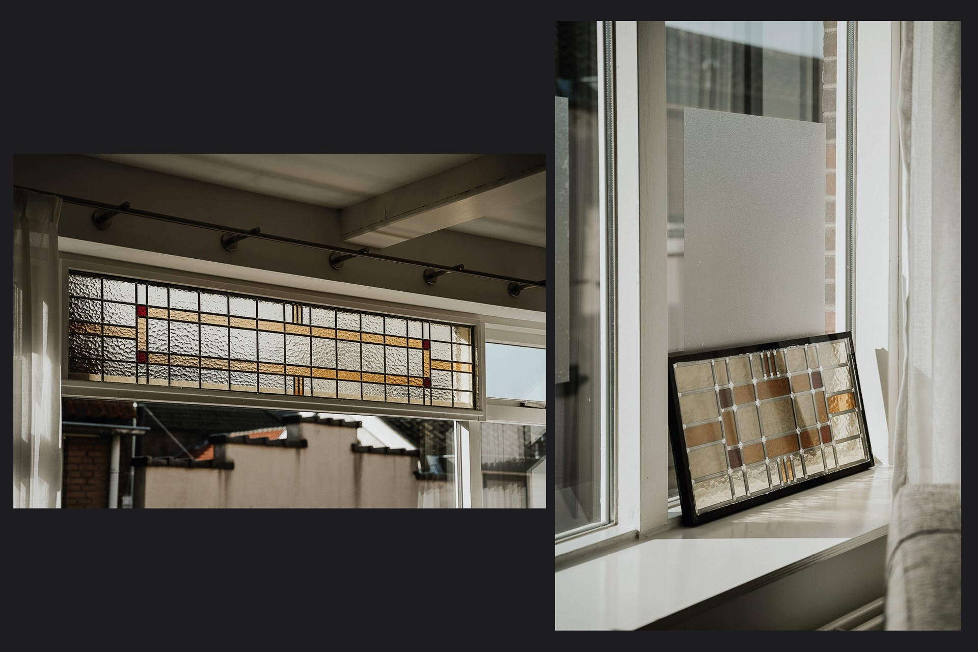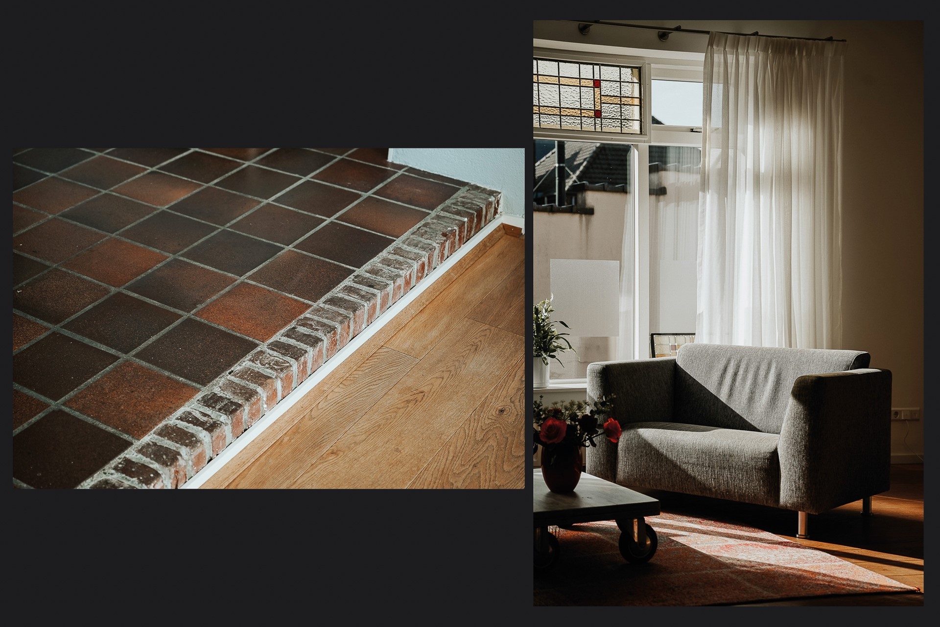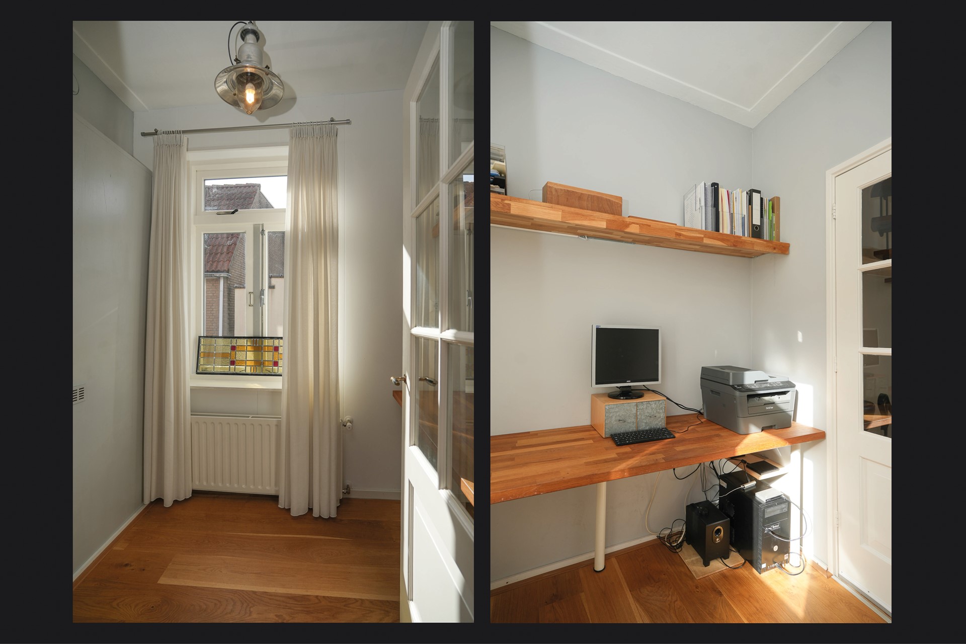 De woonkamer aan de voorzijde is ruim, licht en heeft karakter. Het grote raam met het originele art-deco glas-in-lood bovenraam geeft de kamer iets dat je niet kunt kopen: authenticiteit. De zon valt mooi binnen, de zichtbare houten balk in het plafond geeft warmte.