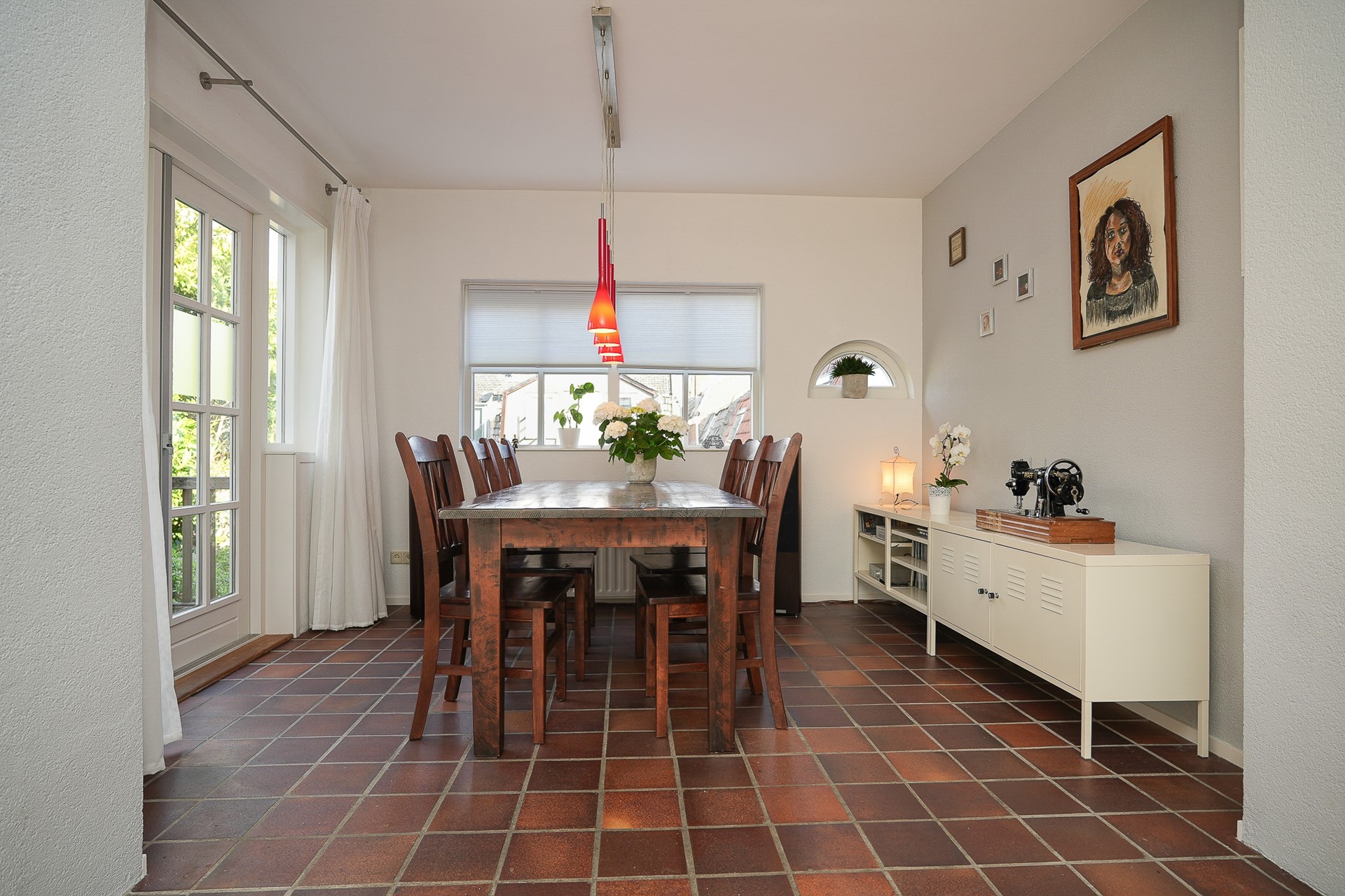 Die eetkamer heeft een terracotta tegelvloer die mooi contrasteert met de eikenhouten vloer van de woonkamer. De openslaande deuren geven toegang tot het balkon, uitkijkend over de binnentuinen van de buurt.
