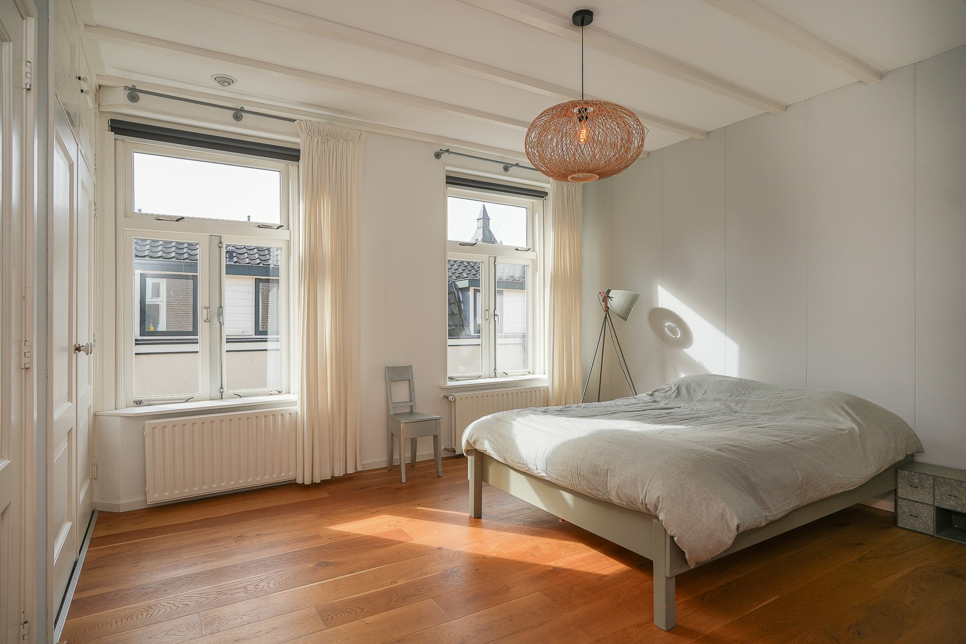 De tweede verdieping verrast met twee slaapkamers, een toilet, een tweede badkamer en praktische bergingen. De grootste kamer heeft ramen aan beide zijden, de kleinere kamer is compact maar goed bruikbaar. De eikenhouten vloer die op deze verdieping is gelegd geeft ook hier een warme uitstraling. De tweede badkamer met douche en wastafel én een separaat toilet maakt dat deze verdieping volledig zelfstandig functioneert.