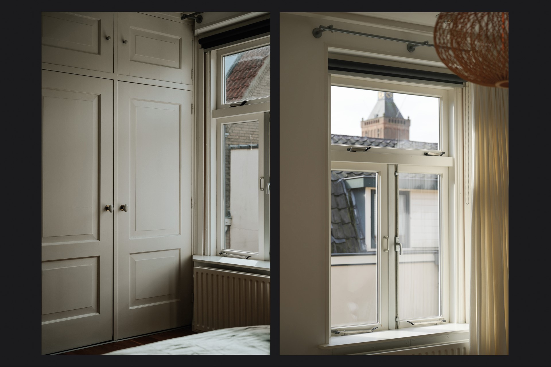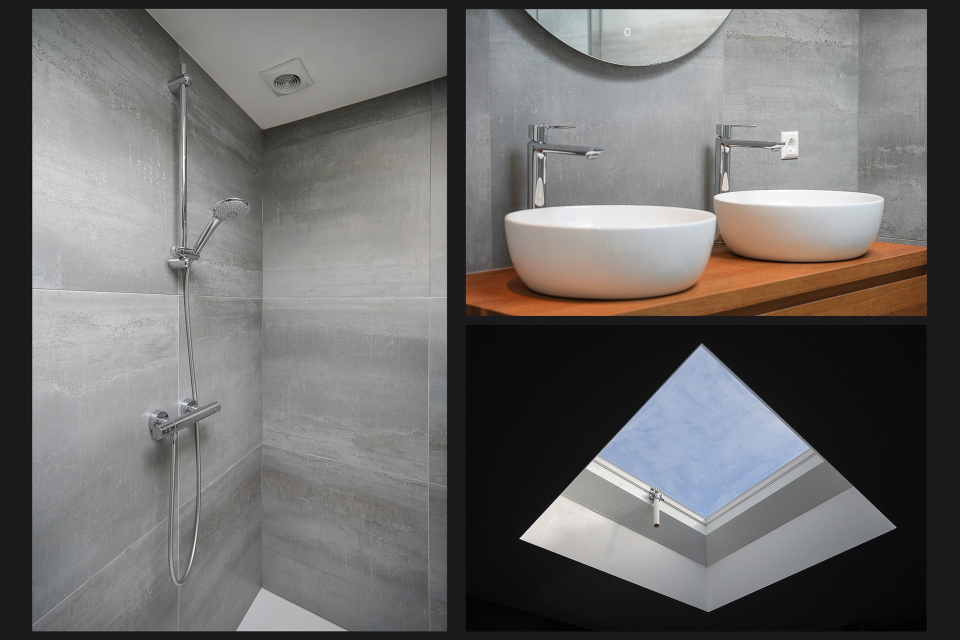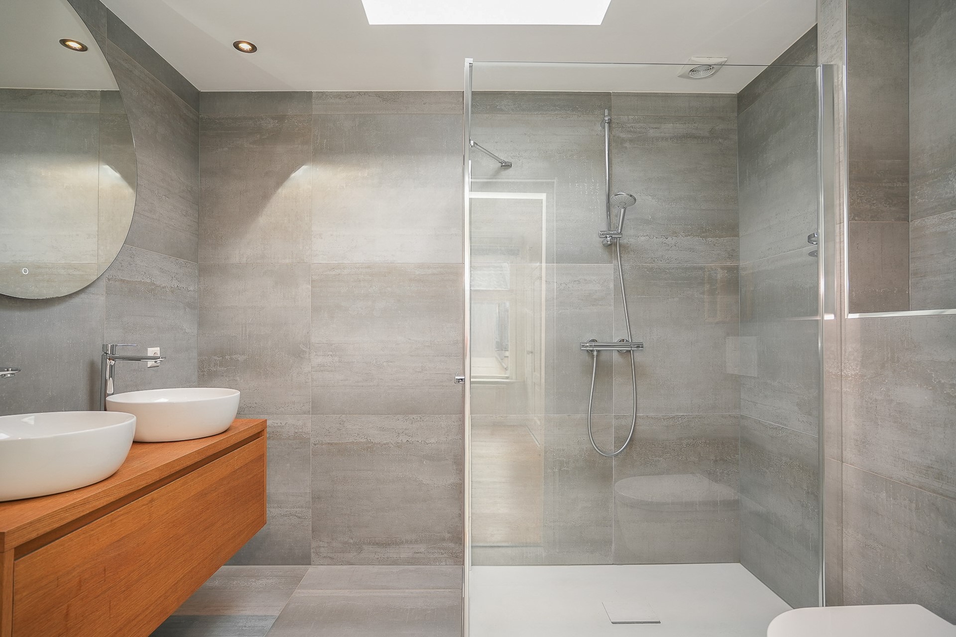 Op dezelfde verdieping liggen nog een ruime slaapkamer met ingebouwde kasten en uitzicht op de kerktoren, en een kleinere kamer die uitstekend dienst doet als werkkamer of kleedkamer. De badkamer is volledig gerenoveerd: grote grijze tegels, een inloopdouche, een dubbele wastafel en een toilet. De lichtkoepel zorgt voor daglicht. Hier begin je de dag goed.