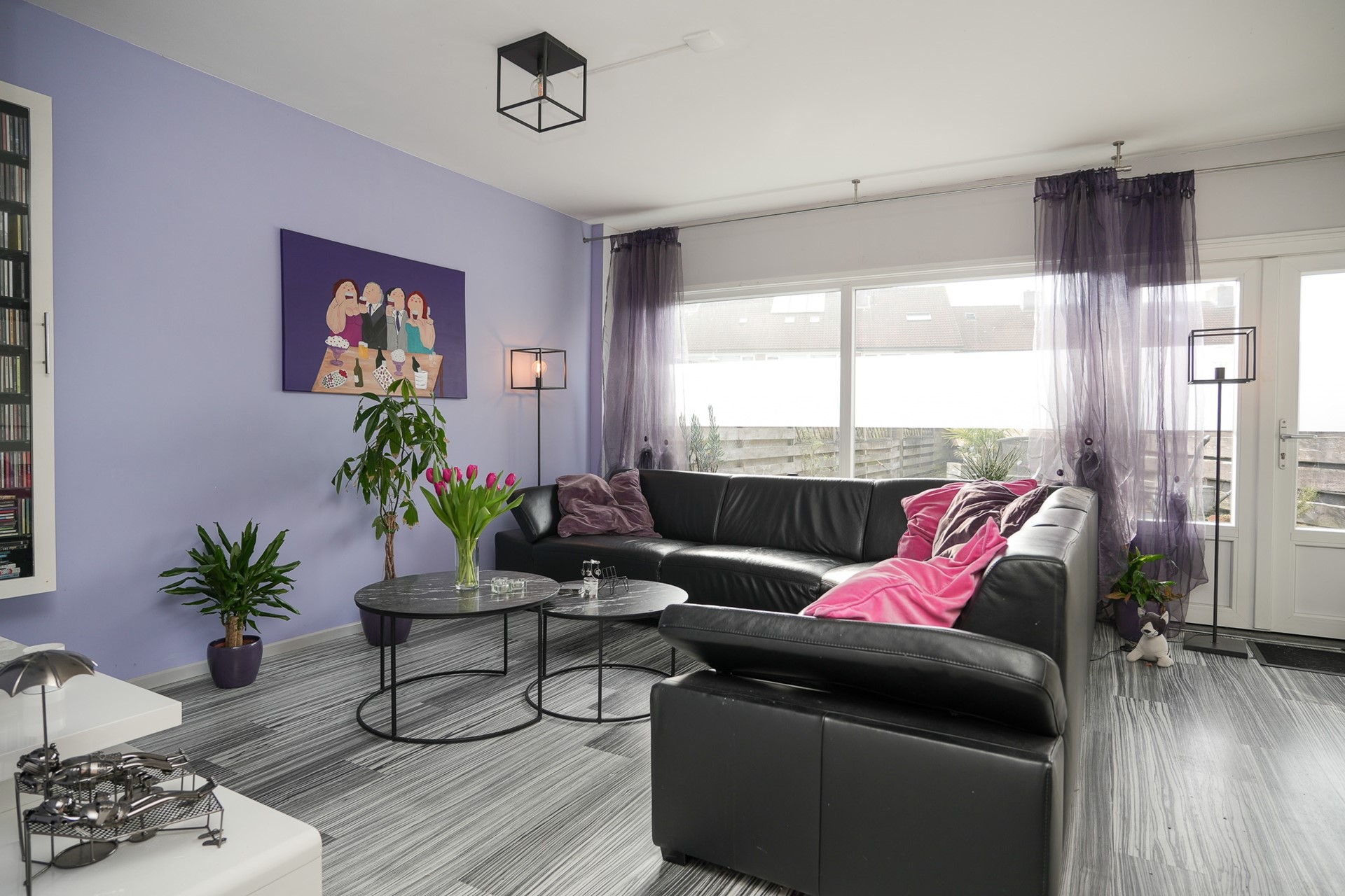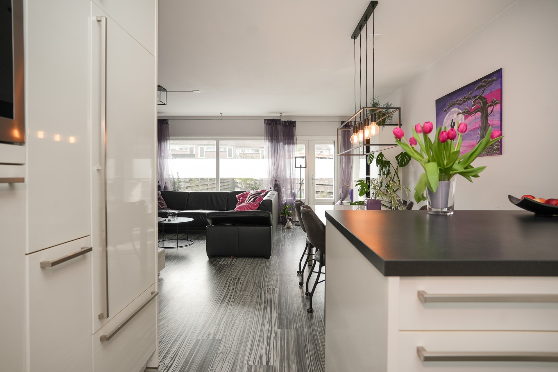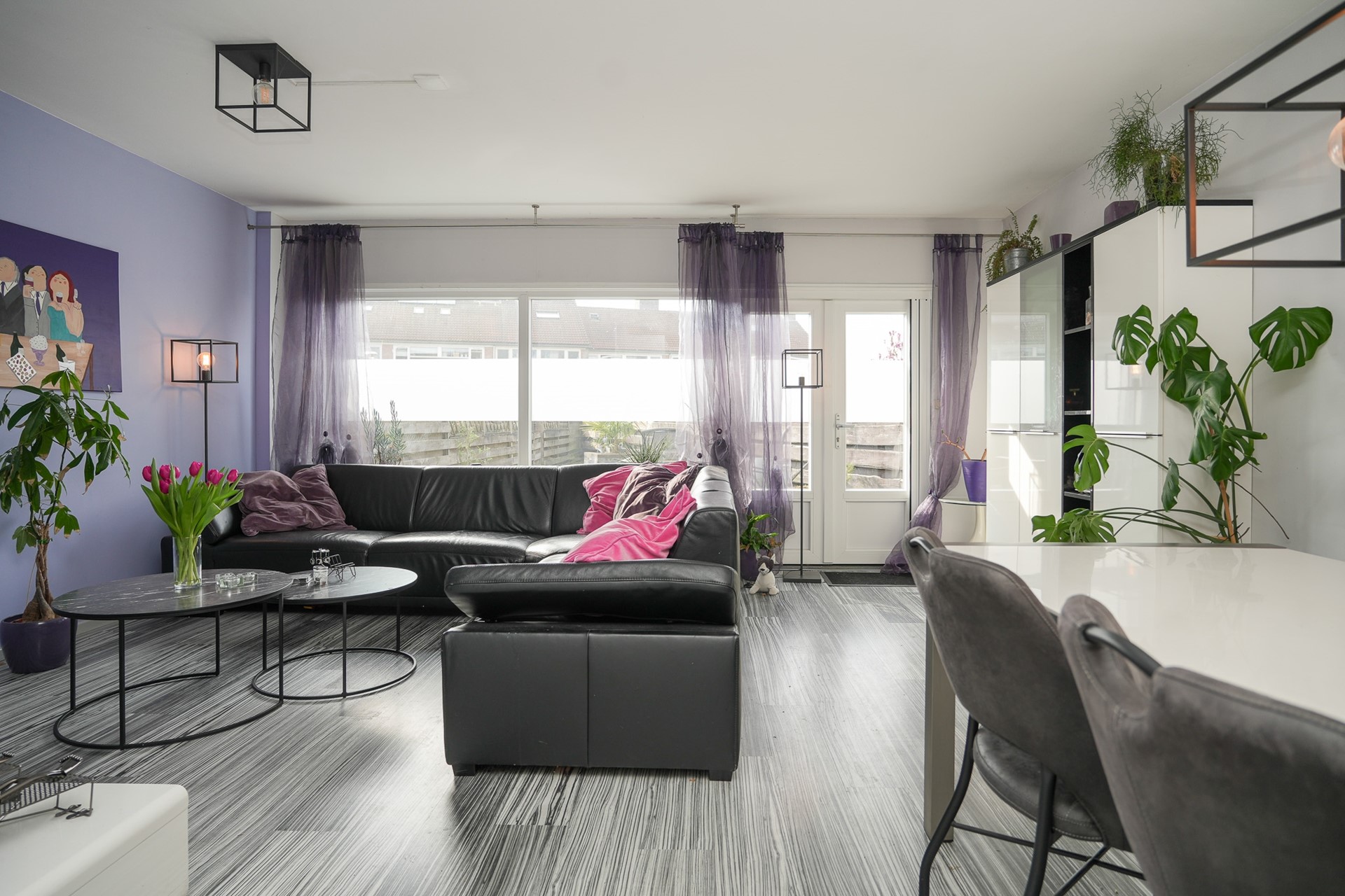 De woonkamer ligt aan de achterzijde en voelt prettig aan. De grote ramen zorgen voor een fijne lichtinval en een mooi zicht op de tuin. Er is voldoende plek voor een royale zit- en eethoek.
