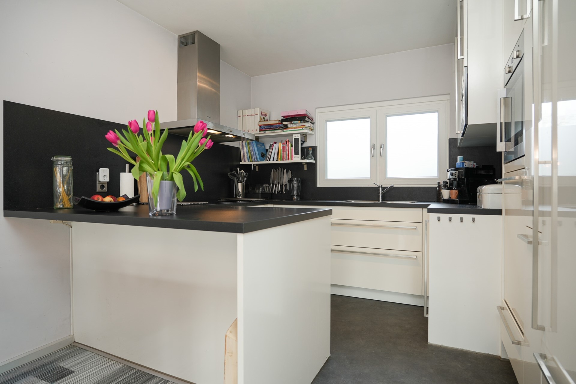 Aan de voorzijde sluit de open keuken aan. Deze is modern uitgevoerd en voorzien van een dubbele spoelbak plus mengkraan, koelkast, magnetron, vaatwasser op hoogte, inductie kookplaat met afzuigkap, veel bergruimte in kastjes en lades, waaronder een Lemans-systeem.