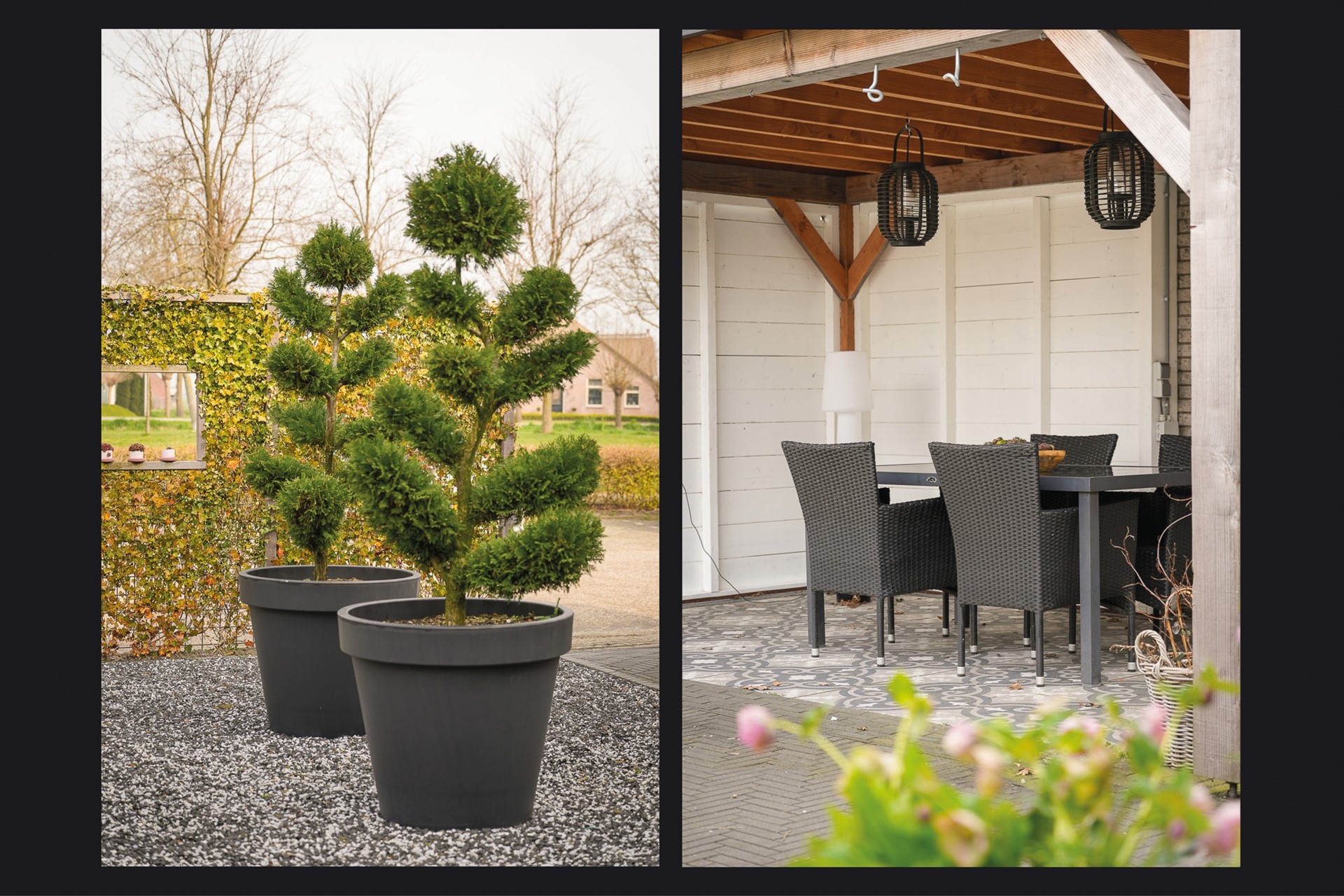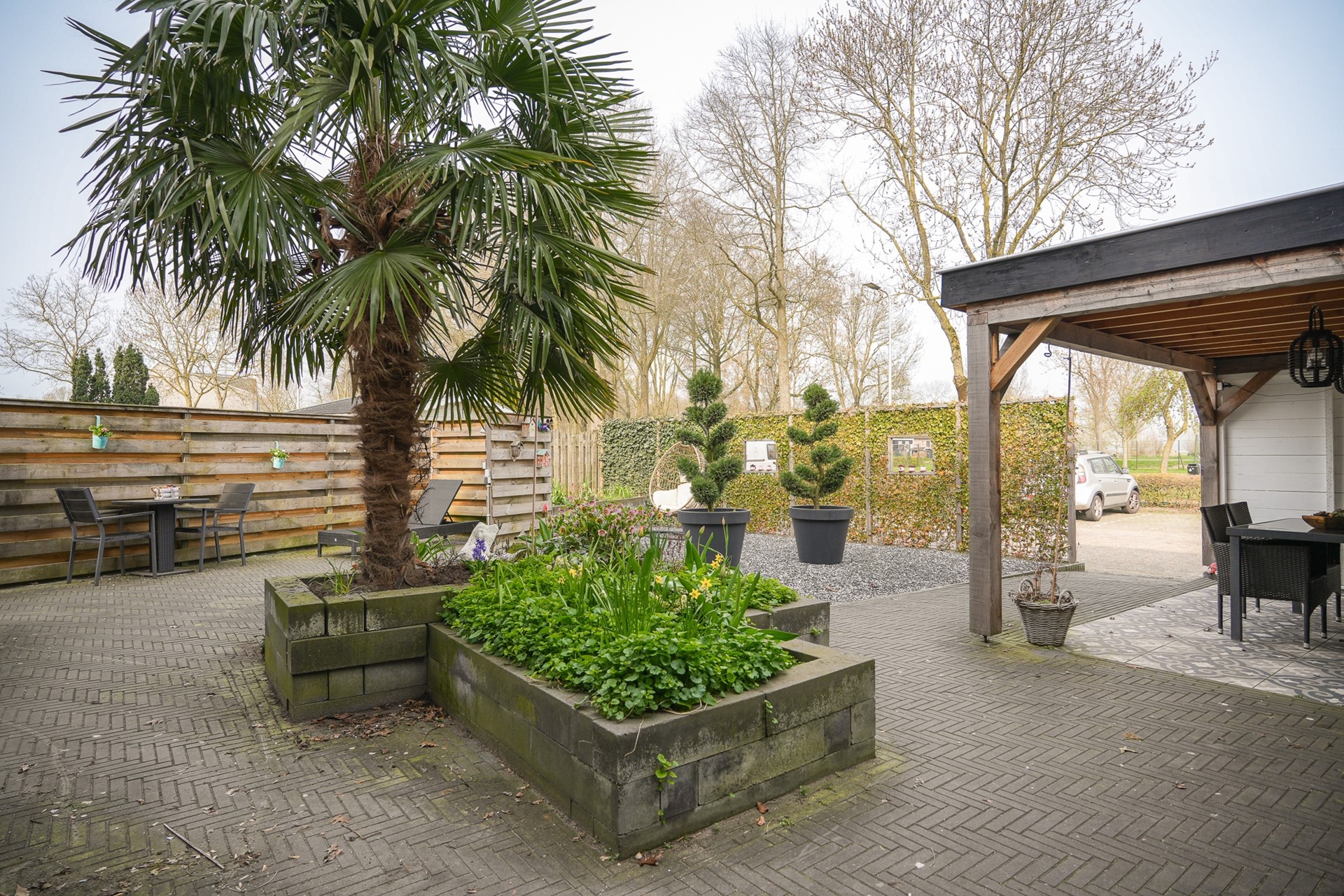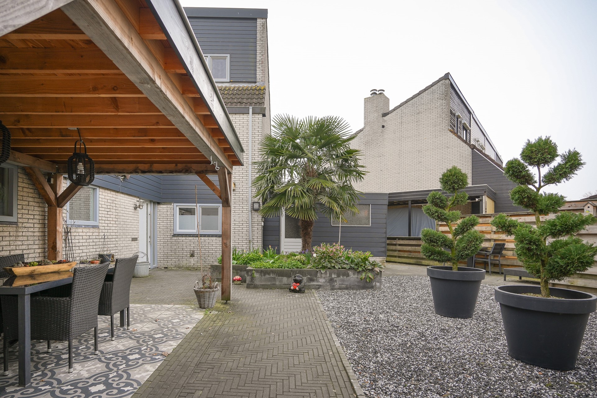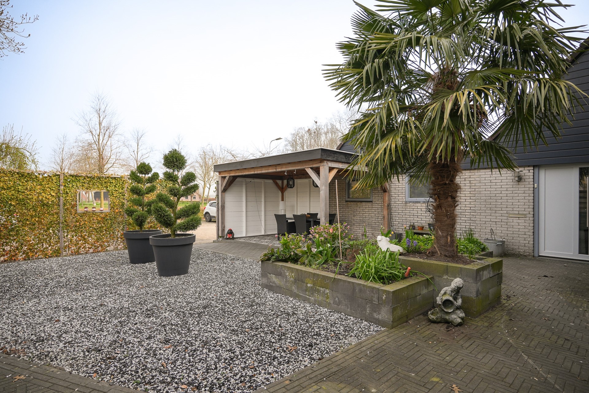 Aan de voorzijde is in 2024 de tuin opnieuw aangelegd en is er een overkapping geplaatst. Hier zit je heerlijk beschut en er is verder in de tuin ook volop ruimte om te genieten.