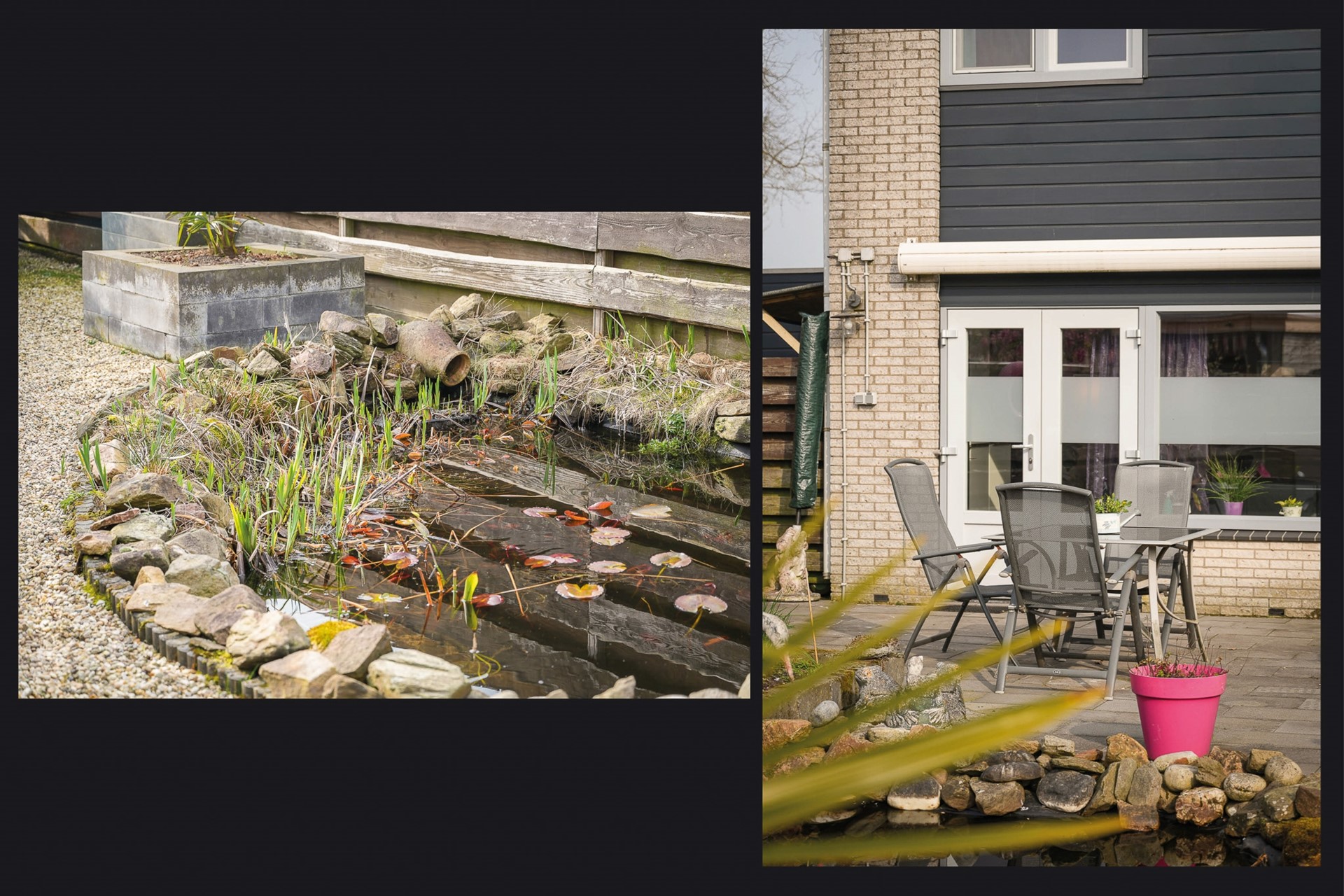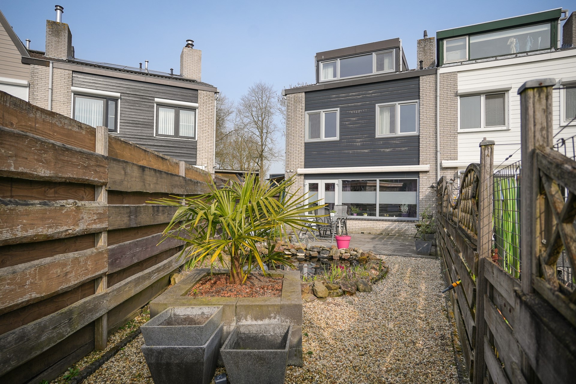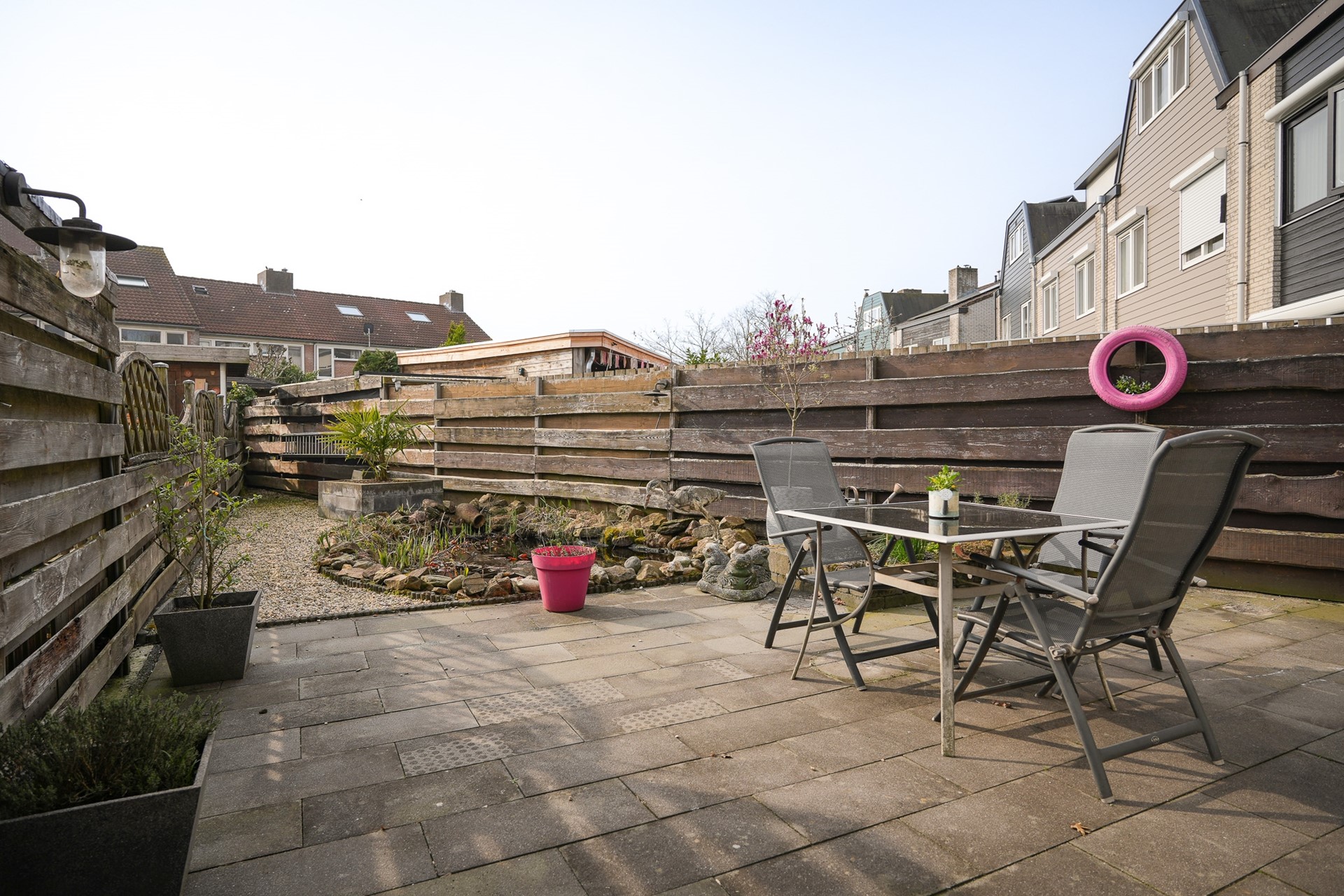 De tuin loopt door langs de zijkant van de woning naar de achtertuin. Hier is nog een terras aanwezig en een vijver. Aan weerszijden bevindt zich een schutting.