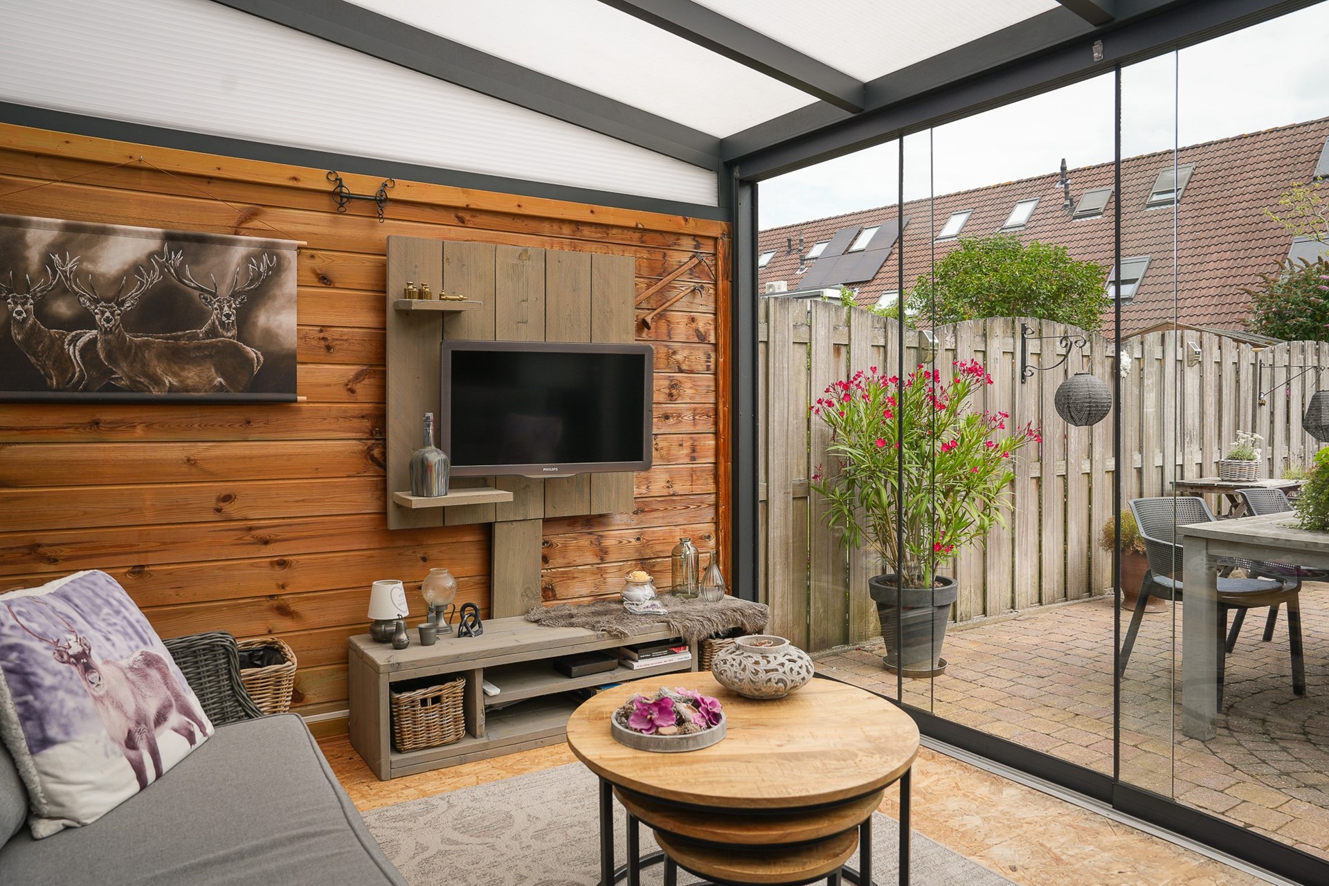 Via de keuken loop je naar een royale serre van glas – een echte aanvulling qua leefruimte. De glazen schuifdeuren kunnen volledig worden geopend, waardoor je ook op frissere dagen een sterk gevoel van buiten ervaart, zonder concessies te doen aan comfort.