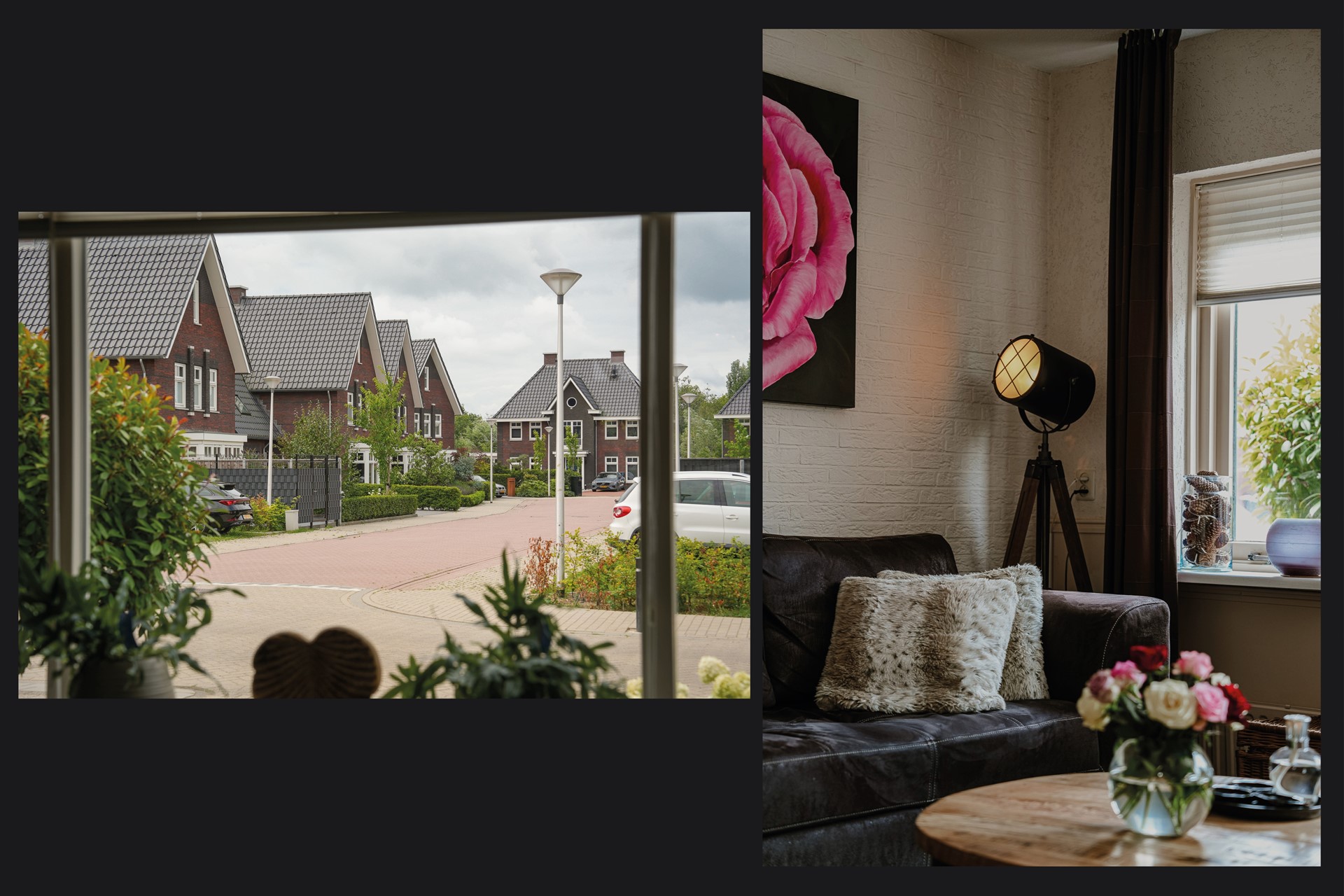 De zithoek kijkt uit over de rustige straat en voelt ruim aan. De eethoek bevindt zich aan de tuinzijde, waar ook de open verbinding naar de keuken is gesitueerd.