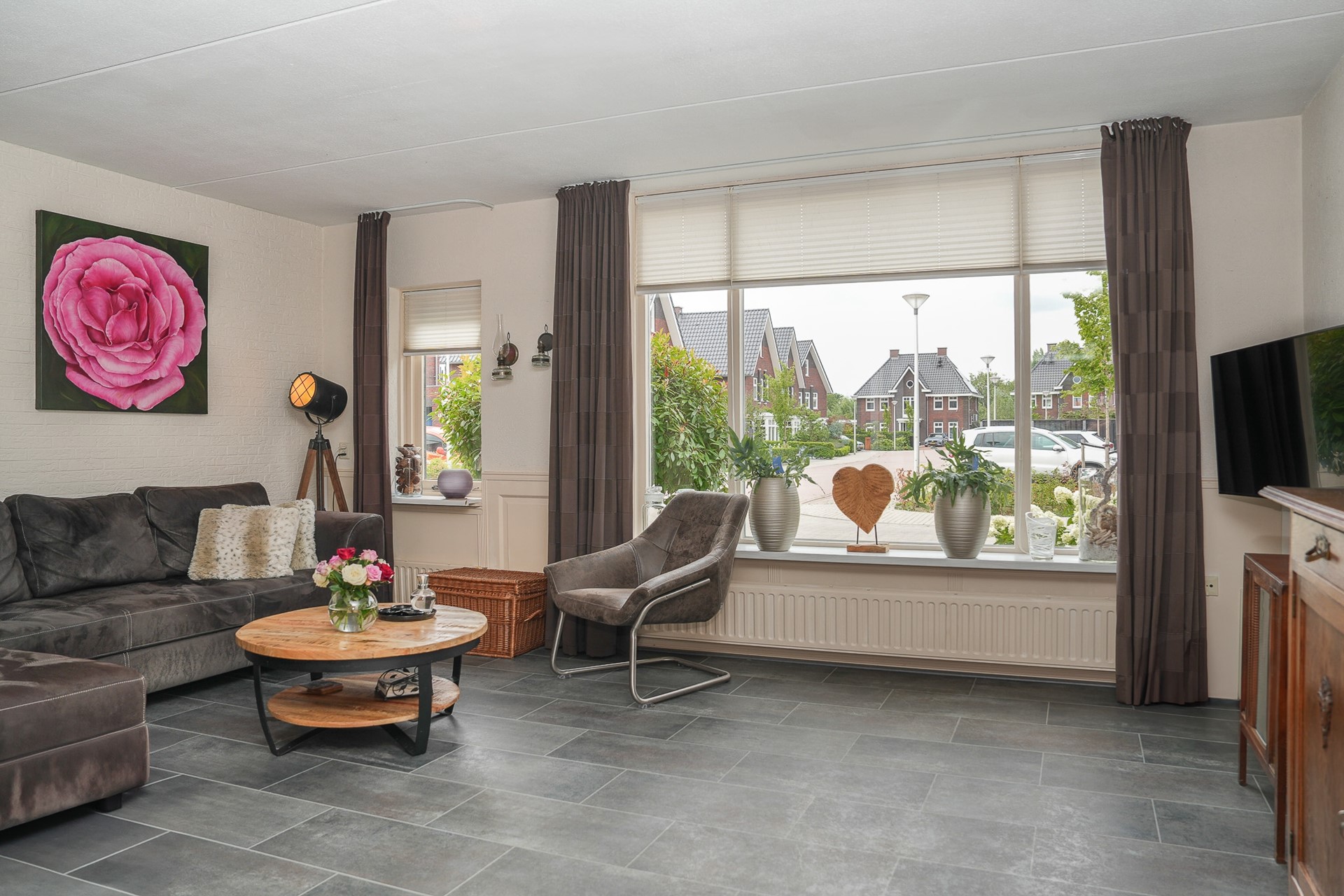 Je komt binnen via de hal, met toegang tot het toilet en de trap naar boven. Vanuit hier stap je de woonkamer binnen, die met zijn brede raampartij aan de voorzijde licht is.
