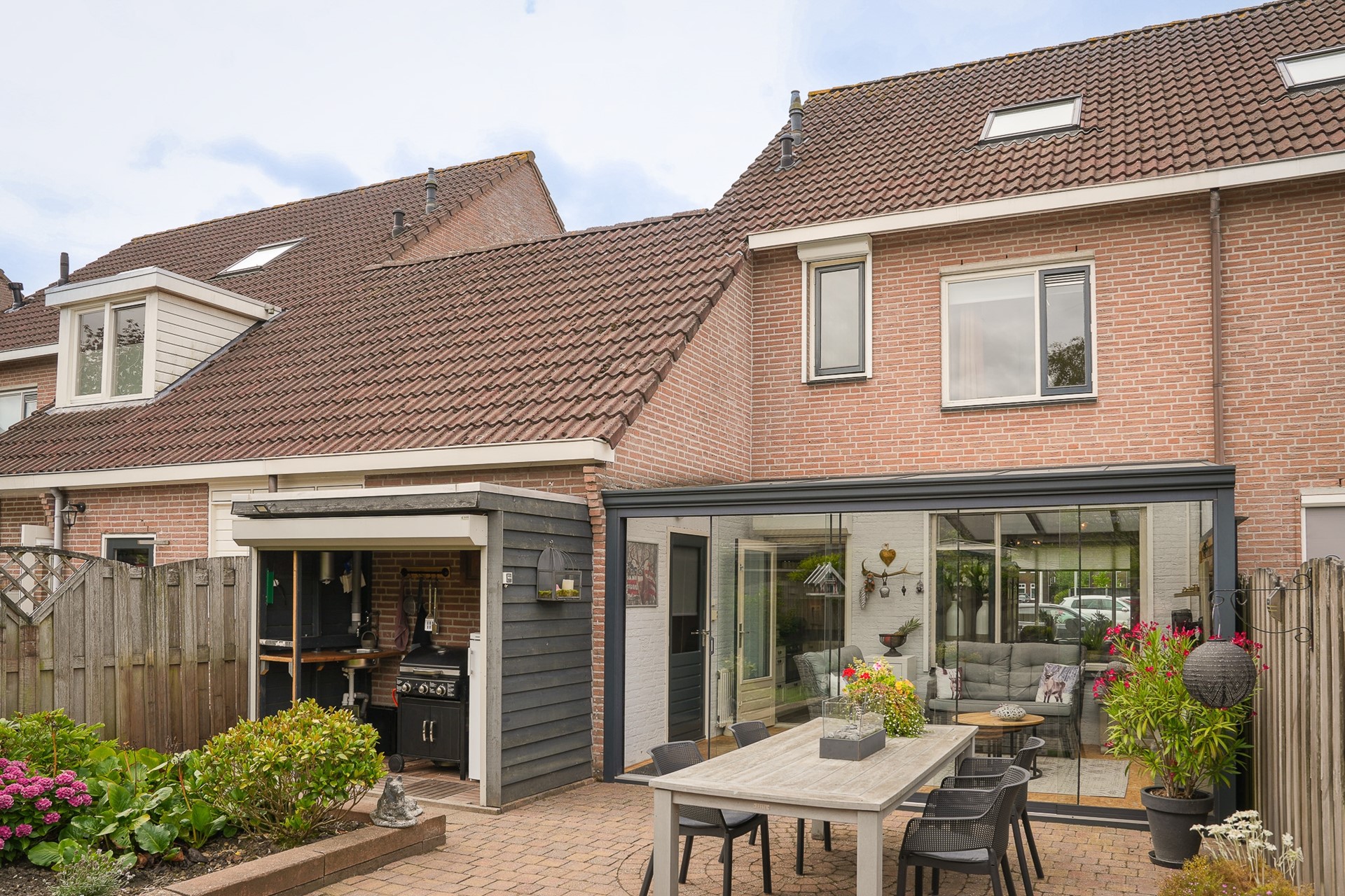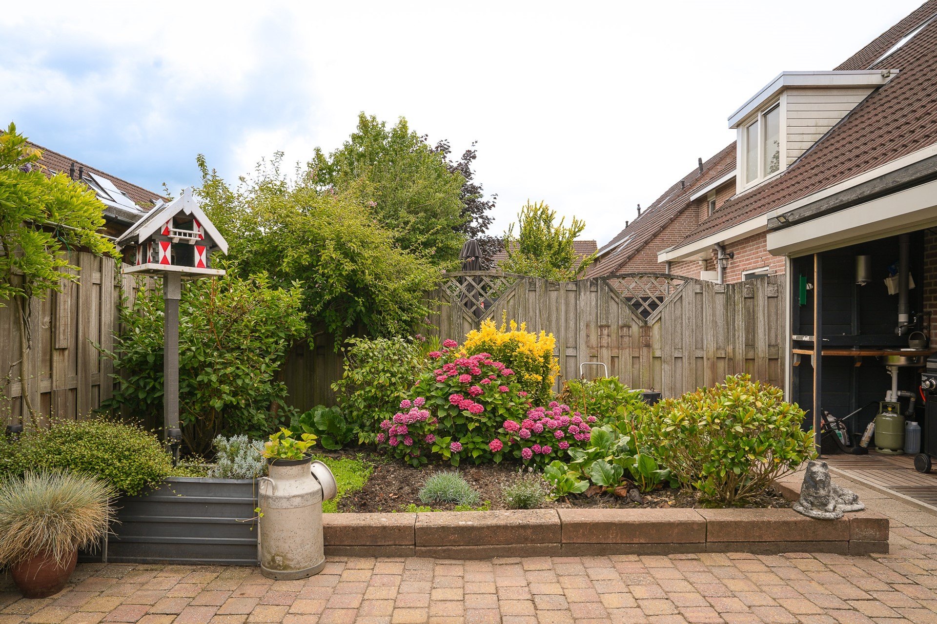 De tuin is verzorgd aangelegd met sierbestrating, kleurrijke beplanting en meerdere plekjes om te zitten.