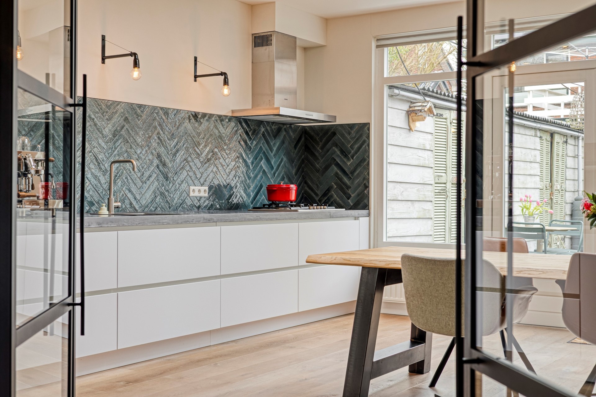 De sfeer is perfect in balans. De houtkachel (ter overname) geeft net dat extra warme accent, al is het (isolatie)comfort in dit huis sowieso al hoog. Via prachtige stalen deuren wordt de ruimte subtiel verdeeld in een voor- en achterkamer, met een mooie houten vloer die alles verbindt.